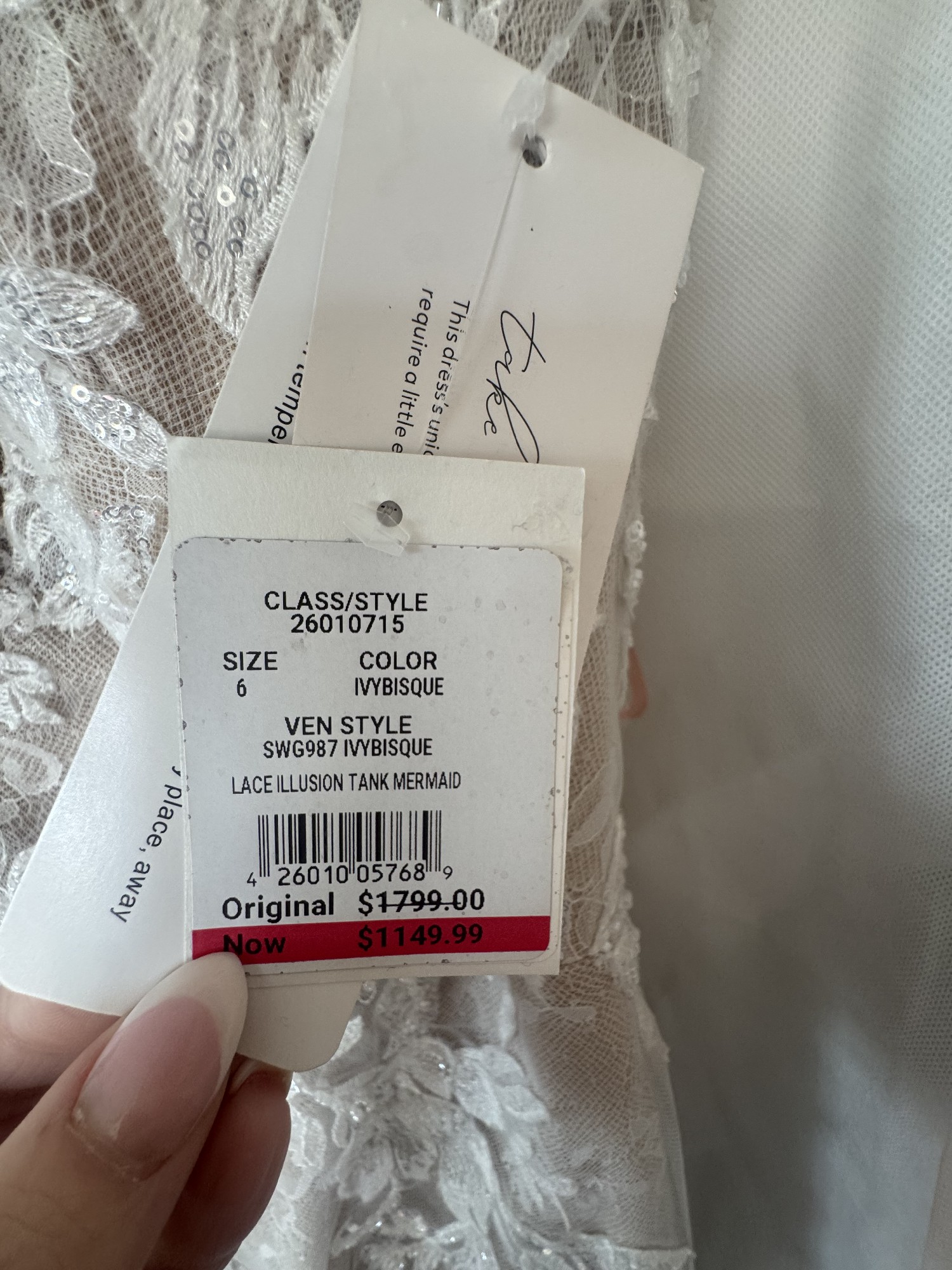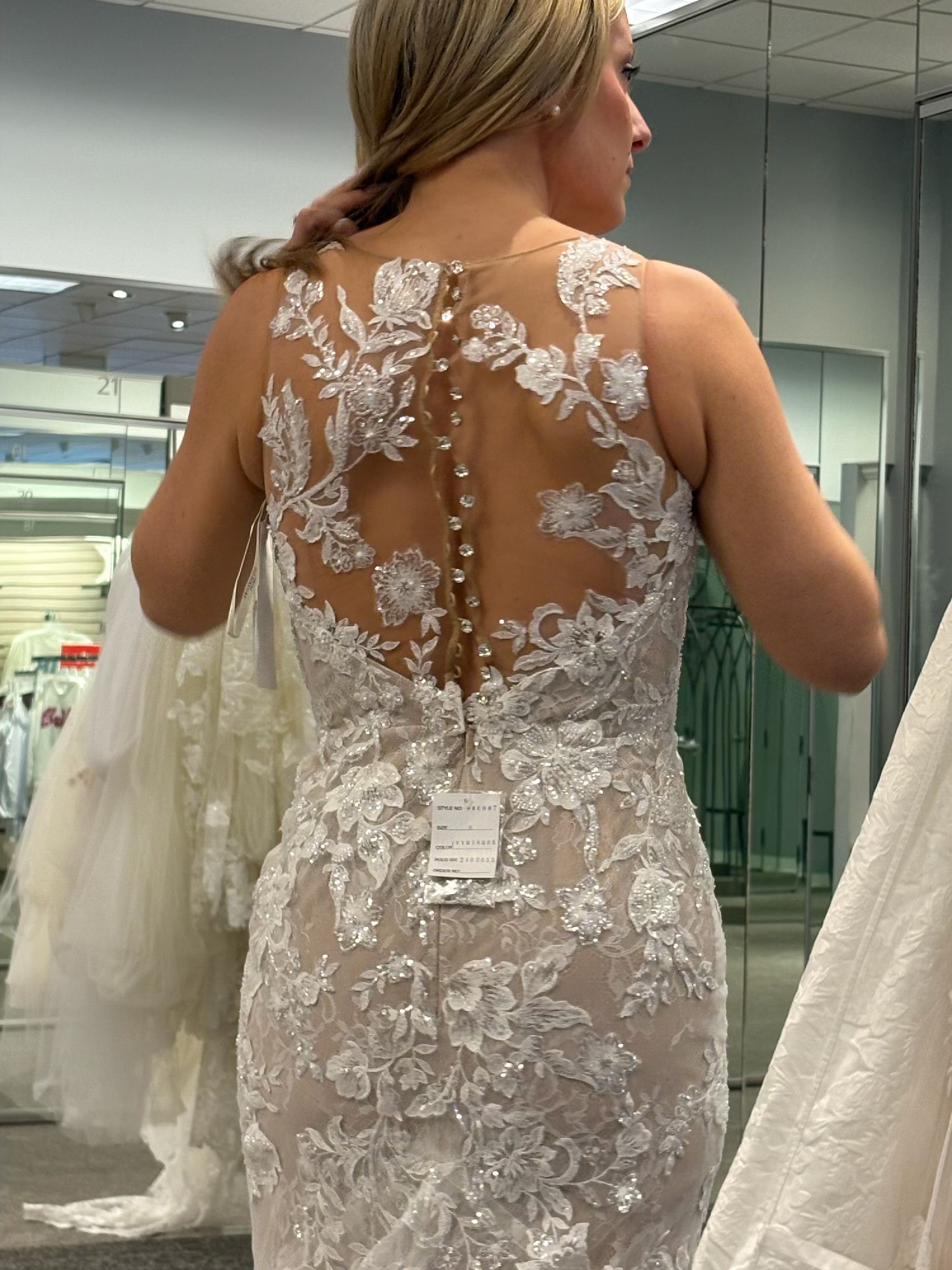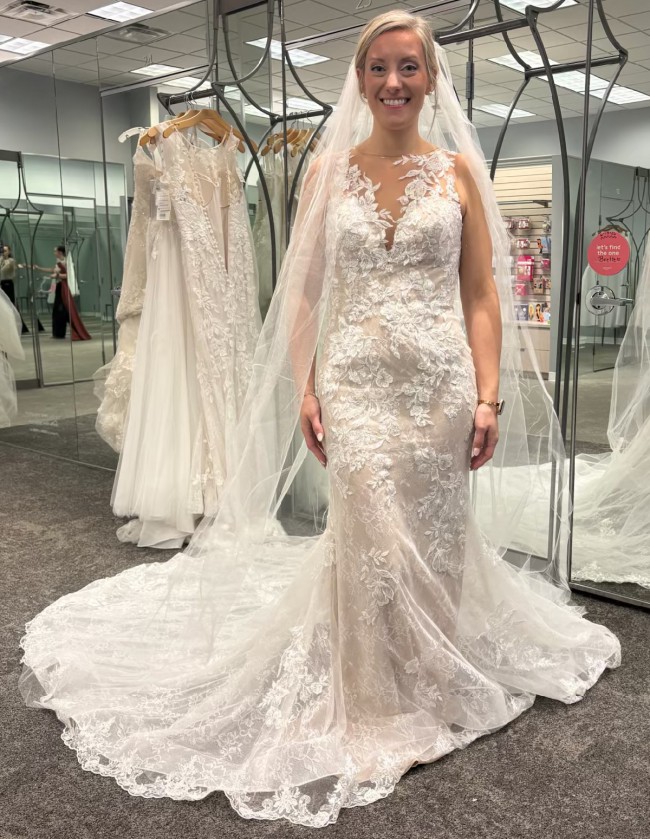 This breathtaking Galina Signature dress. I bought 2 dresses and ended up with the other so this is new, never worn. As a perfect size 6, this fit-and-flare silhouette beautifully hugged my curves while creating a stunningly flattering shape. The sheer neckline adds a touch of elegance and allure, making it ideal for a romantic celebration.