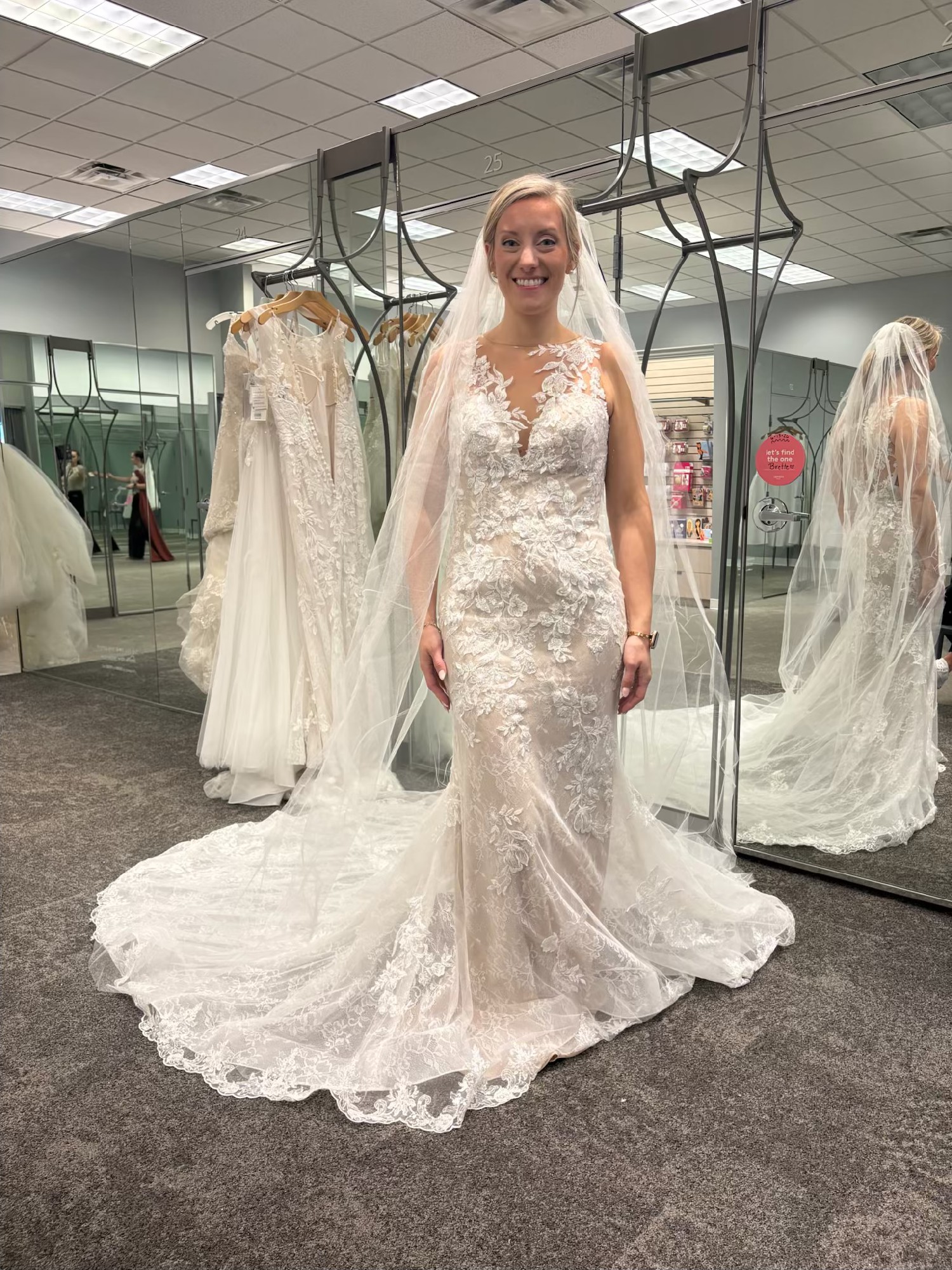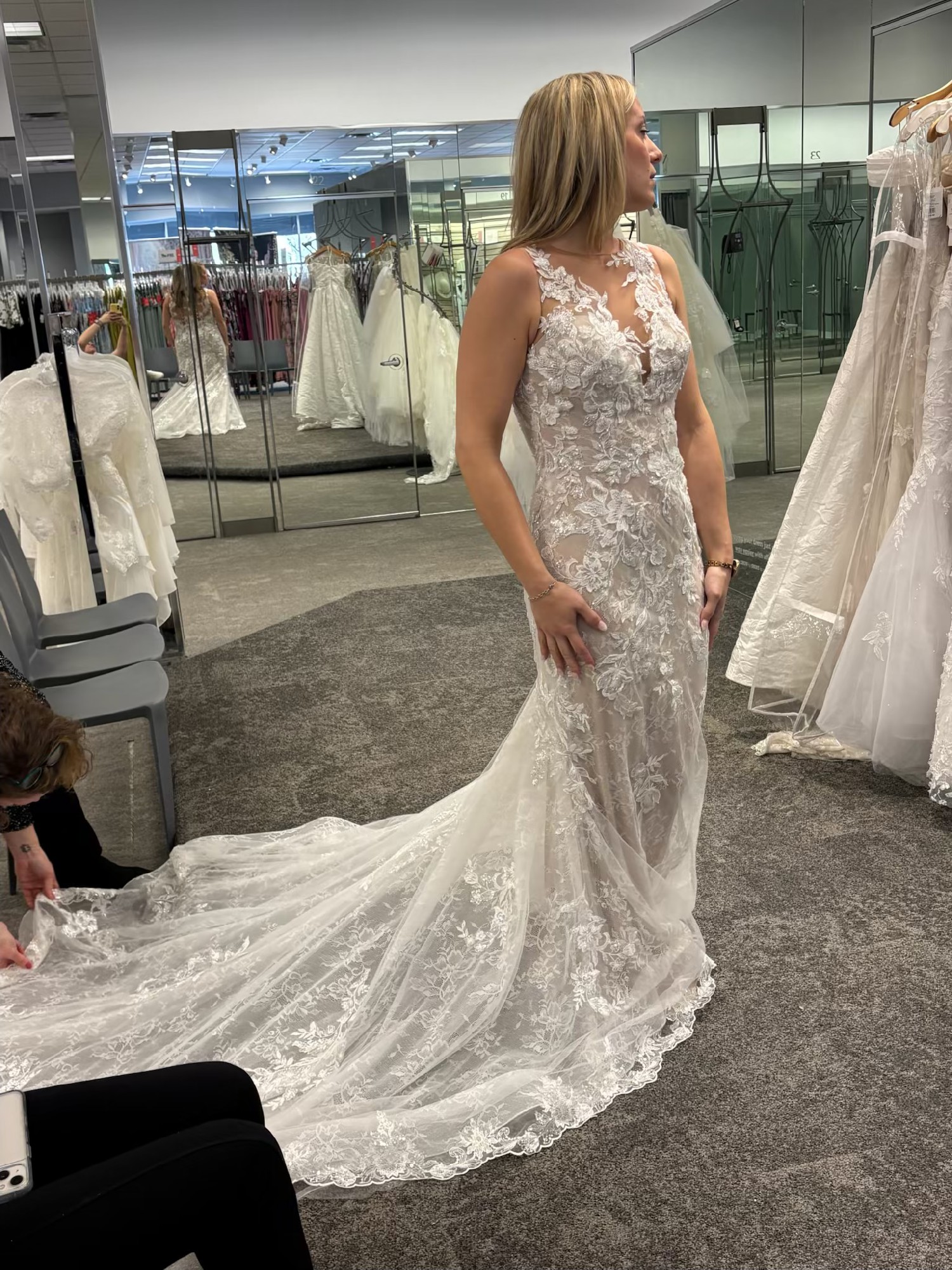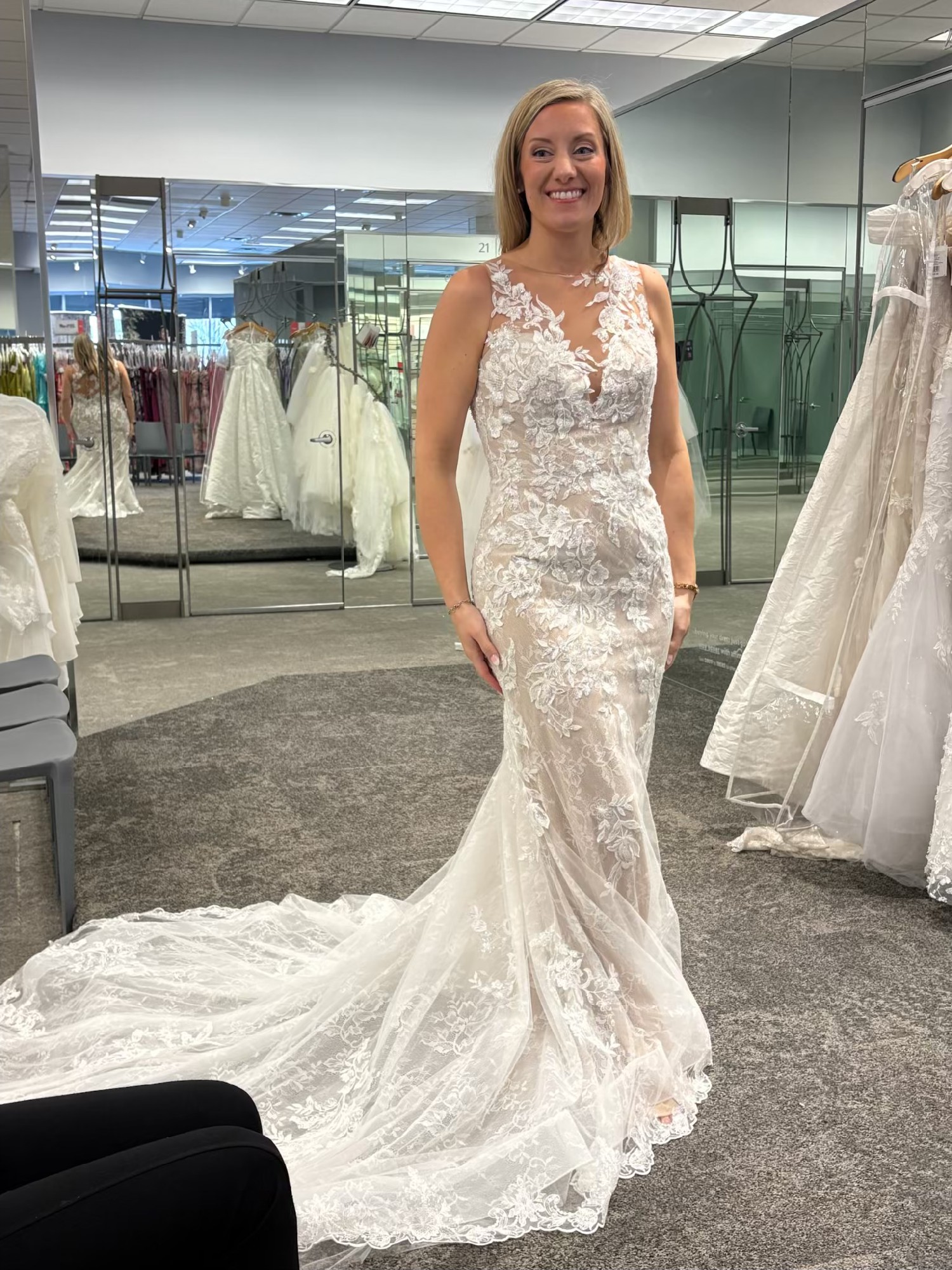 This breathtaking Galina Signature dress. I bought 2 dresses and ended up with the other so this is new, never worn. As a perfect size 6, this fit-and-flare silhouette beautifully hugged my curves while creating a stunningly flattering shape. The sheer neckline adds a touch of elegance and allure, making it ideal for a romantic celebration.