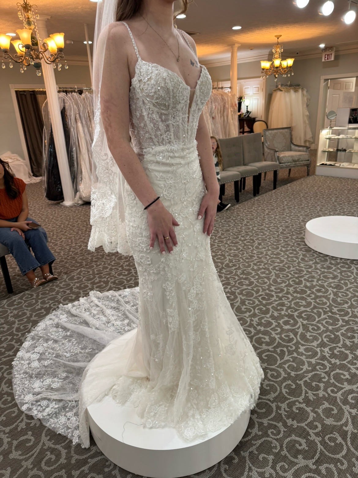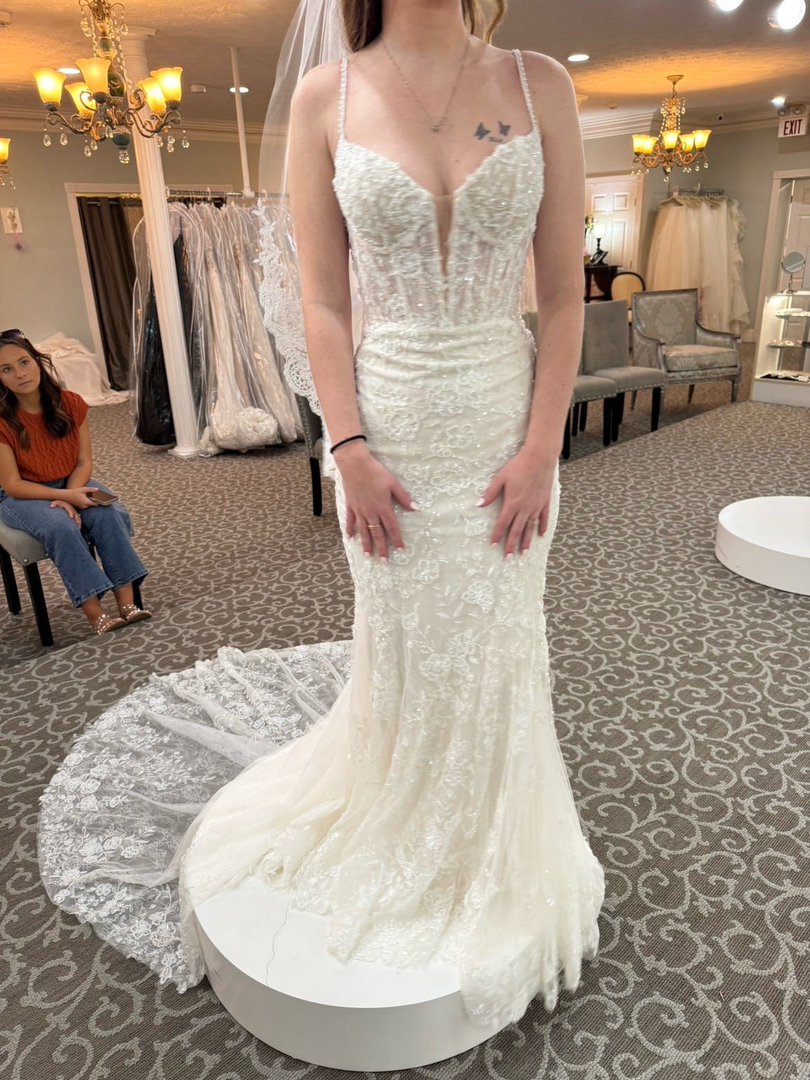 Adorned with exquisite beading, shimmering crystals, and delicate sequins, the ivory color glows softly in the light, making you a vision of radiance as you walk down the aisle. The backless design adds a touch of daring sensuality, perfect for showcasing your exquisite taste and making a memorable statement. The subtle spaghetti straps provide both support and style, allowing for ease of movement while celebrating your every step.