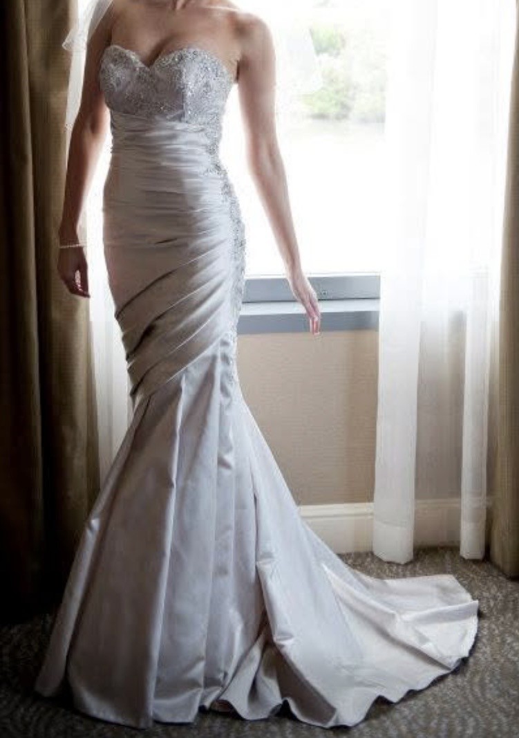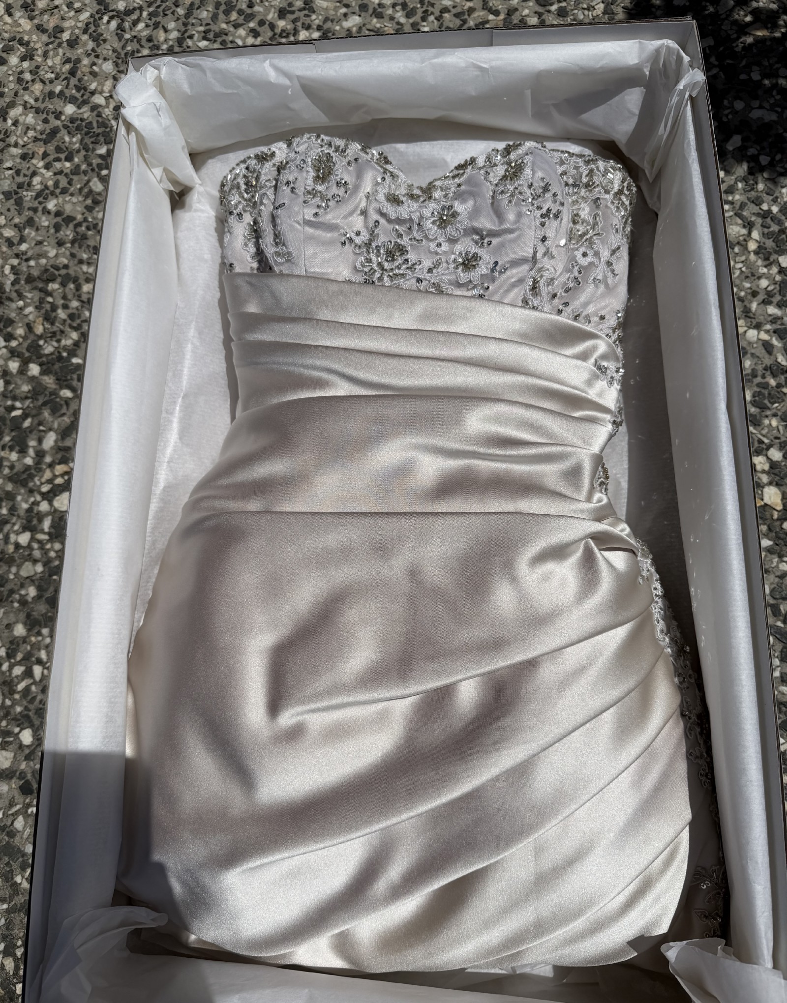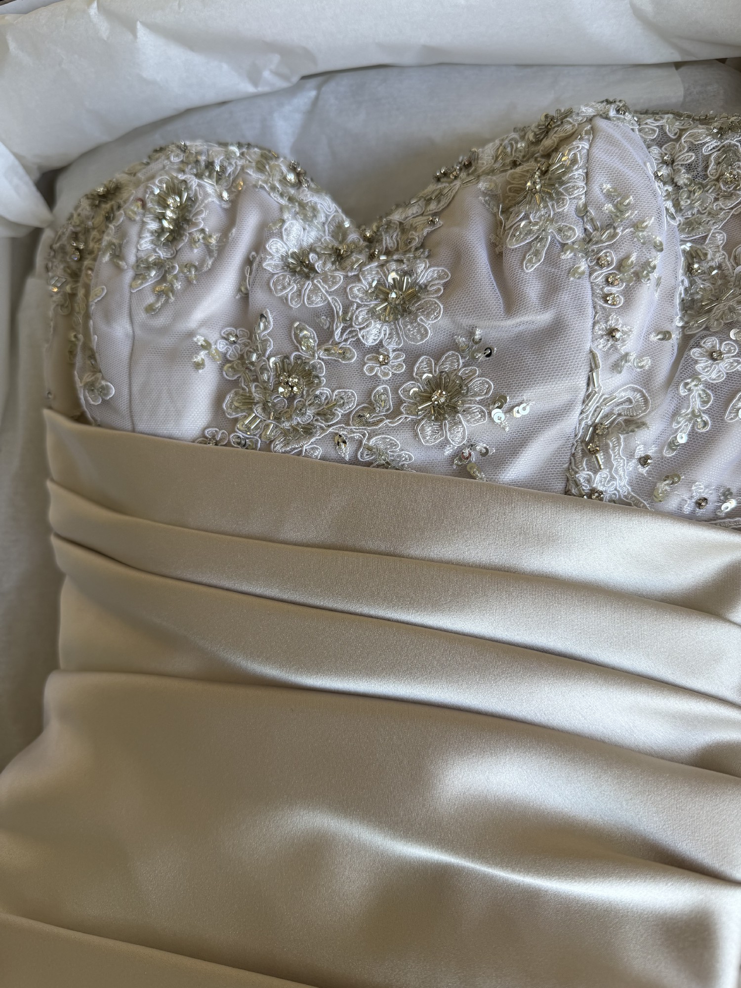 Stunning one-off couture champagne silk and French lace & crystal embroidery gown. Premium dry clean and display boxed since wedding