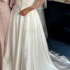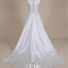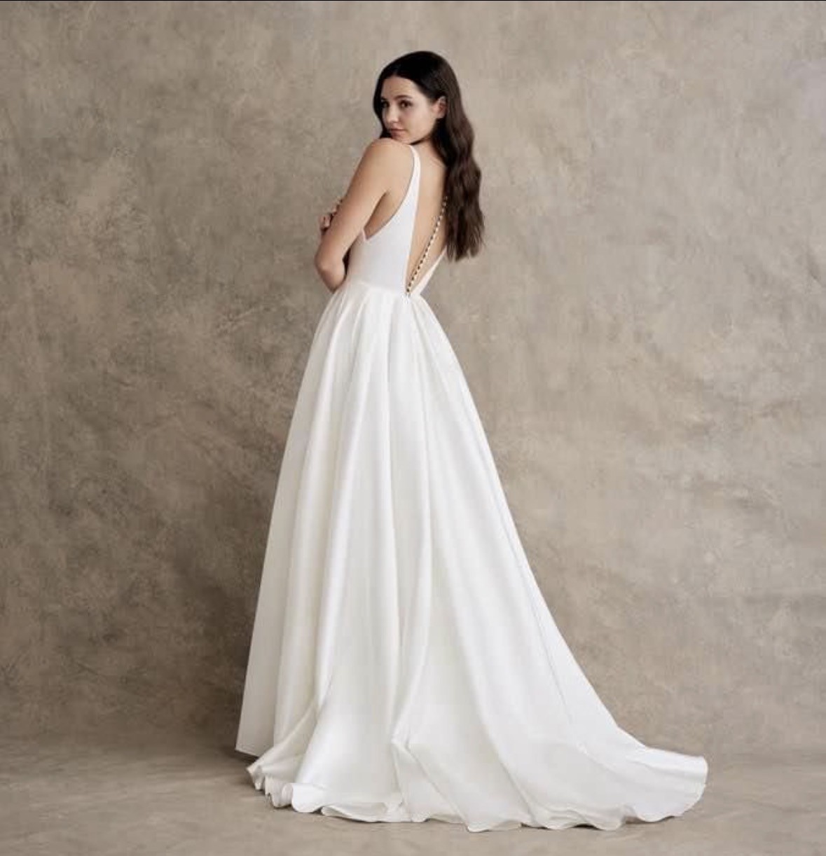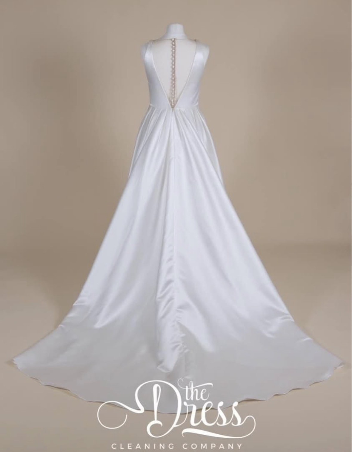 It features a comfortable structured bodice that provides the perfect fit, a gorgeous train with buttons running the whole way down, and a deep V back with delicate mesh and button detailing.