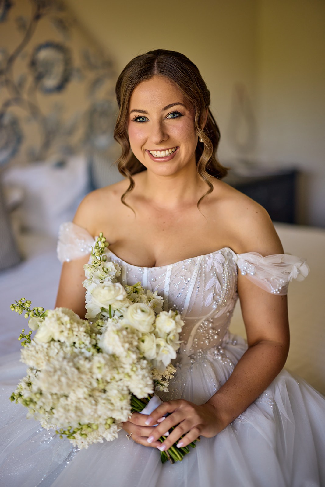 The enchanting floor-length design boasts intricate 3D flowers, shimmering beading, and elegant pearls that add a touch of sparkle and sophistication. The mid-back provides just the right amount of support and style, ensuring you feel secure as you celebrate and dance the night away.
