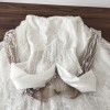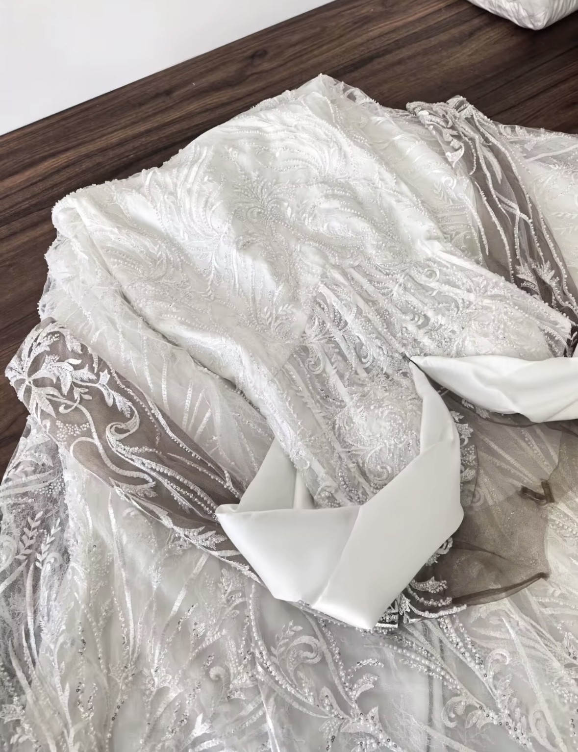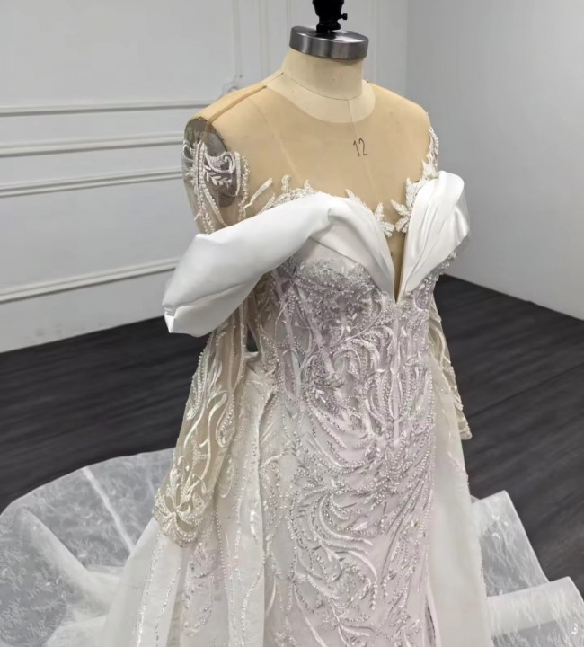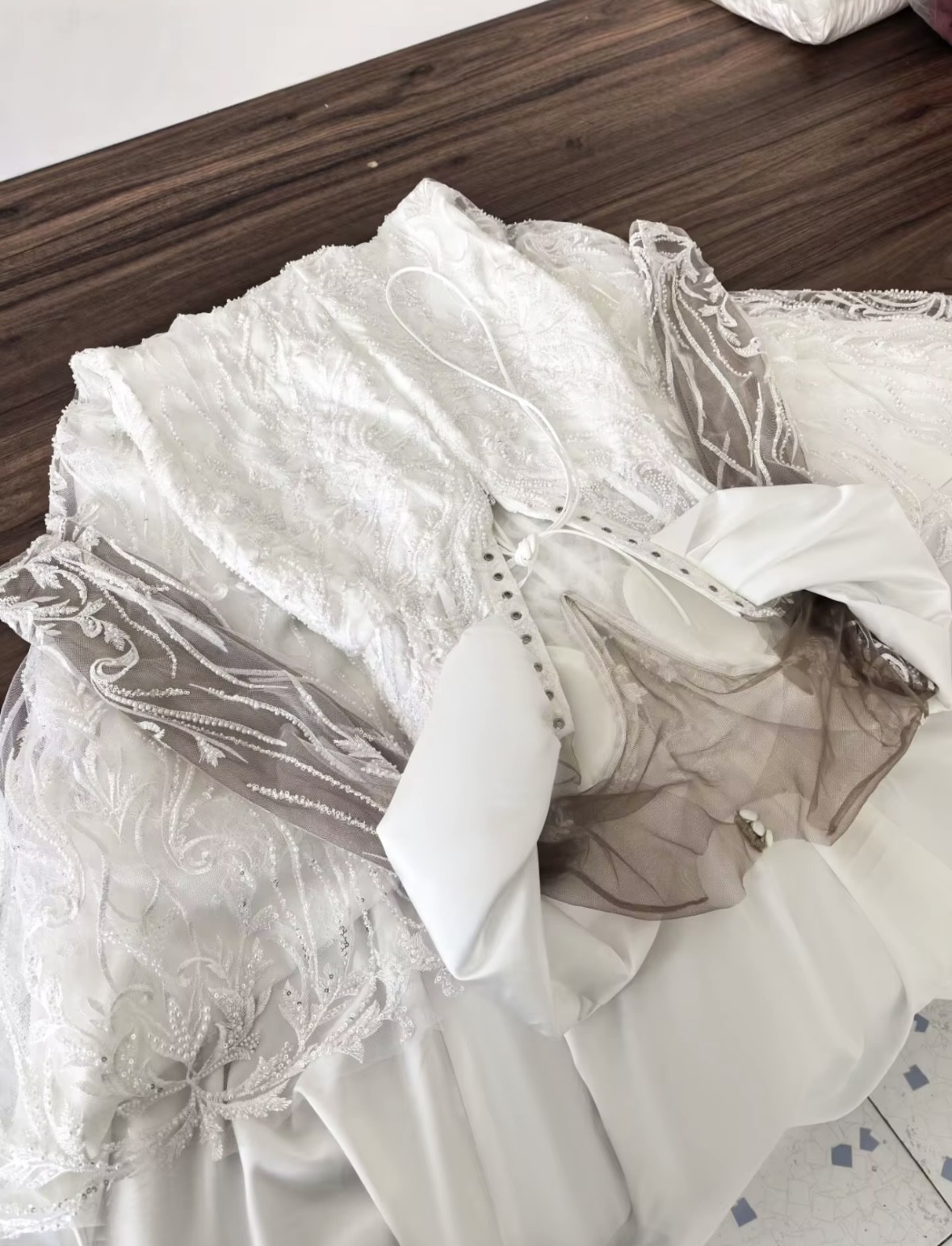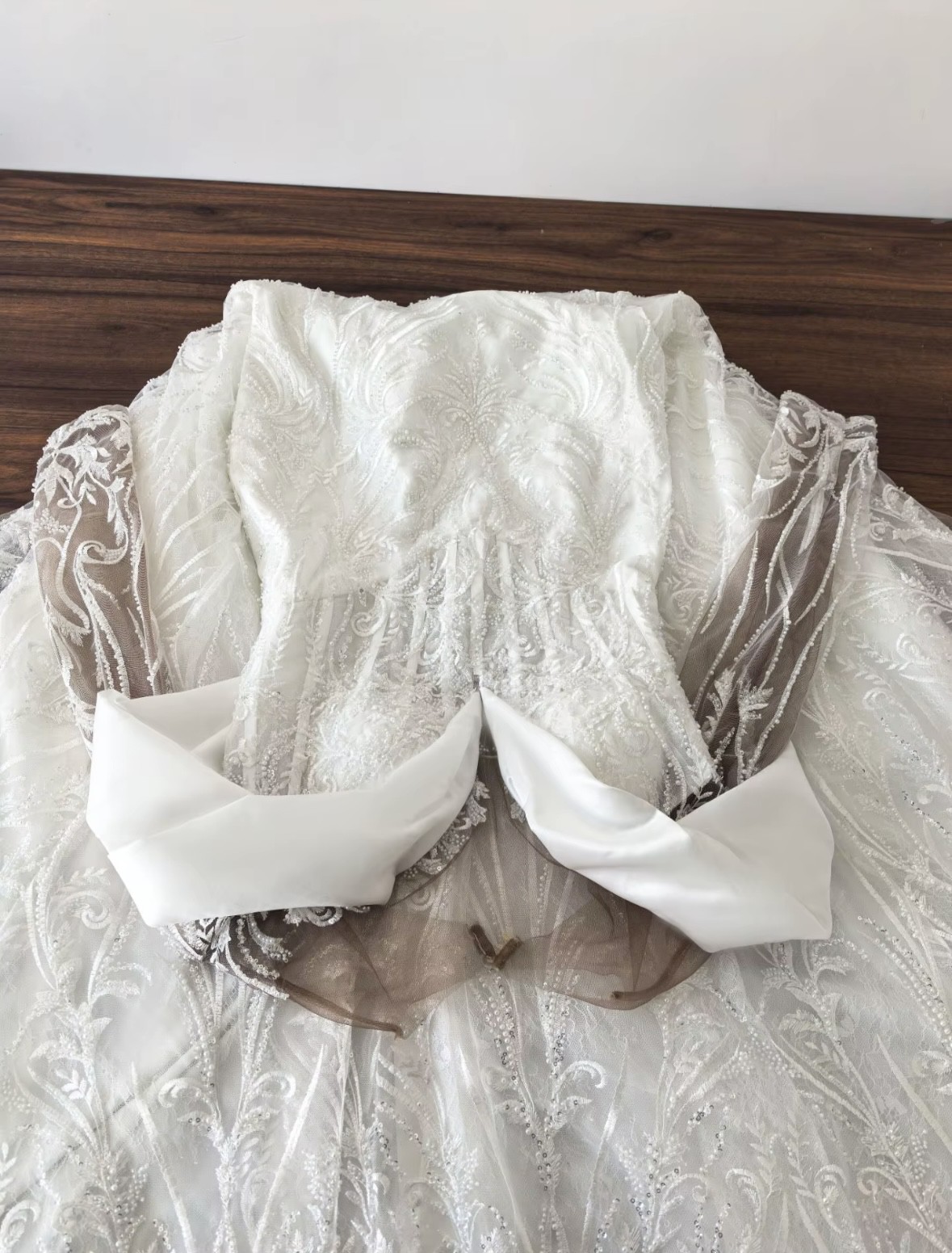 Custom made dress that I got as a backup because my original dress was going to be delivered 2 weeks before my wedding. Has not been worn except to try it on. It comes with the skirt as well! Has a about 3 super tiny tears in sleeves while trying on but won’t cost over $100 to fix. Willing to negotiate. Overall it is a gorgeous dress. 🥰