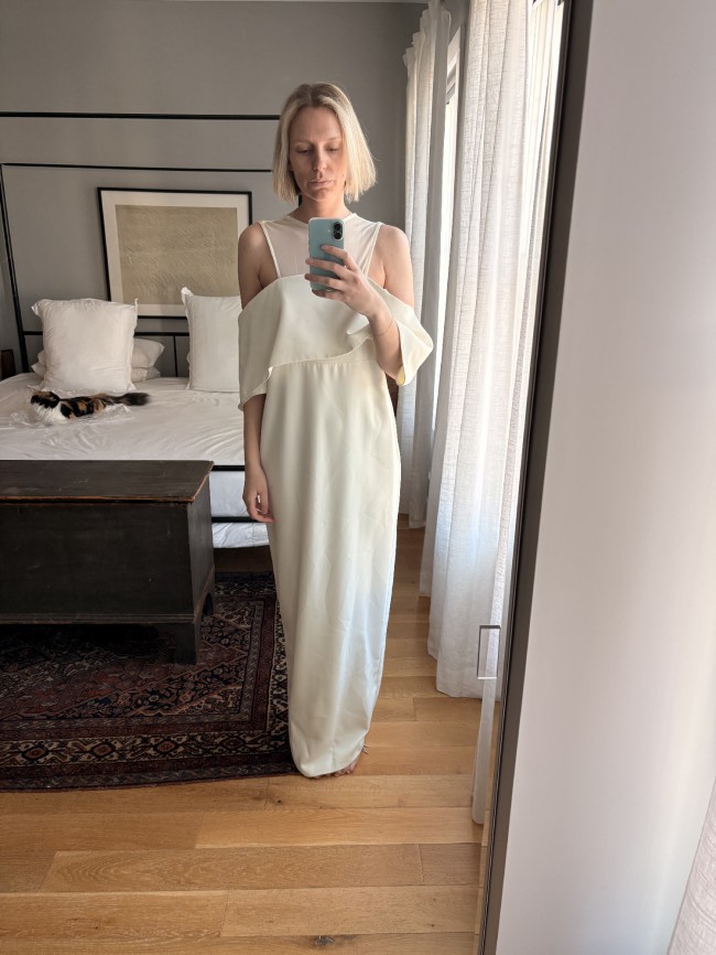 - Very small, light makeup stain on front of dress below right hip (see pictures)