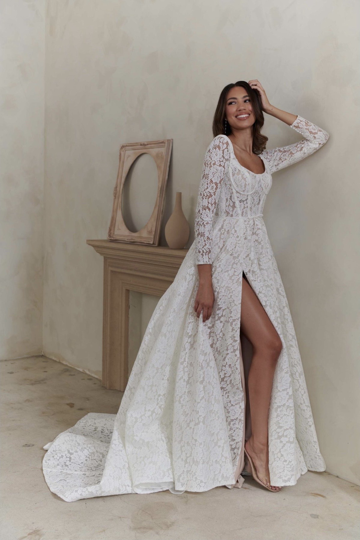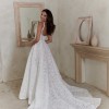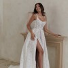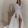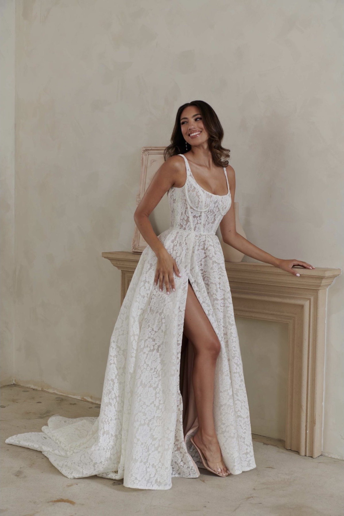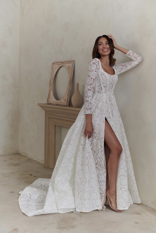 A-line lace wedding dress with side leg slit.