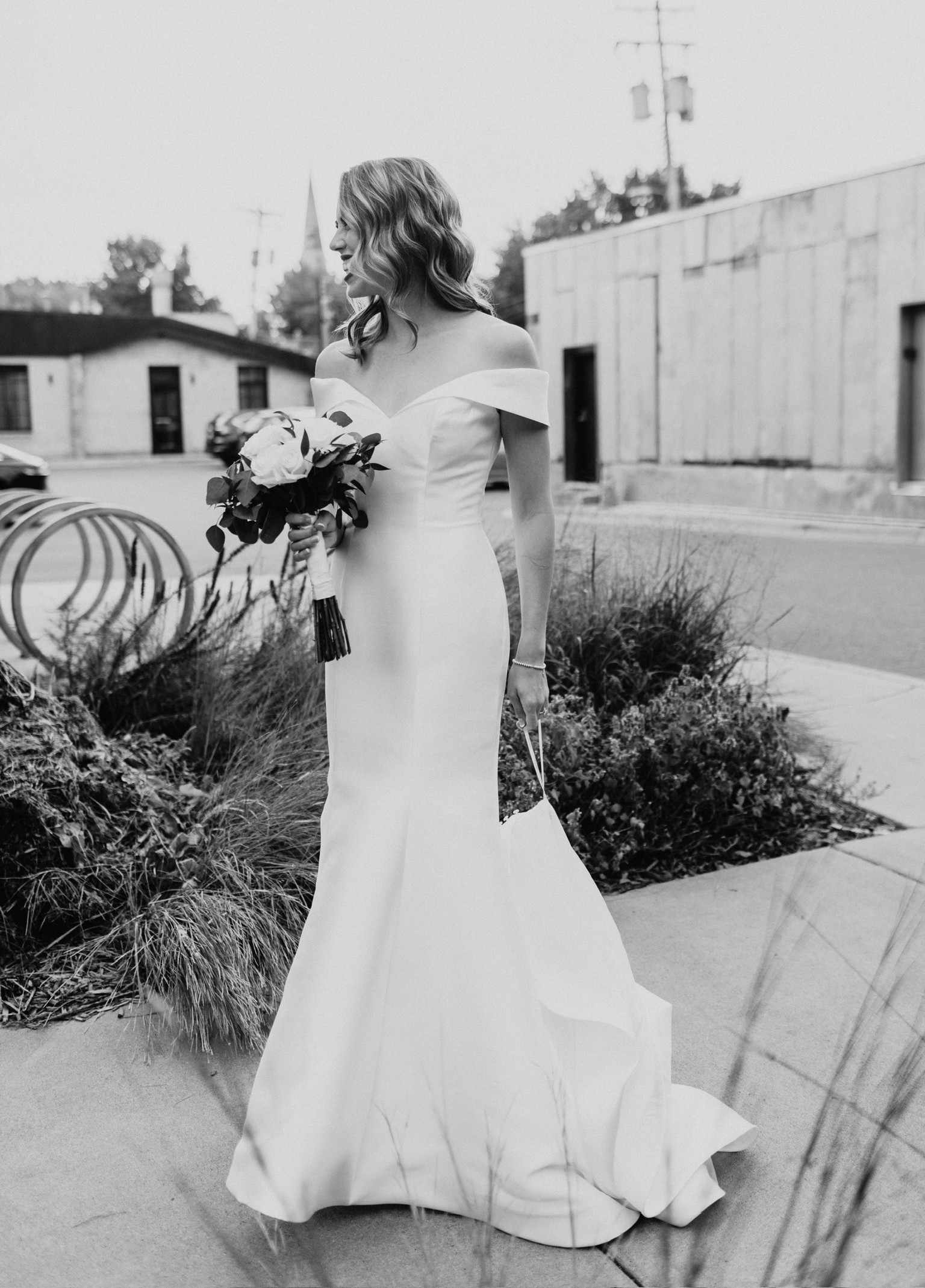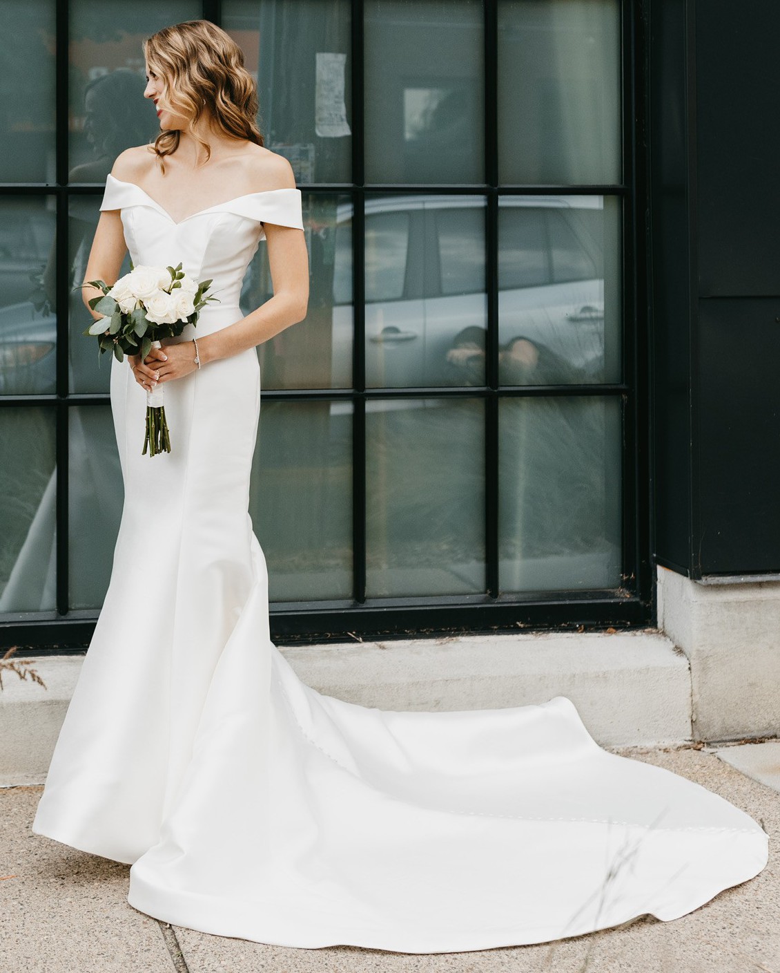 This elegant off-shoulder wedding dress is perfect for your special day. The classic ivory dress adds a timeless touch to your bridal look. I absolutely loved it for our big day, and I hope another bride can enjoy a special day in such a stunning dress.