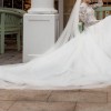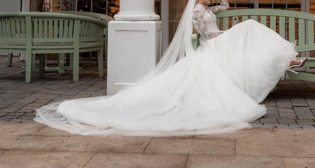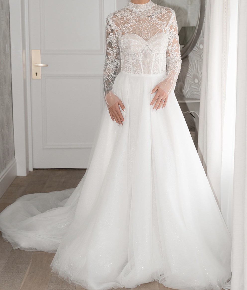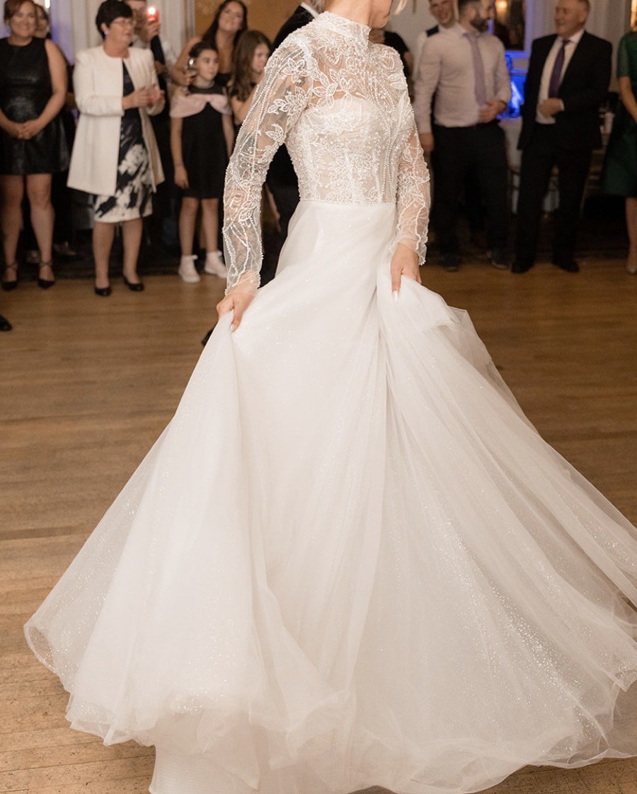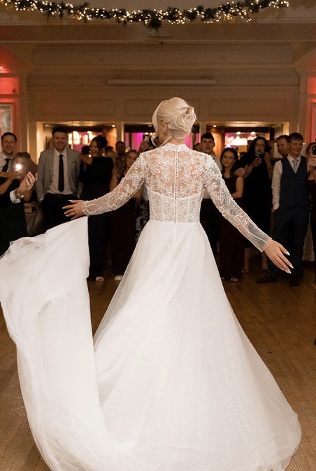 “My wedding dress was elegant, timeless and so romantic. It featured a beautifully fitted bodice with delicate floral lace detailing, long sheer sleeves and a high neckline that gave it such a classy, sophisticated look. The skirt flowed out into a soft A-line shape with layers of dreamy tulle and some sparkle that caught the light as I moved. It felt light, graceful and effortless to wear, and I honestly felt like a princess the whole day.”