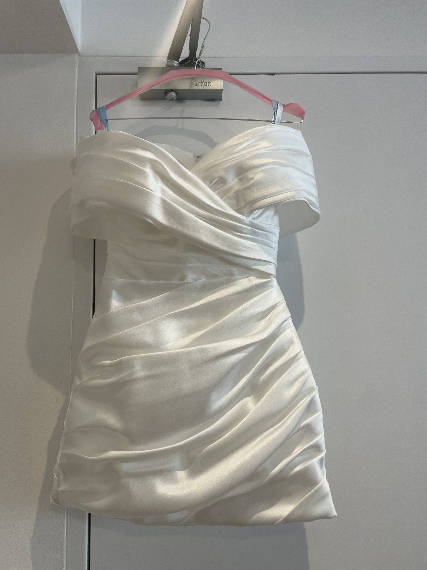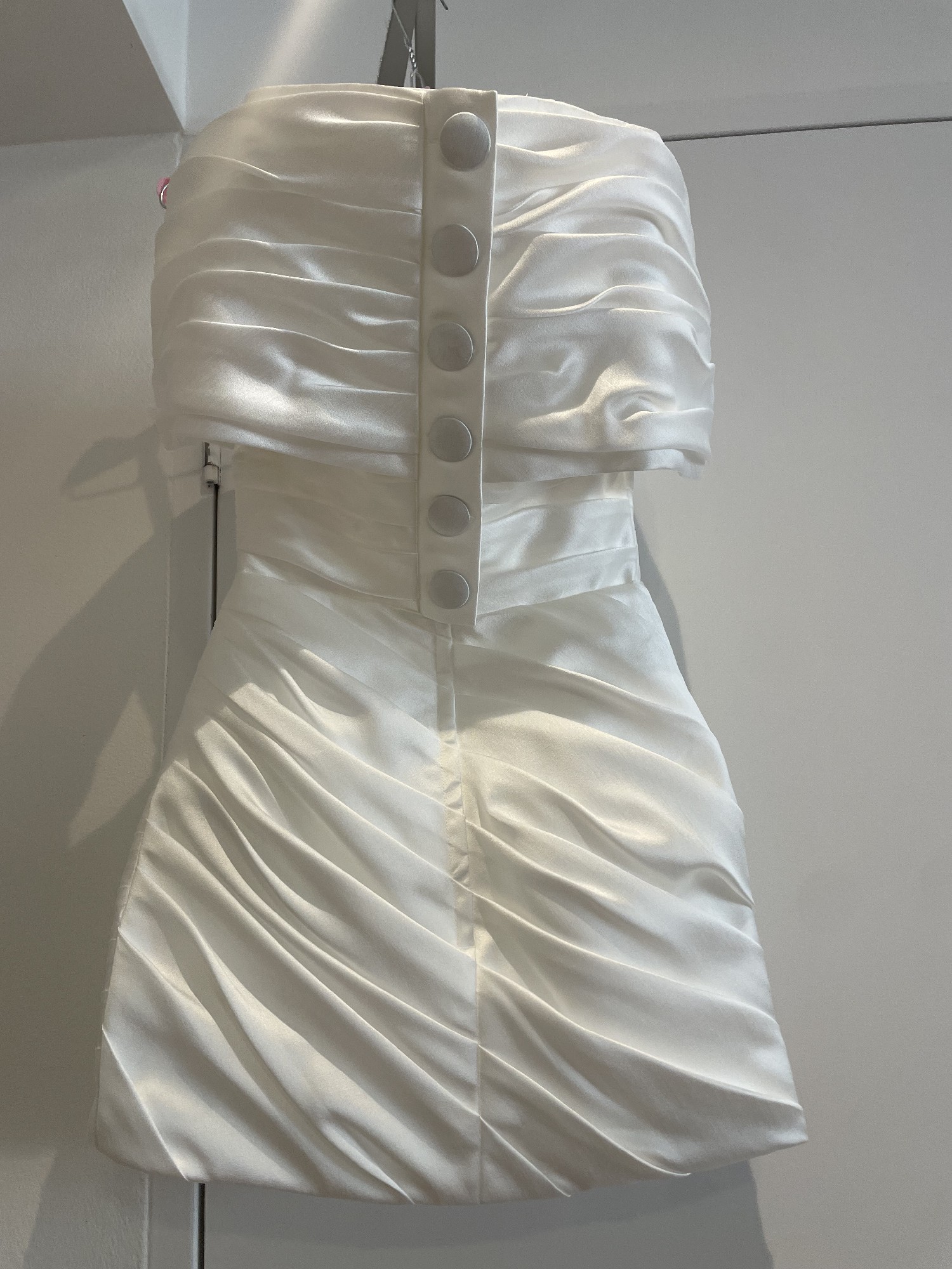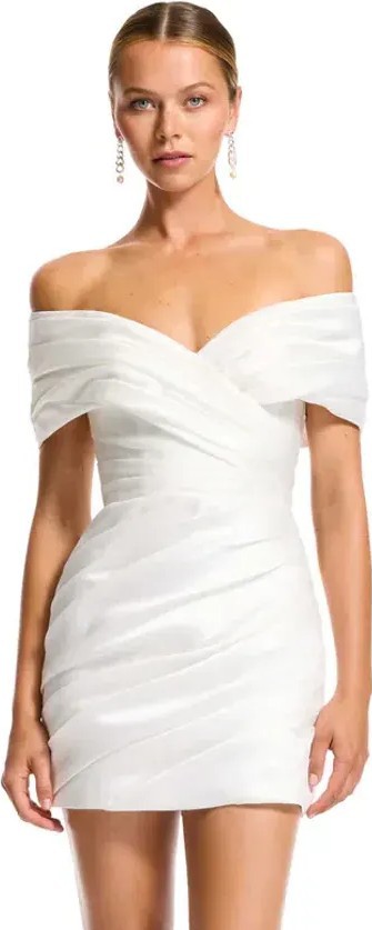 Crafted from luxe taffeta, the Yves mini features a fully structured corset bodice, off-the-shoulder detailing, and an artfully draped mini skirt. Finished with a statement oversized button detail at the back for a modern, elevated look.