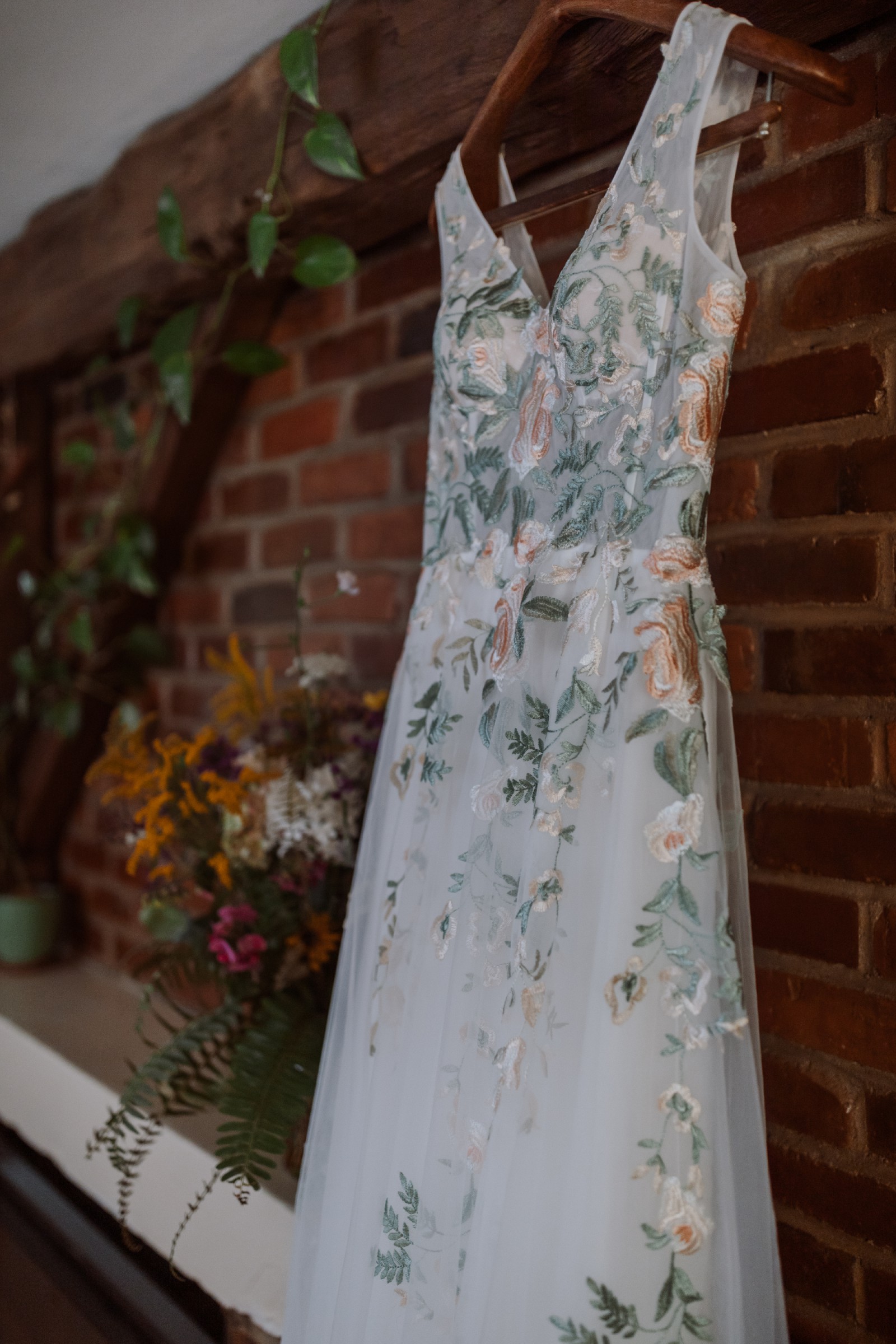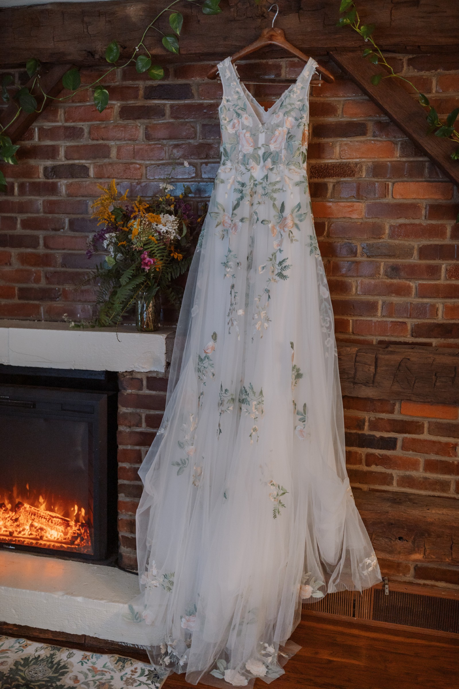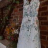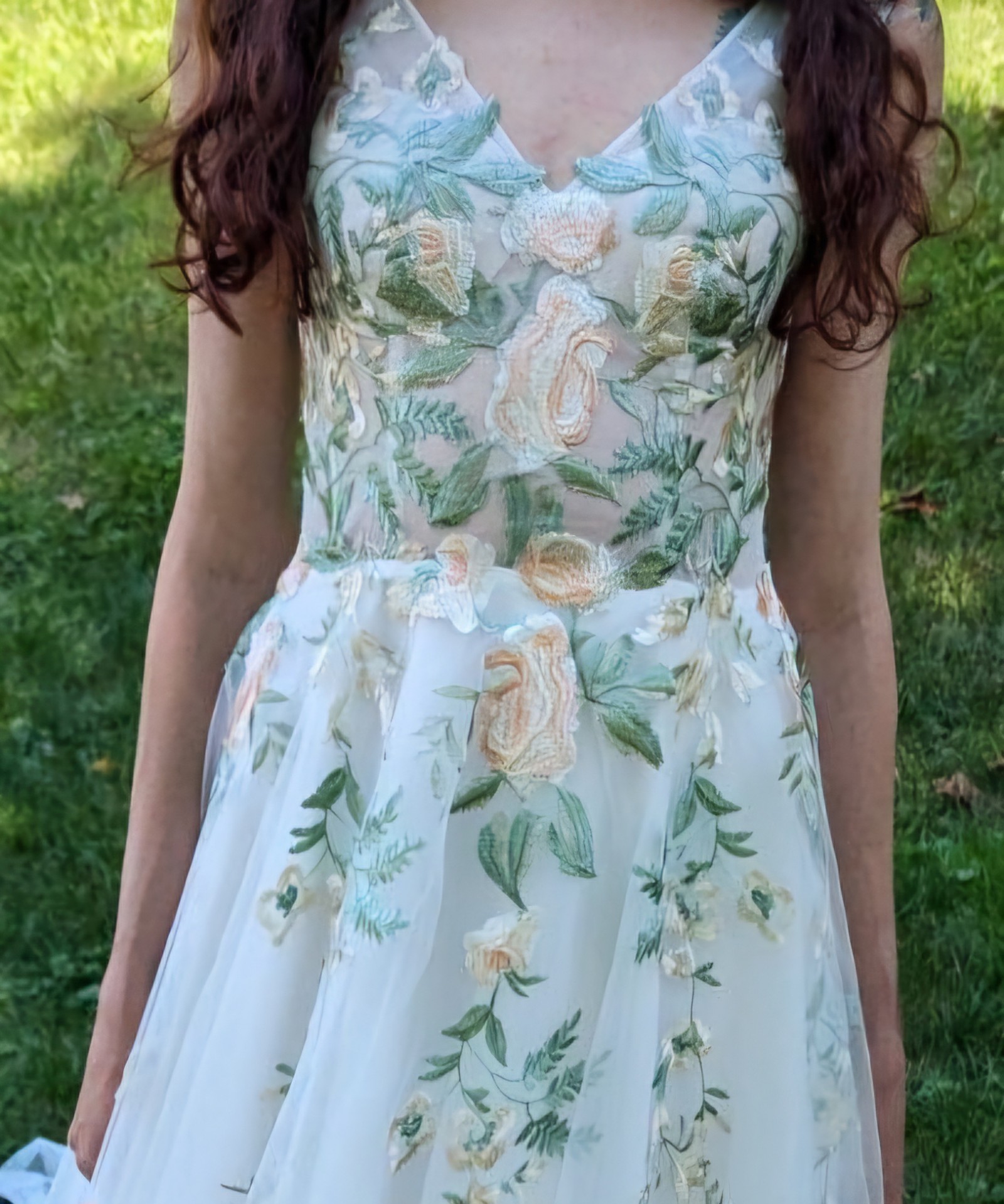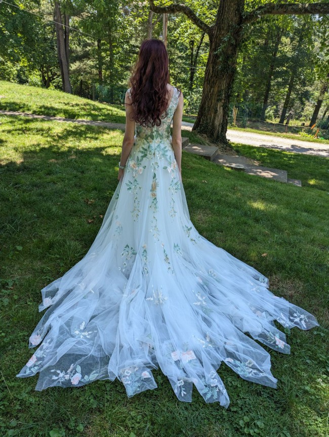 This enchanting boho, A-Line wedding dress was the perfect touch for my special day. Its exquisite V-neckline and low back added a touch of elegance, while its sleeveless design kept me comfortable and radiant throughout the celebration. The intricate floral embroidery embodies a fae beauty.