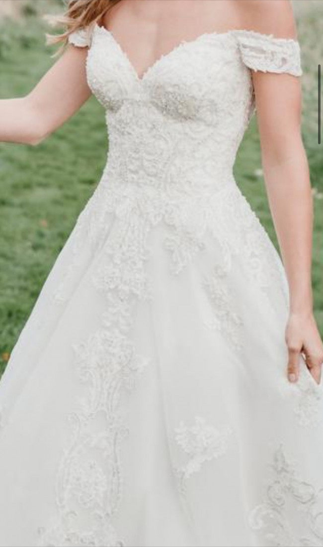 Classic and beautiful, Allure Couture C570 , NEVER WORN, features a sweetheart neckline, off the shoulder straps, a ballgown silhouette, and a chapel-length train with illusion accents.
