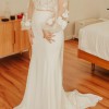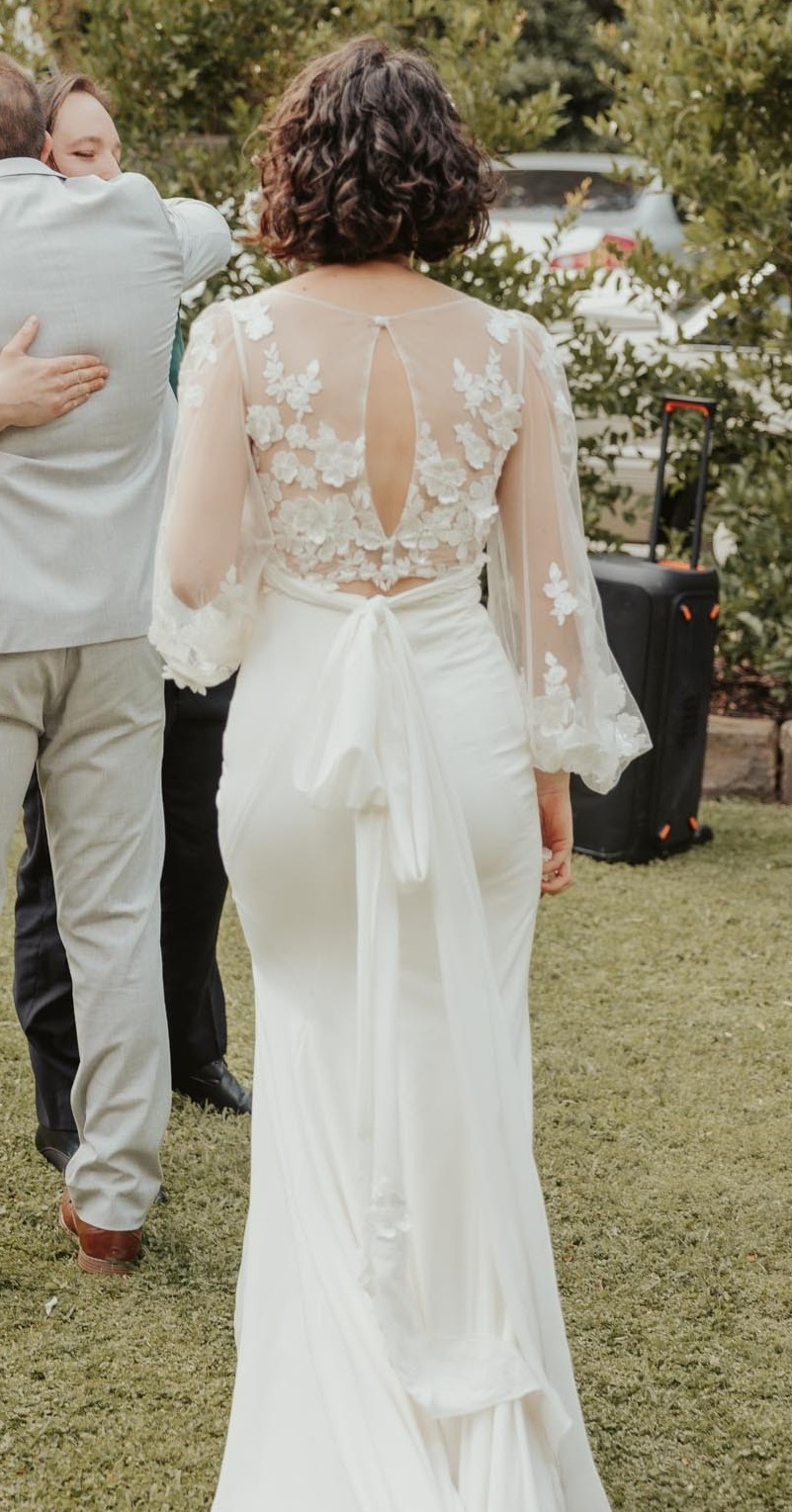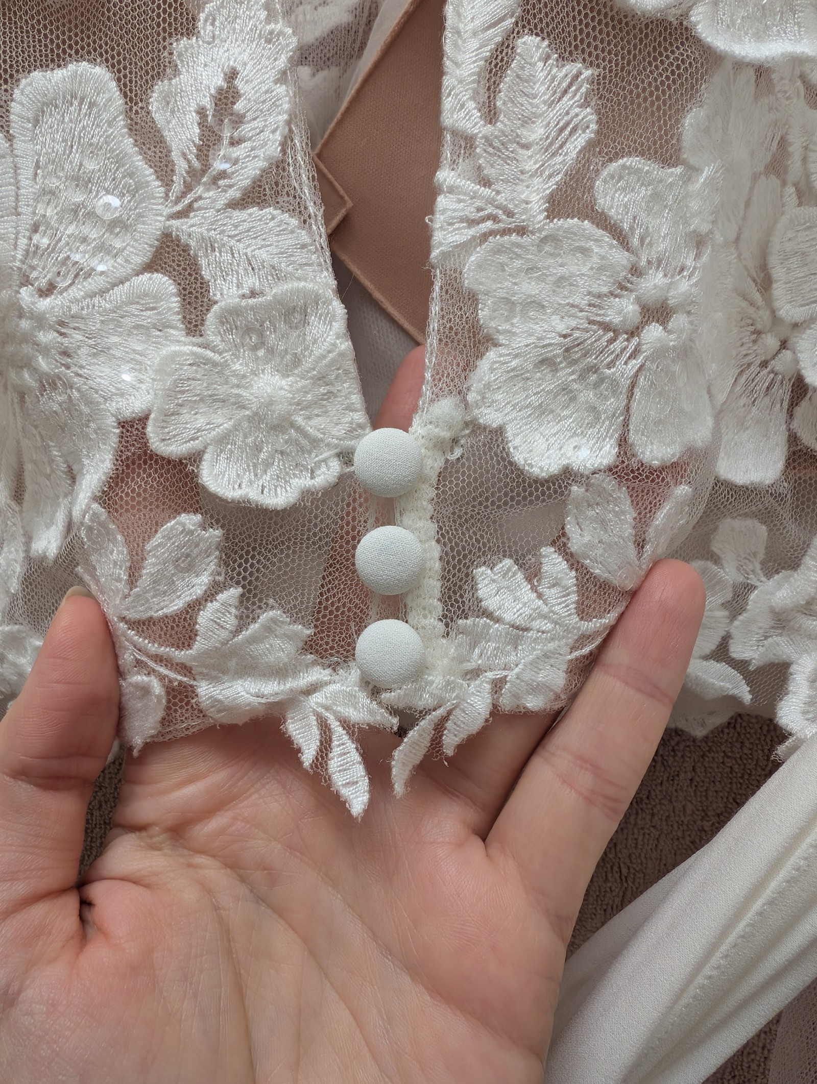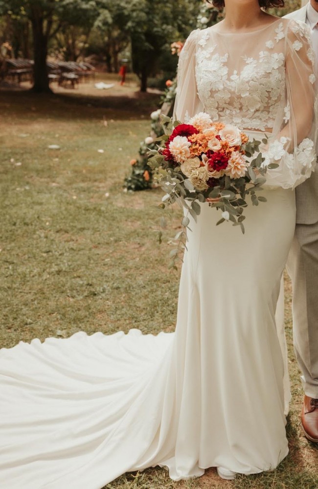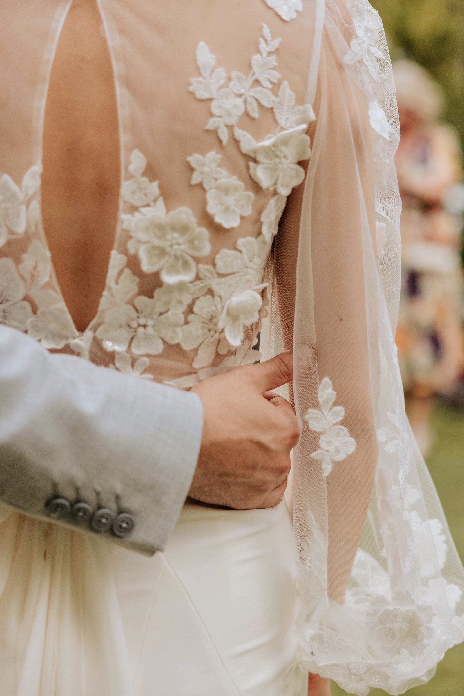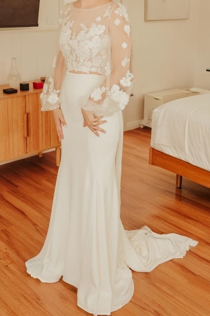 Long illusion bishop sleeves accented with 3-D lace