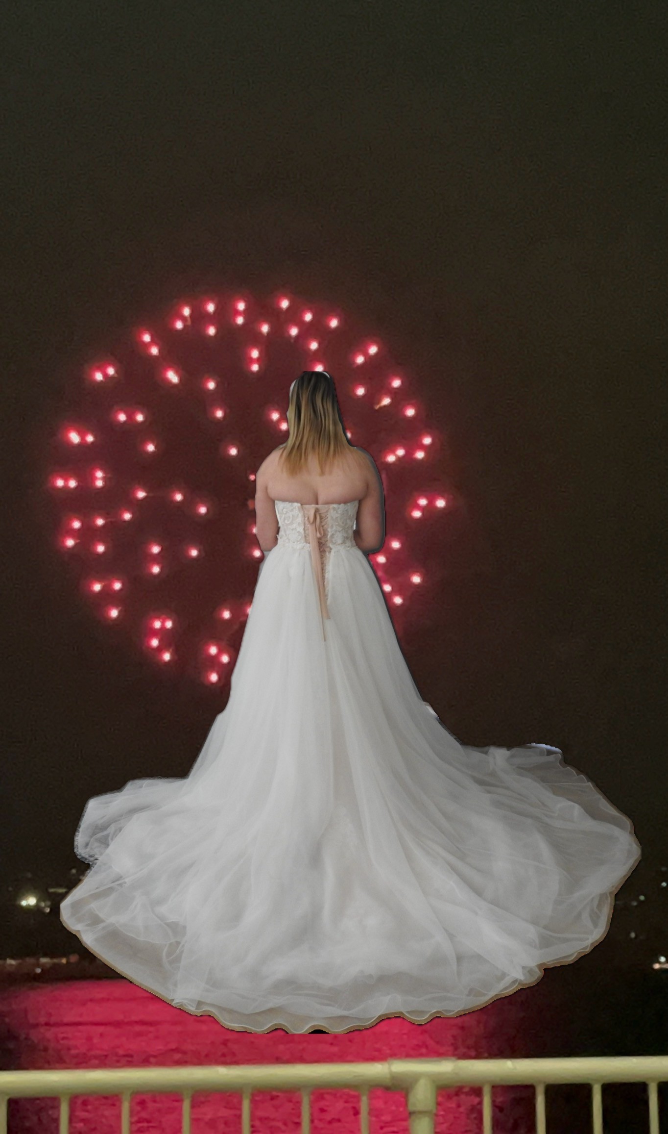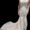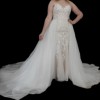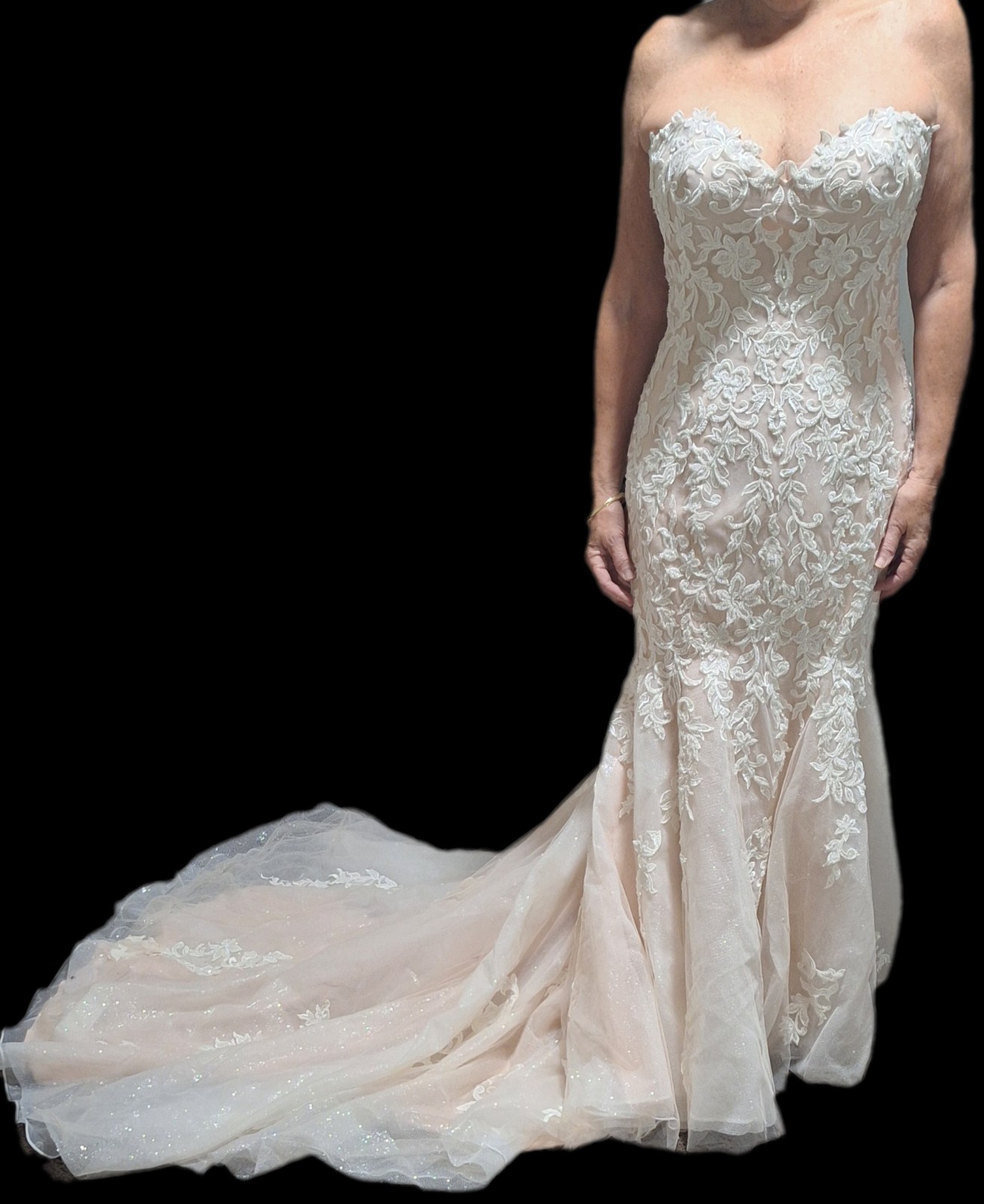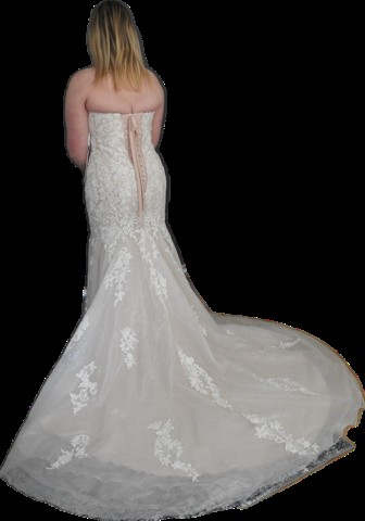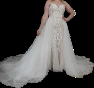 Luxurious chic ivory/nude gown. Corset back offers smaller and larger size options. The gown has a detachable net skirt that still reveals the intricate lace design of the dress. The photos don't do it justice. Will not disappoint on your special day.