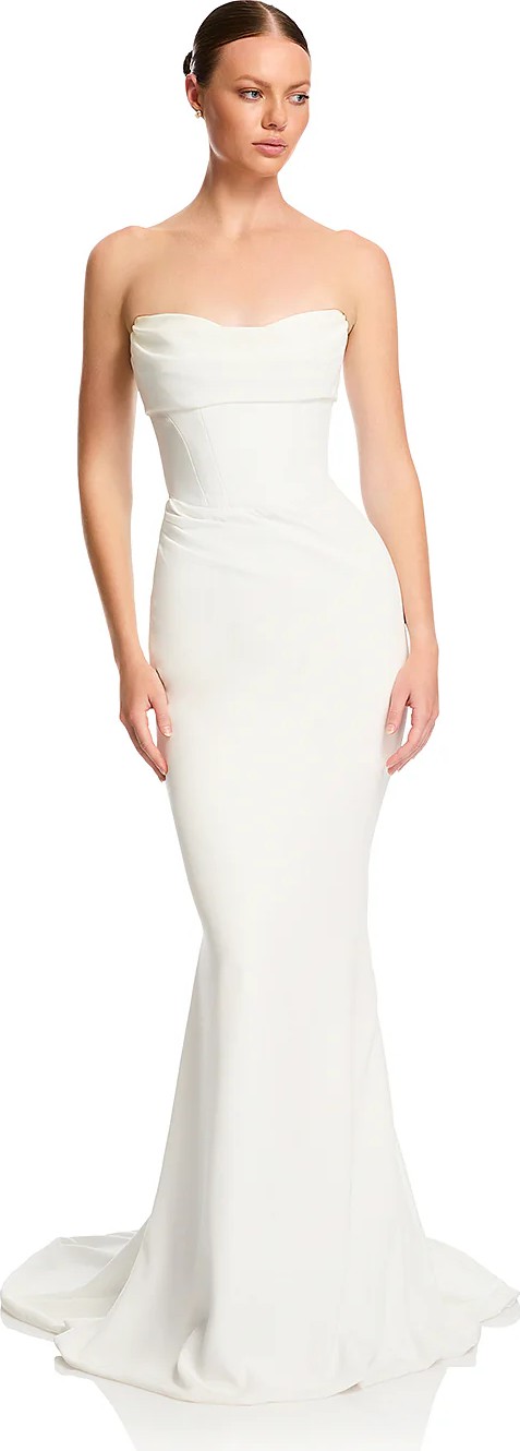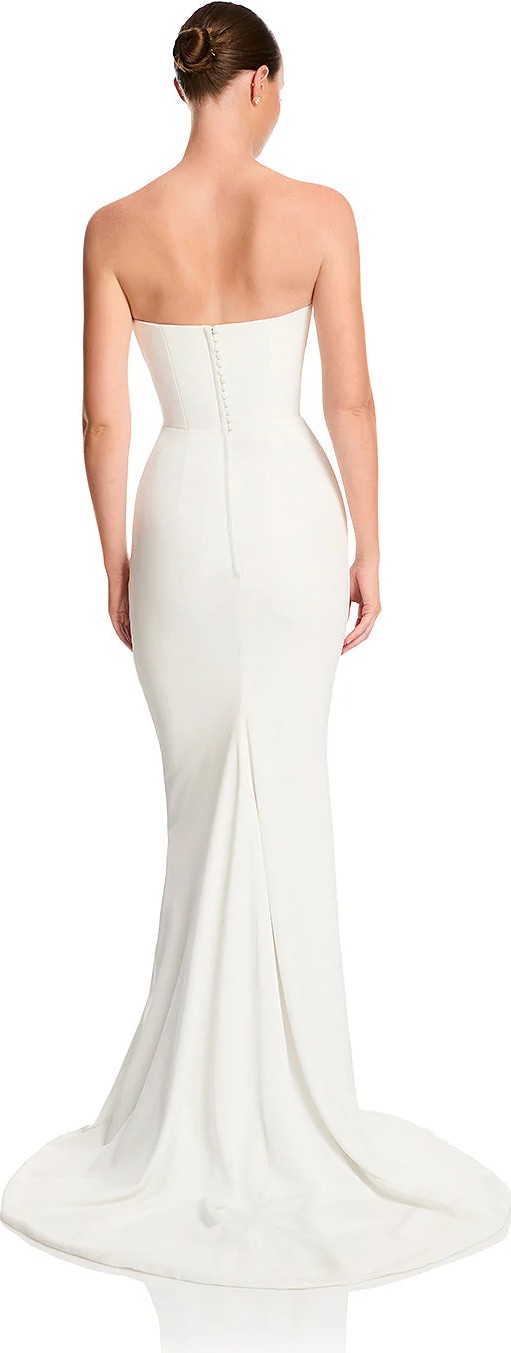 Fit for royalty, Duke sees contemporary couture meet sumptuous minimalism. Its structured, corseted bodice and fit and flare skirt cuts a statuesque figure. Cut from luxe triacetate and draped artfully across its scooped neckline and waistline, Duke masters the sartorial craft of elevated drama.