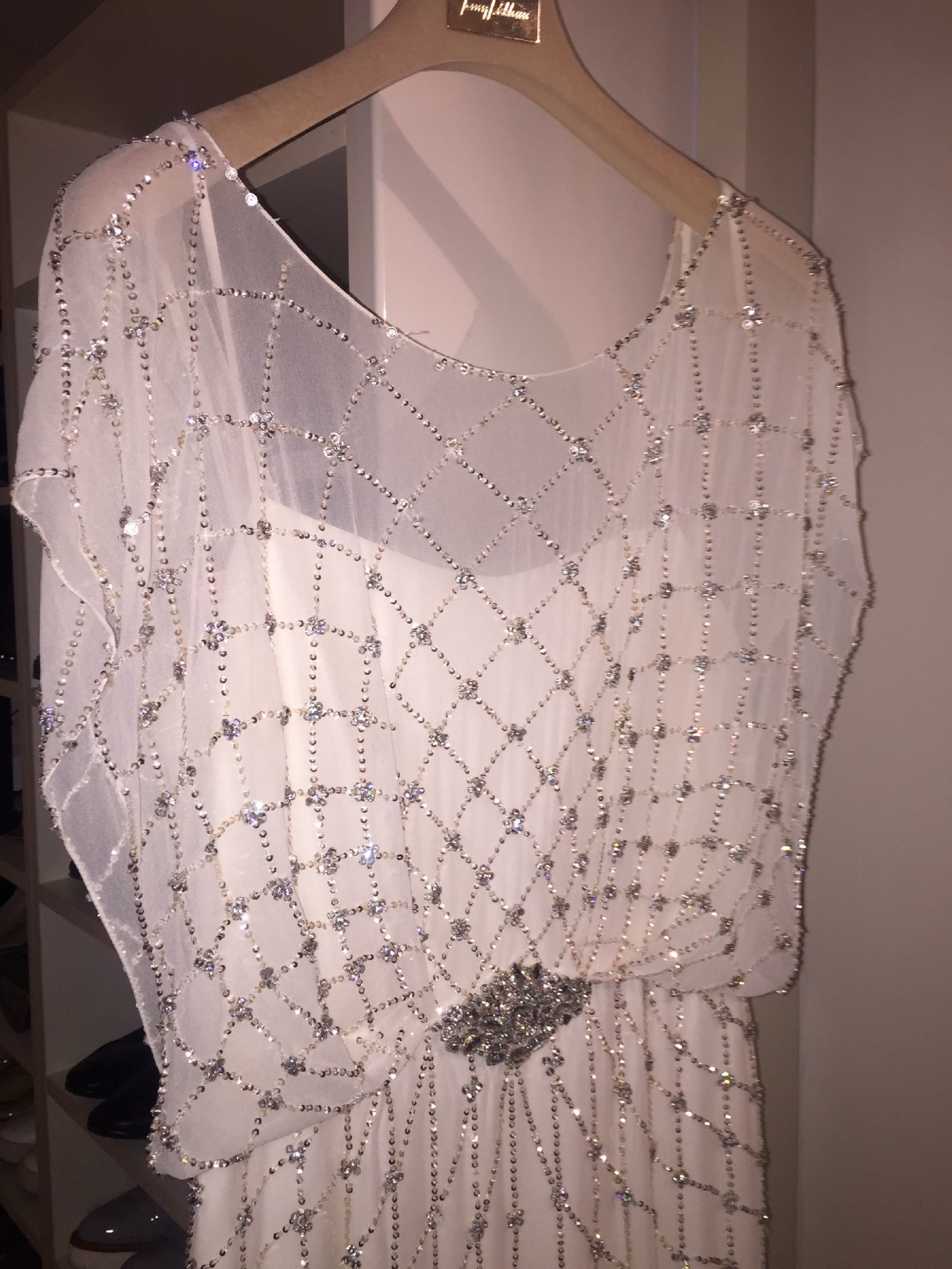 Jenny Packham Bardot wedding dress in ivory, featuring exquisite Art Deco–inspired crystal beadwork throughout.