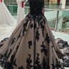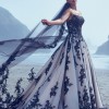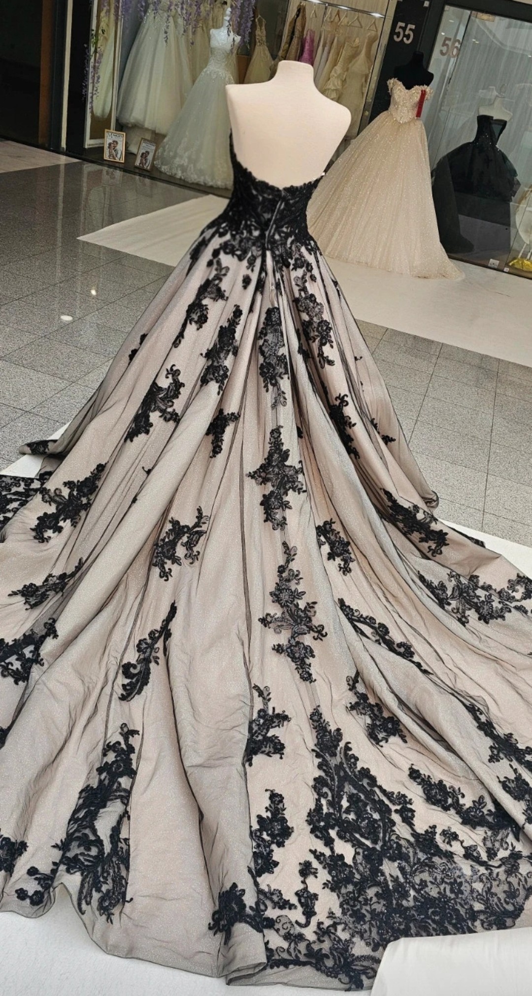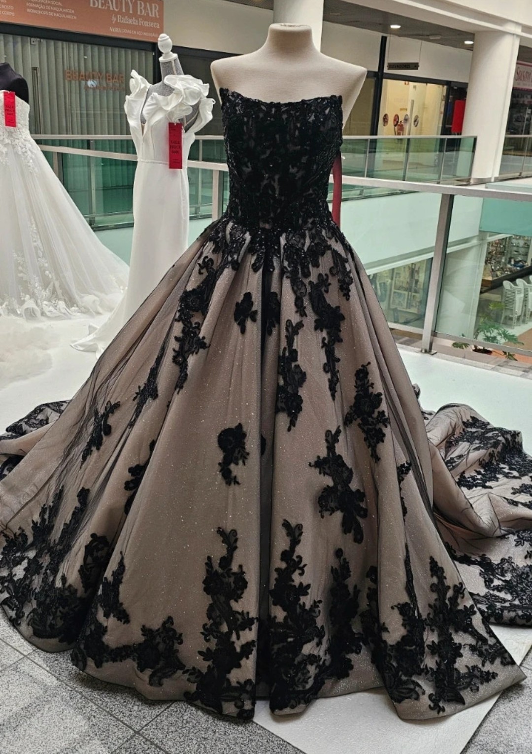 The dress features a structured strapless bodice with intricate black lace appliqués over a soft, flowing skirt, creating a stunning contrast and a powerful silhouette. Perfect for alternative brides, fashion-forward weddings, evening ceremonies, or statement bridal looks.
