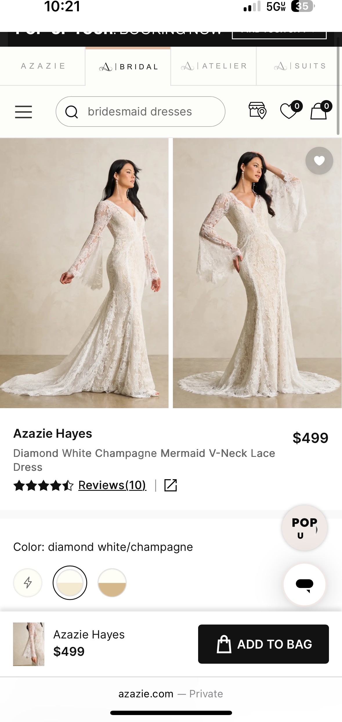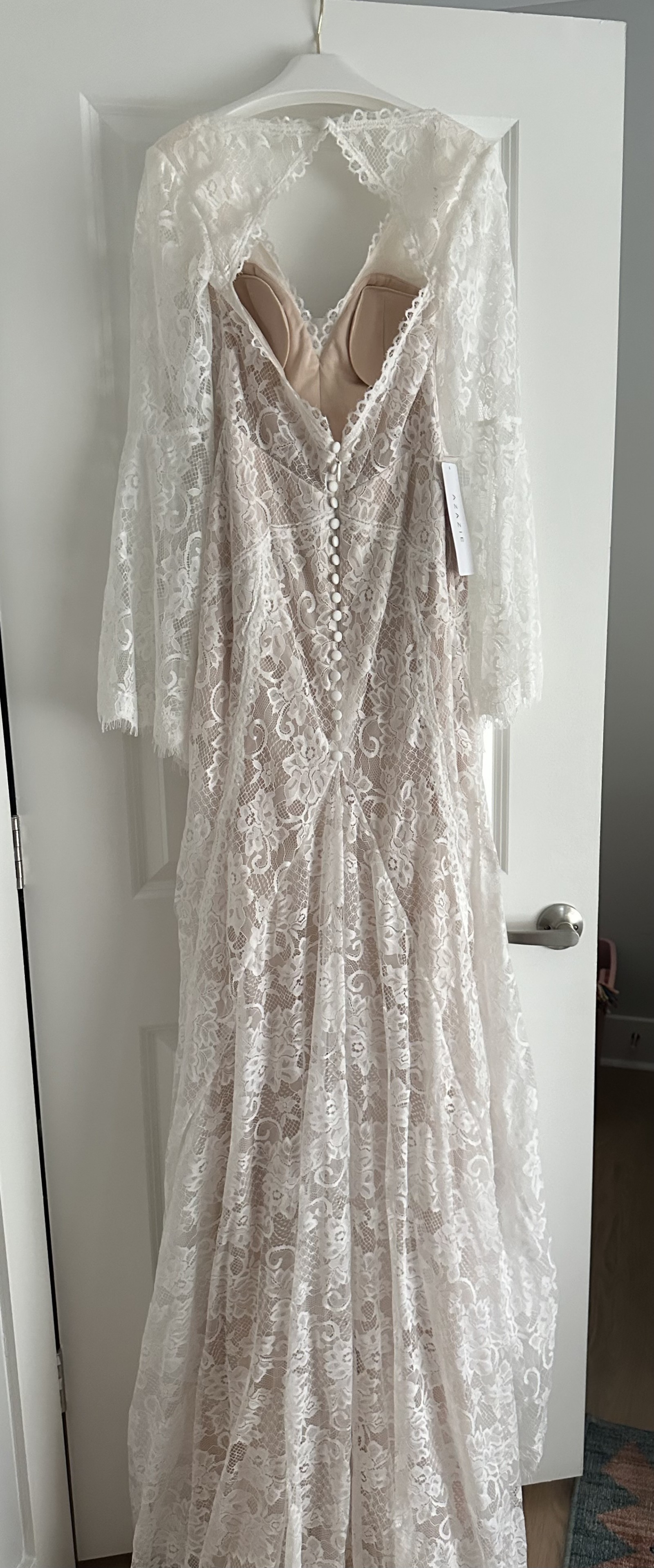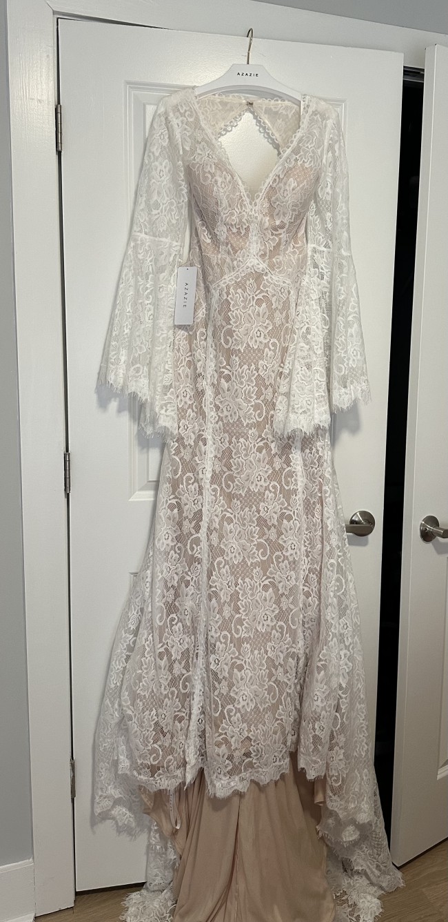 Lace Azazie Hayes dress with long train. Perfect for the Boho/mountain bride! I ended up going with a different dress which is why I’m selling this. Never worn, not altered.