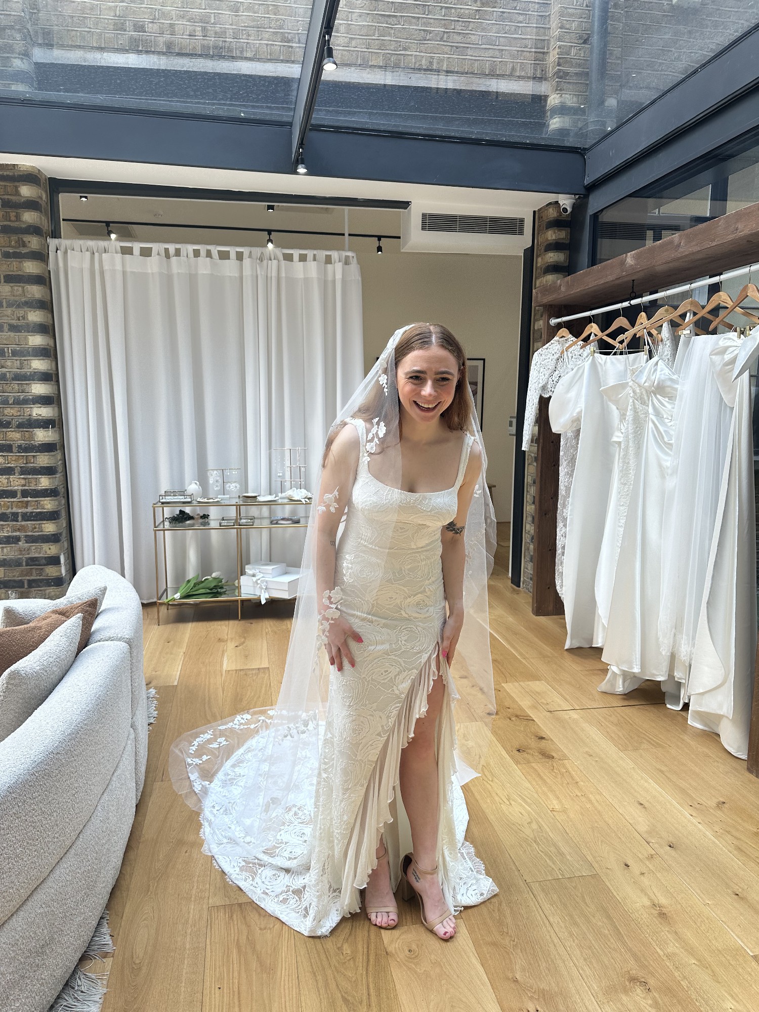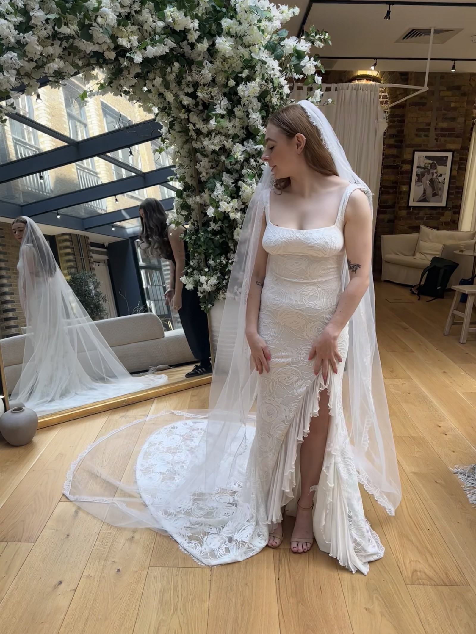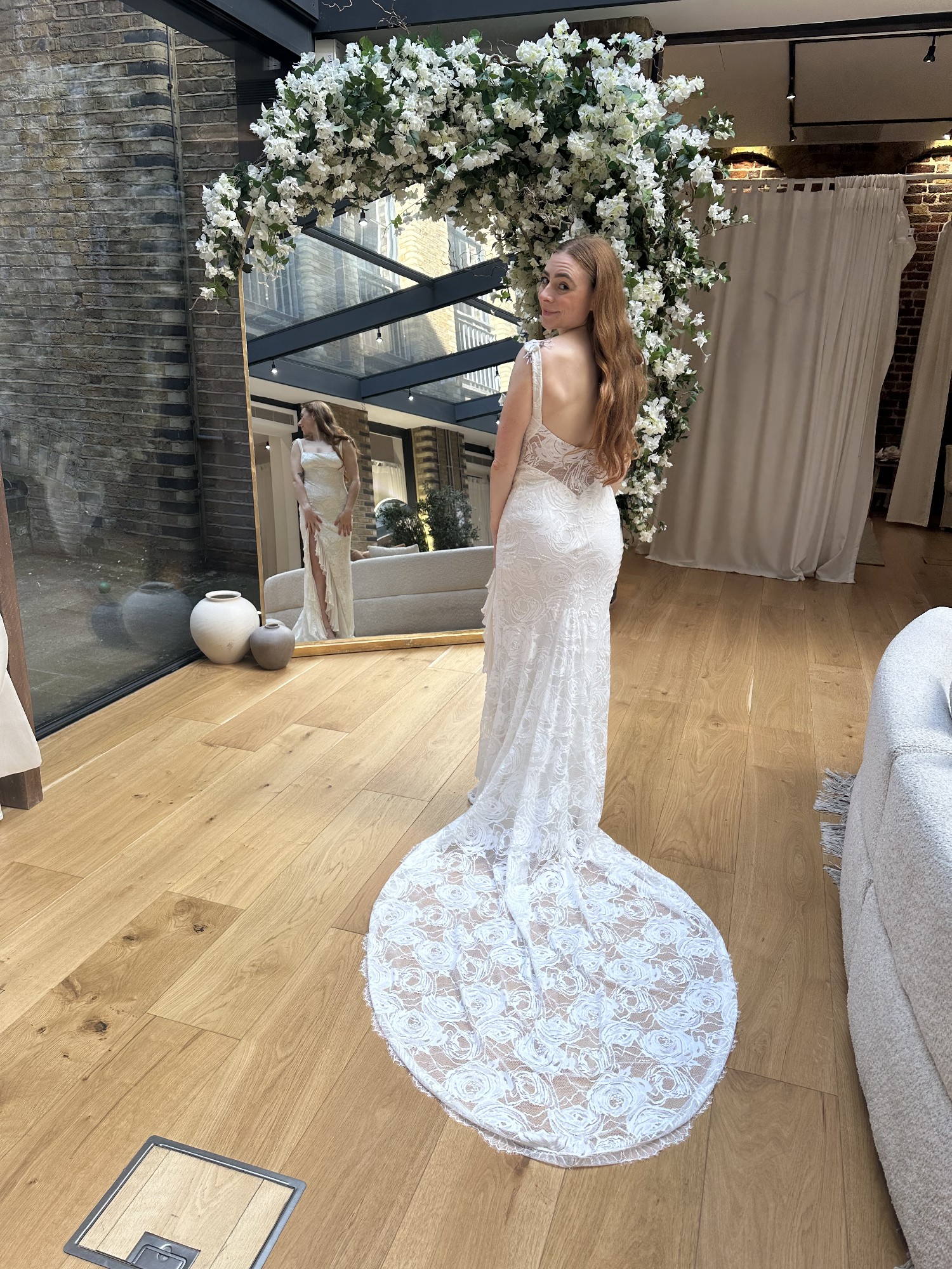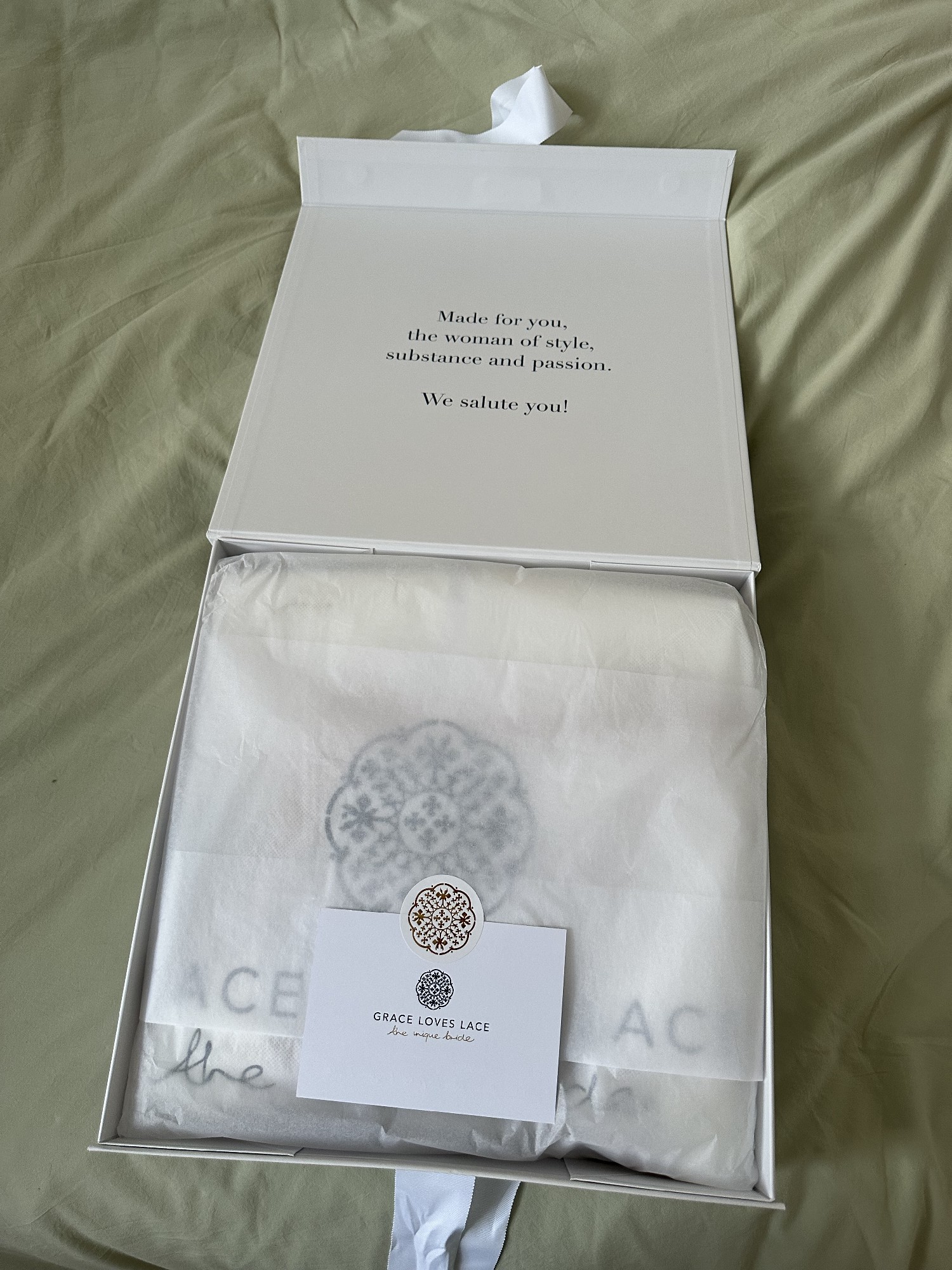 Grace Loves Lace Carmen dress. Very comfortable material with stretchy lace, a knee slit and ruffle detail. Short lace train which pools nicely and has a button/loop so can be hung up at the back. I love this dress and it’s never been worn so is in perfect condition - only reason I am selling is because my wedding plans have changed. I have the original box, coat hanger and dress bag. Original price £1400.