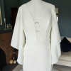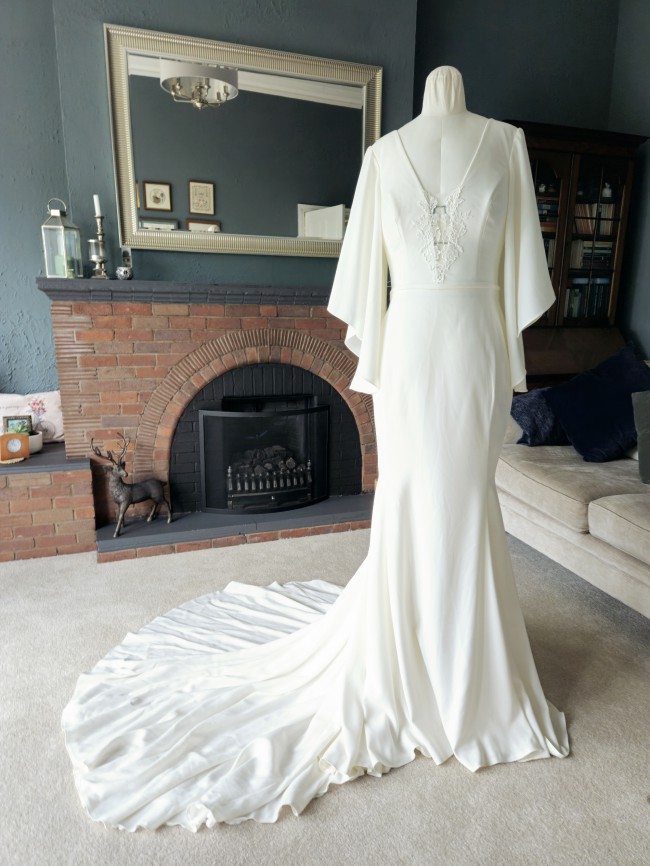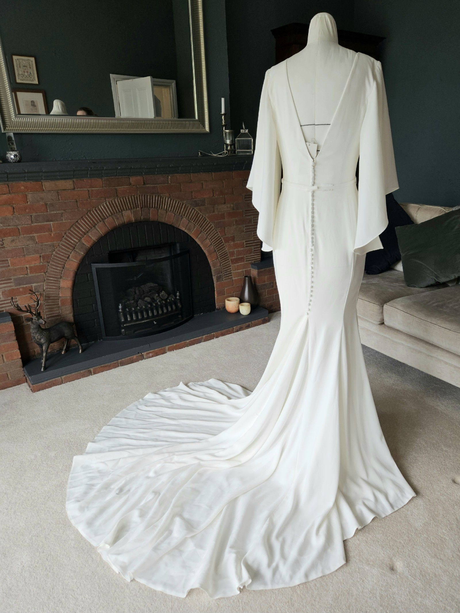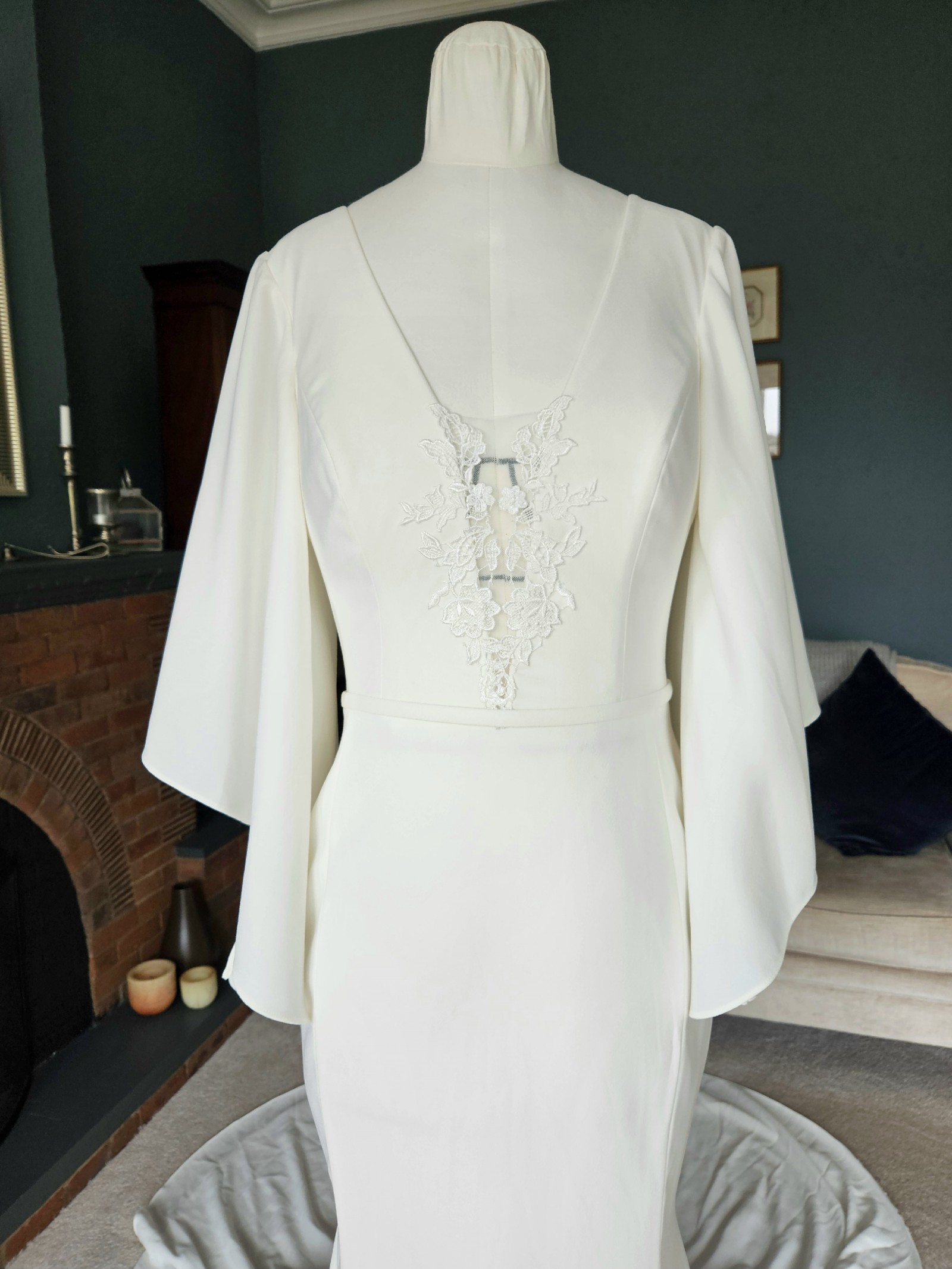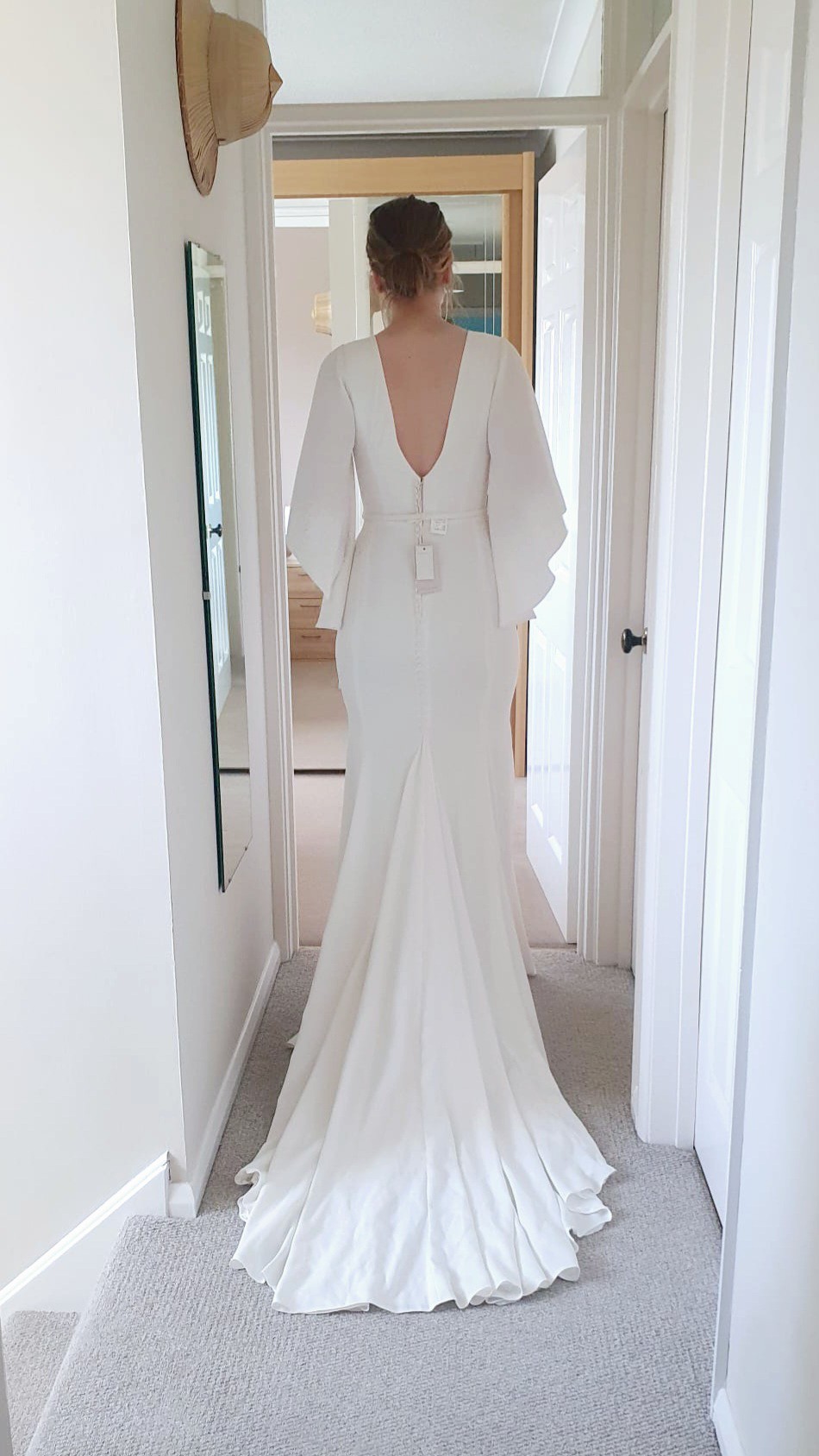 Brand new, never worn with tags. Beautiful fabric, with gorgeous sleeves. Minor alterations made to bust but otherwise like new.