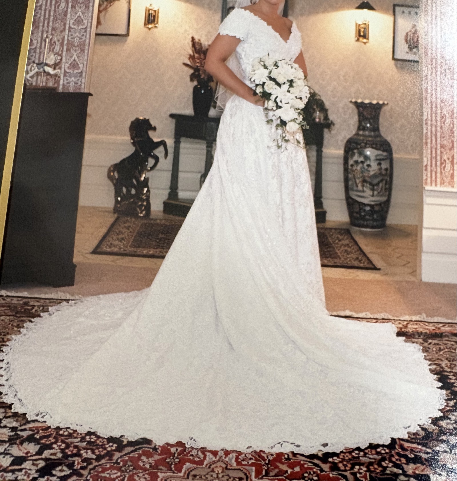 This Illisa gown by Demetrios was a dream come true on my wedding day. Designed with an enchanting A-line silhouette, this dress made me feel like a princess as I walked down the aisle. The delicate capped sleeves add just the right touch of elegance, while the mid-back design ensures comfort and ease of movement throughout your special day.