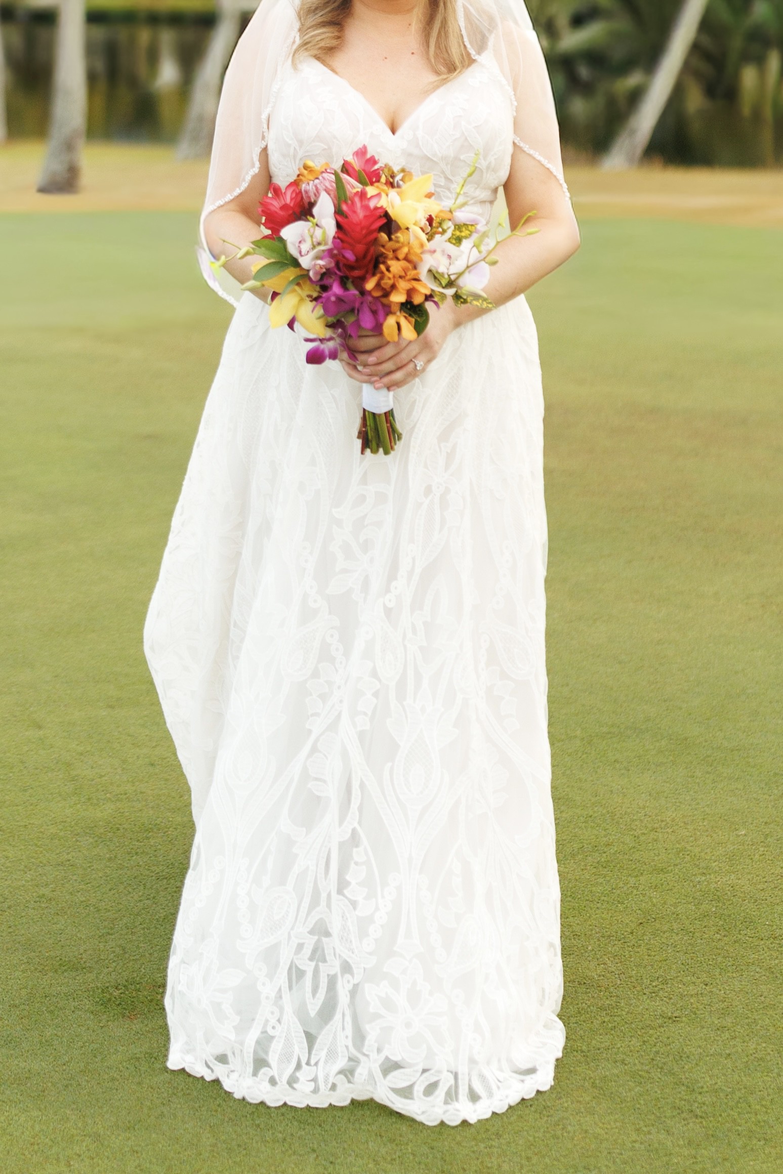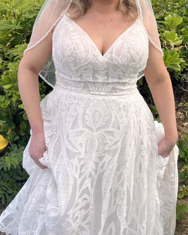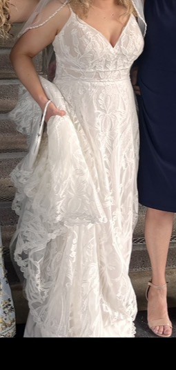 Beautiful Maggie Sottero dress (size 12) that was perfect for our beach wedding. The fabric also does not wrinkle and does not feel super heavy or hot in a tropical environment. It was great to travel with and required no stemming. The dress was also altered and has been dry cleaned since the wedding. I’m typically a size 8 street size) wear a 36 D for bra size. I weigh about 145 lbs and I’m 5 ft 2. The dress was pretty tight on me but was doable. I will also include the handmade veil which was bought off of Etsy. Let me know if you have any questions!