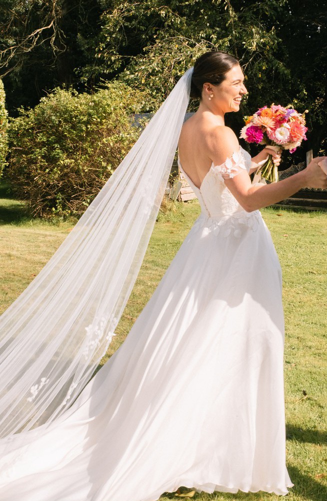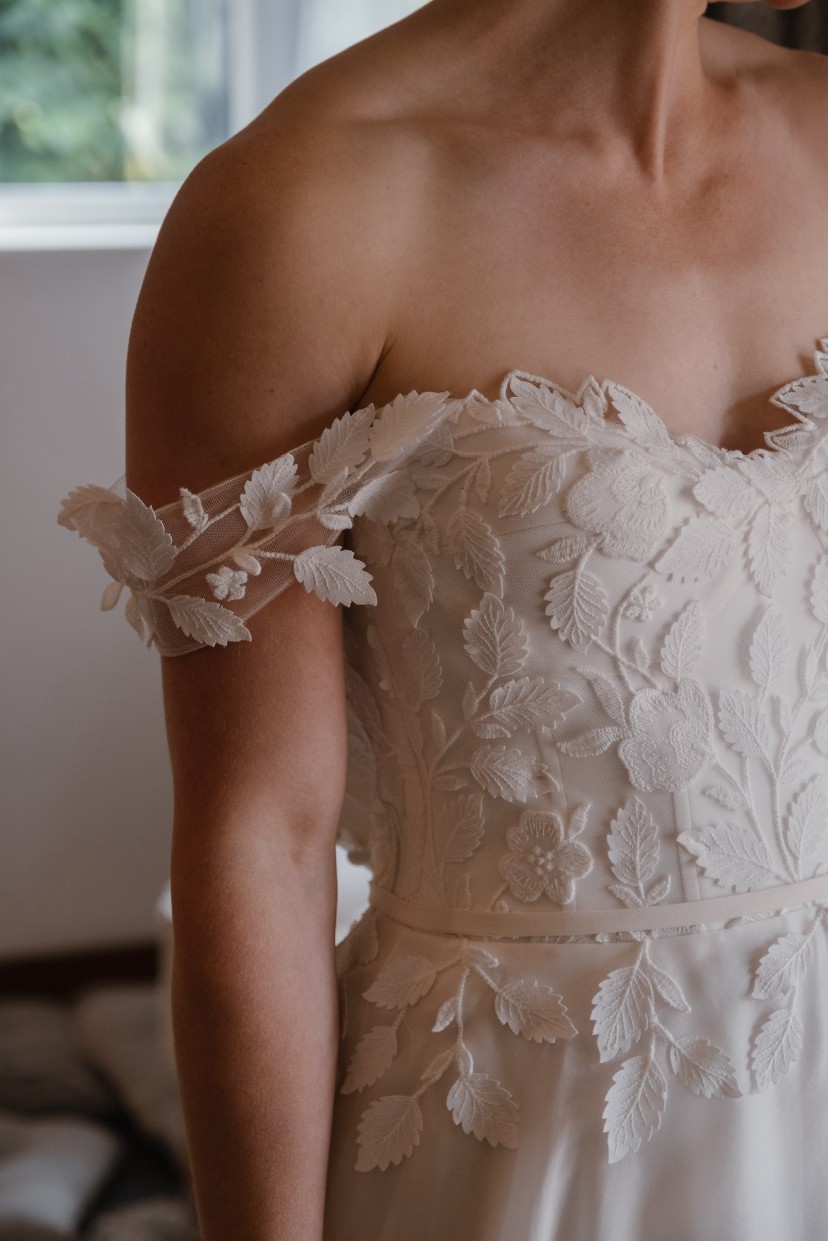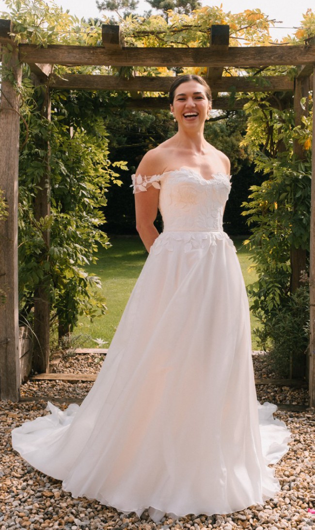 Thalasso, from Suzanne Neville’s 2023 Opulence collection. The Thalasso dress has cupped, corseted bodice and delicate off the shoulder straps covered in tulle.