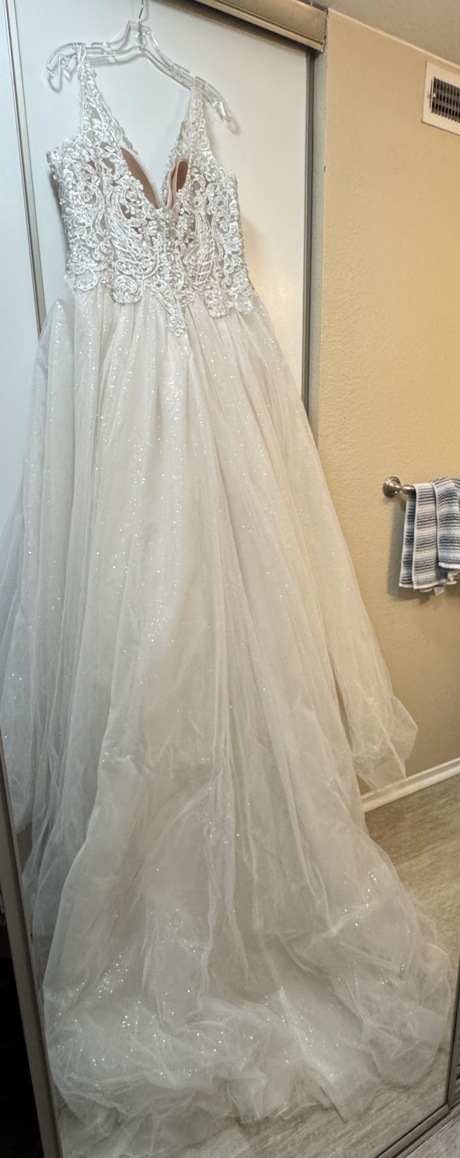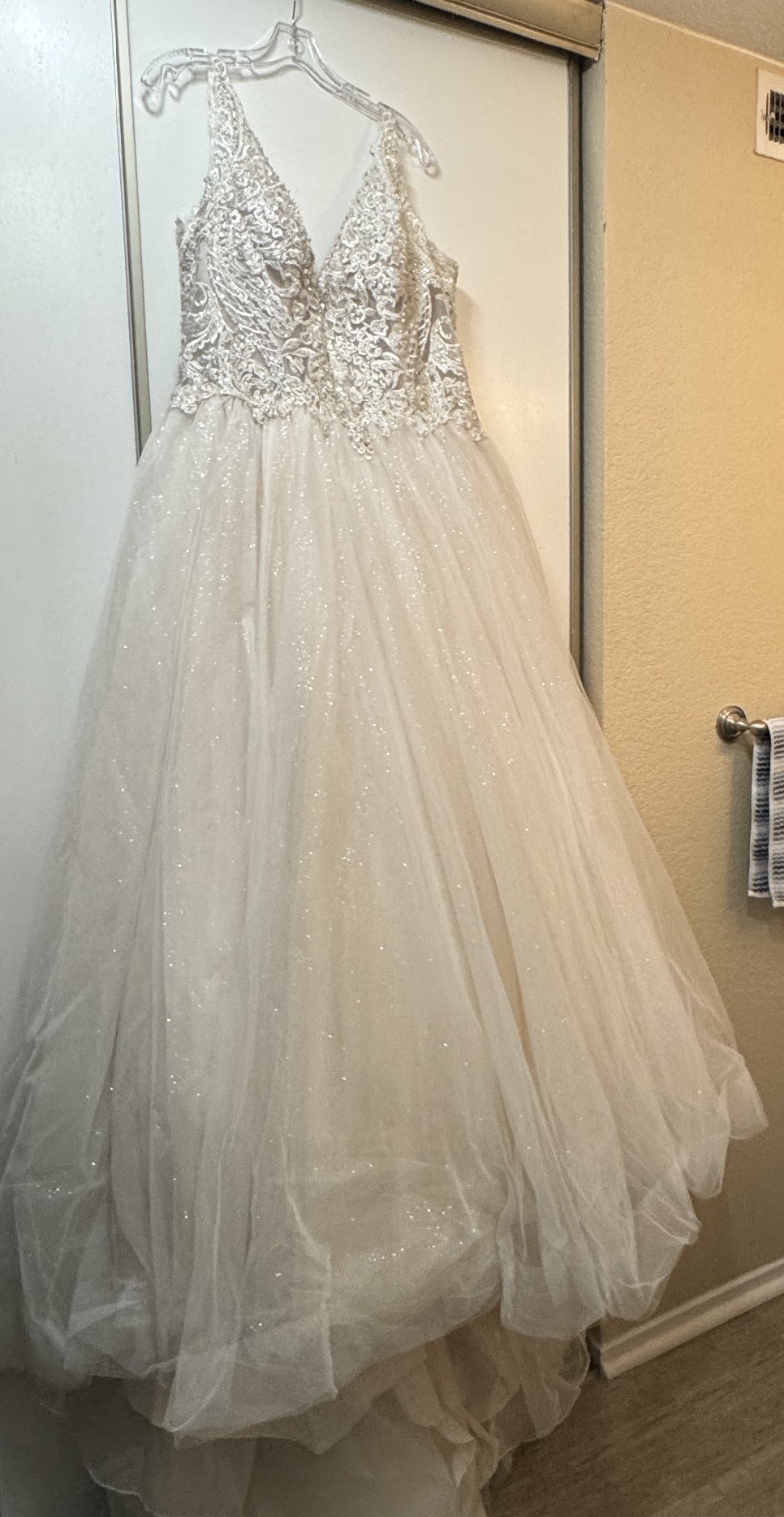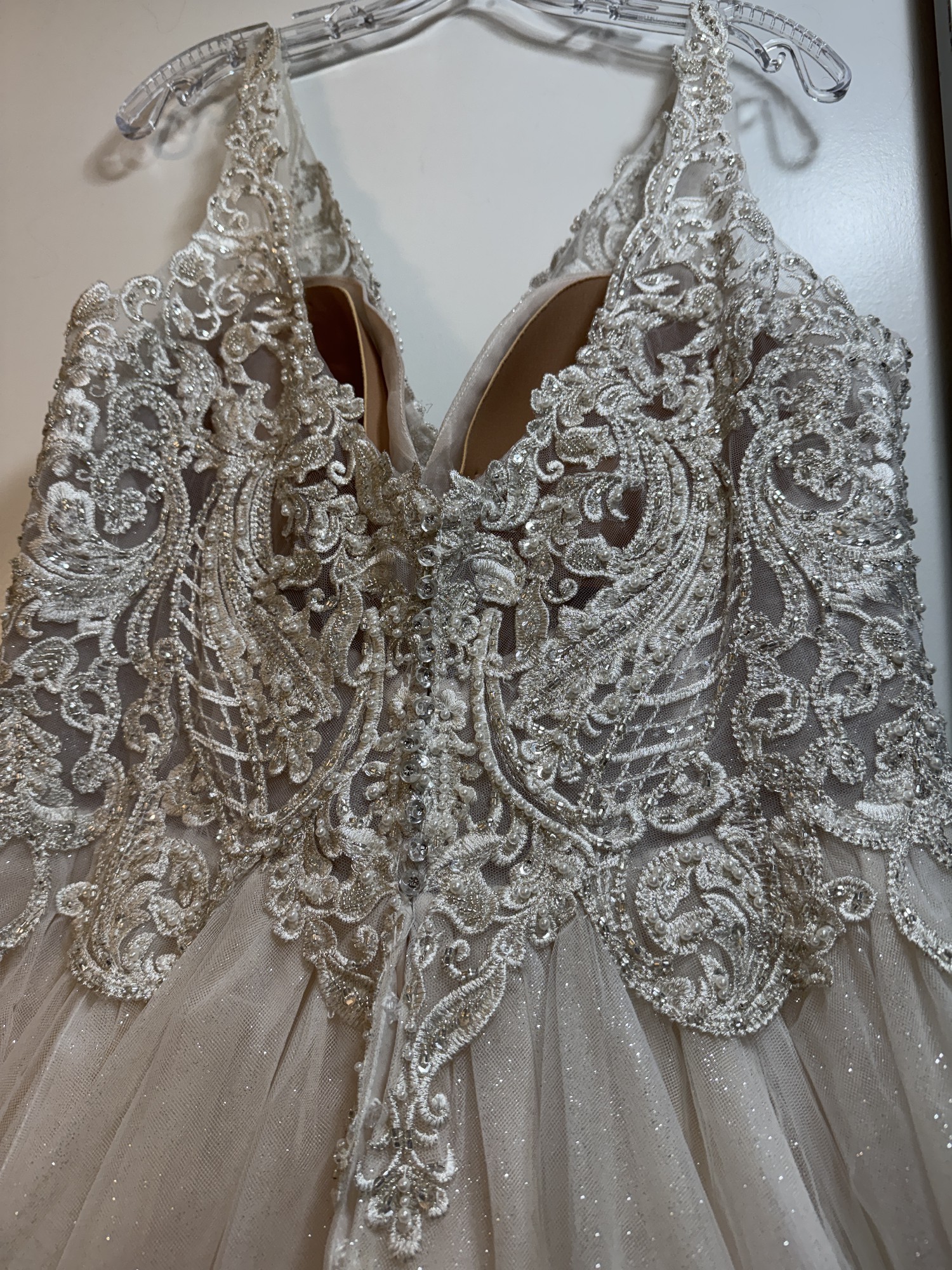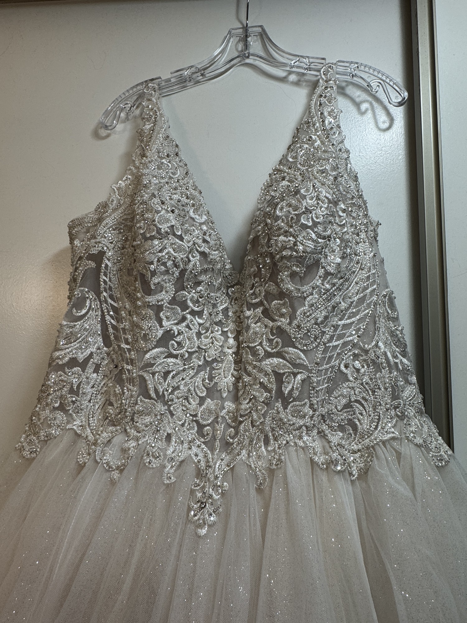 This enchanting Taylor Lynette gown by Maggie Sottero is the epitome of elegance and romance, perfectly designed for the bride who wishes to make a dramatic statement on her special day. In a classic ivory hue, this ballgown silhouette flatters every figure while offering an air of sophistication. The V-neckline leads to delicate straps that offer support and allow for comfortable movement, ensuring you can dance the night away.