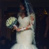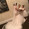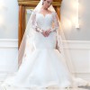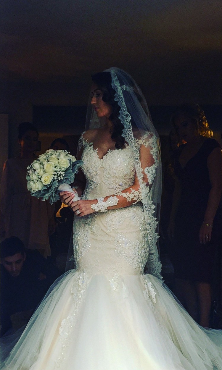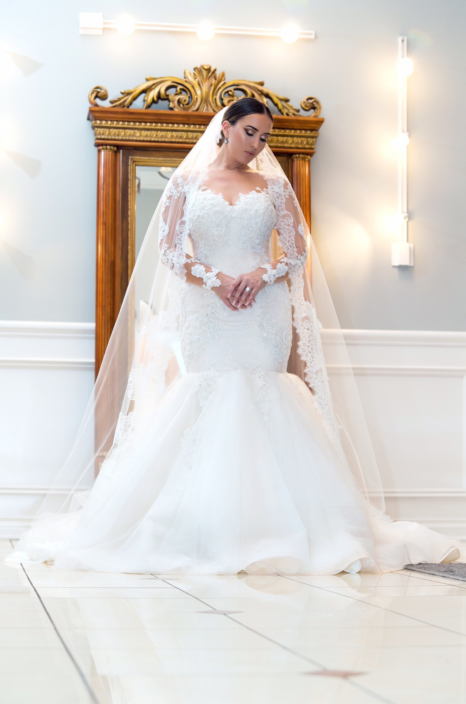 Ivory custom couture wedding dress by renowned designer Katerina Bocci. The gown features a flattering mermaid silhouette with long lace sleeves. An attached overskirt transforms the design into a dramatic princess-style gown from the back. Both the dress and detachable skirt are handcrafted from luxurious Italian silk organza and exquisite French lace.