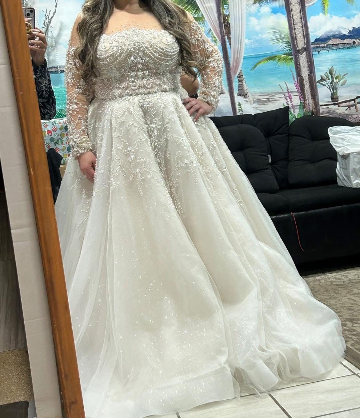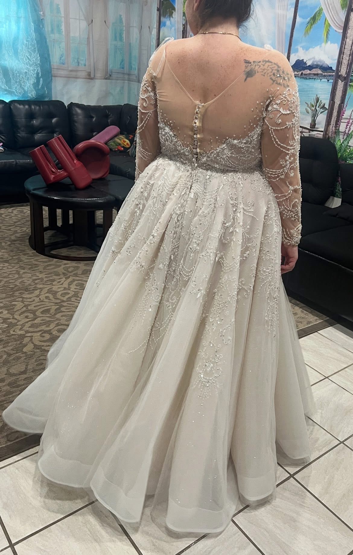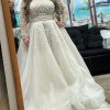 stunning wedding dress—a showstopper. Has been slightly altered, bust taken in and hemmed. Alterations were tacked some there is room for everything to be let out a bit. Never worn, picked a different dress.