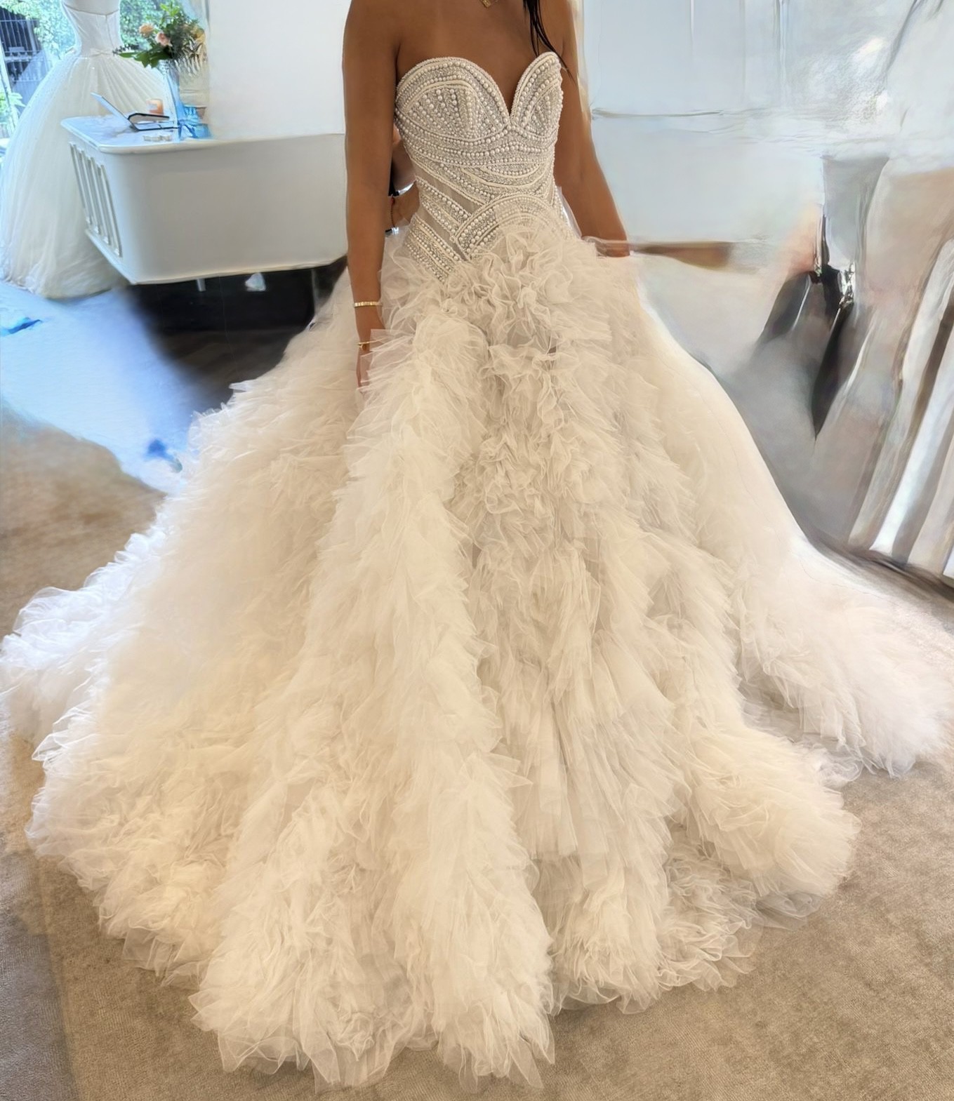 A stunning Steven Khalil Rafaela gown, purchased directly from the boutique and never worn outside of the store. This dress is in immaculate, boutique-condition — only tried on. Selling due to a change of mind, offering another bride the opportunity to wear a timeless, high-end couture gown at a reduced price. • Authentic Steven Khalil Rafaela gown • Unworn & unaltered • Comes with original Steven Khalil dust bag and hanger • Professional alteration company details provided upon purchase