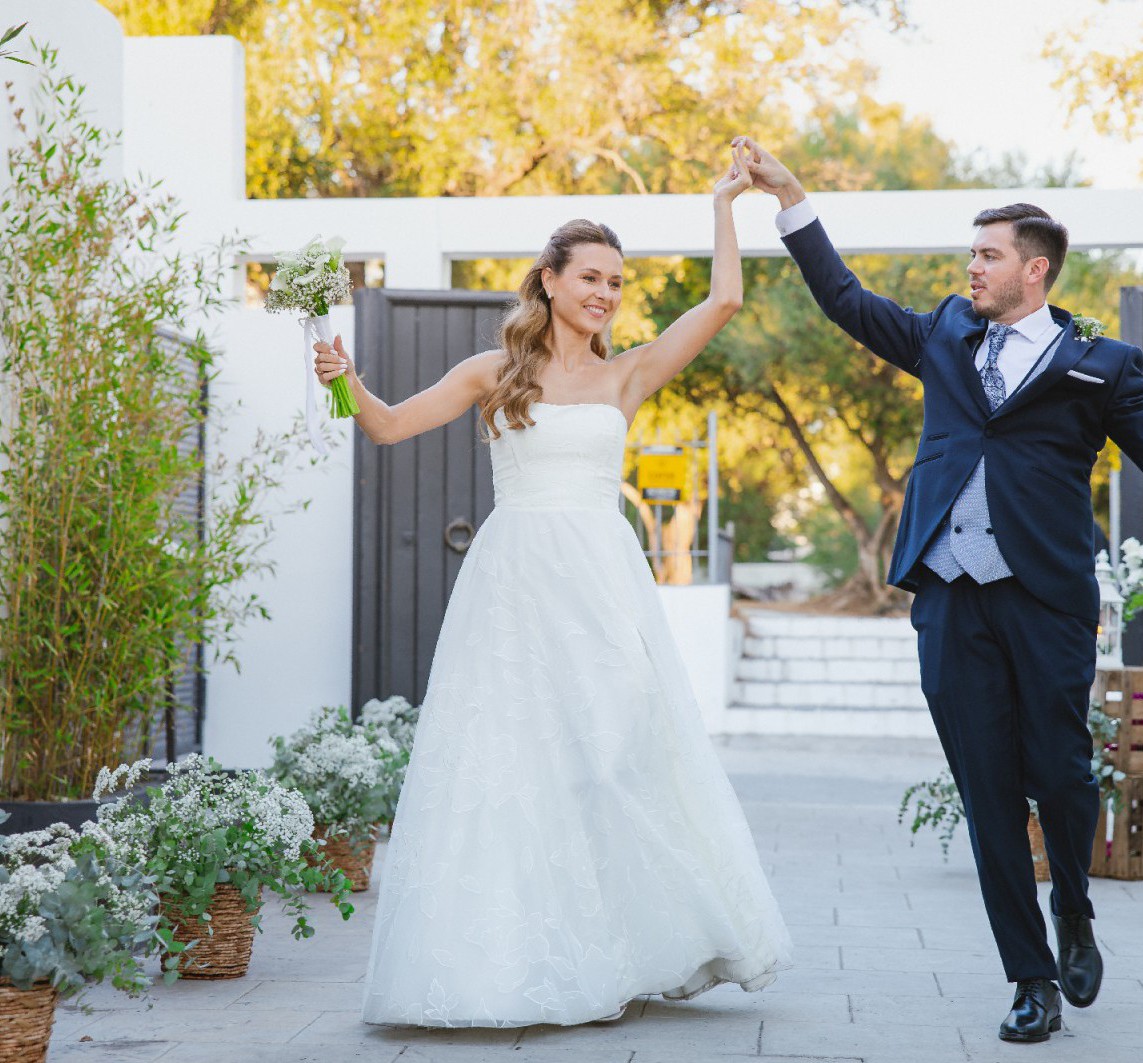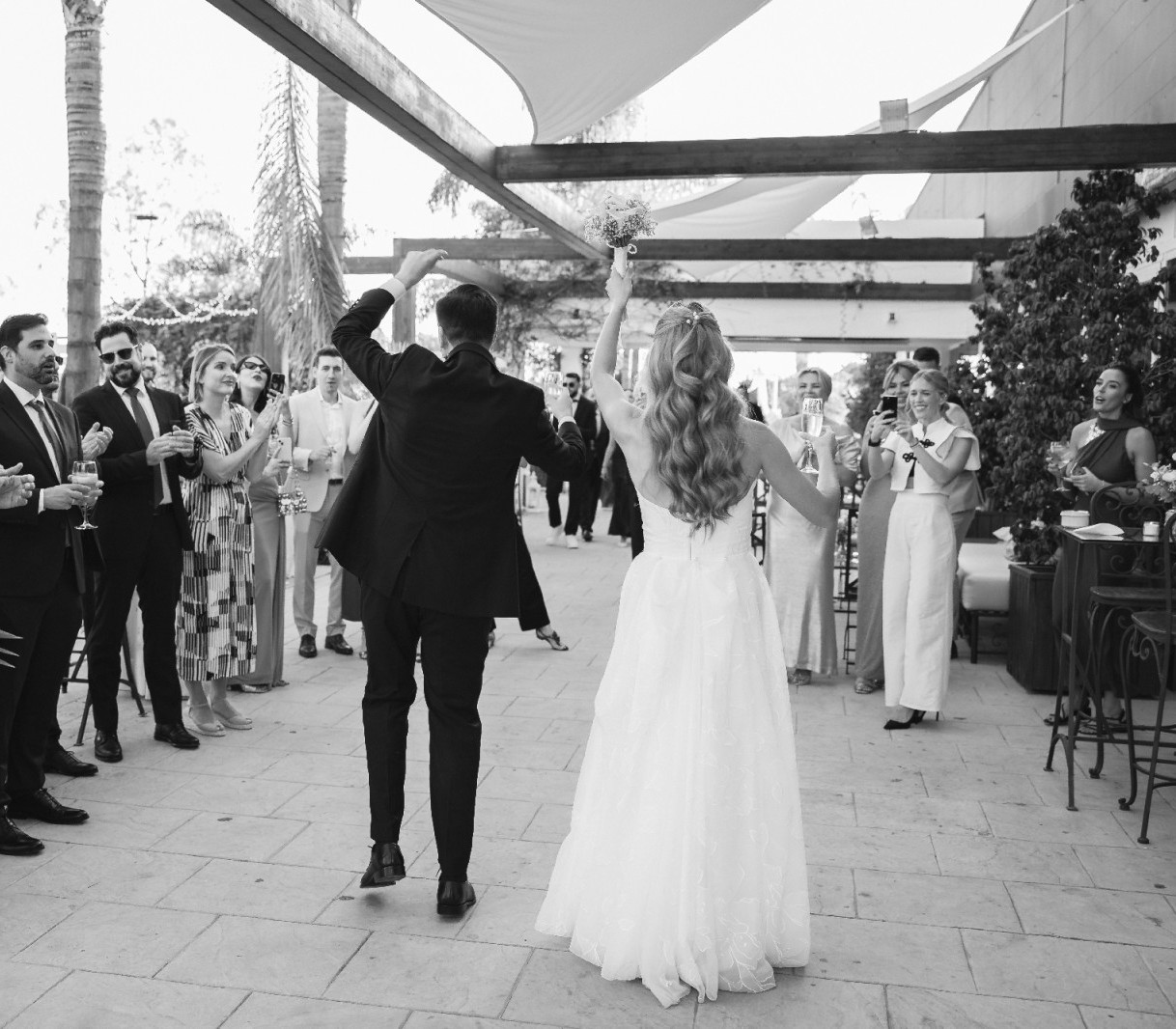 One small alteration was made to the train to make it more secure and comfortable for the reception. Instead of a traditional wrist loop ribbon, three small pearls were added at the back of the train, attached with elastic loops. This keeps the train in place while dancing and moving around, looks elegant, and is very comfortable. The pearls are also easy to remove, so the train can be released again for photos.