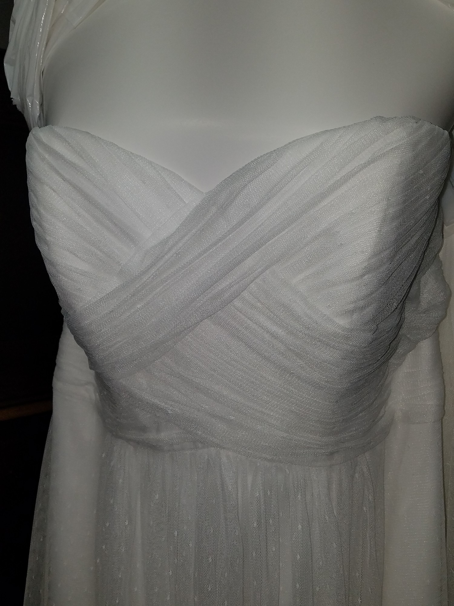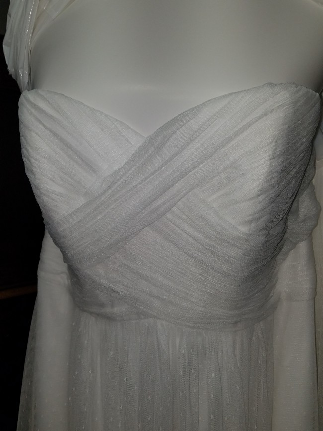 Brand new, never worn, David's Bridal strapless sweetheart A-line wedding dress. I am including the slip to go under the dress. The slip is layers of toile to make the bottom half of the dress fuller while keeping the dress from tucking between your legs while walking. I am also including a white lace half jacket. The dress, slip, and jacket are all brand new, never worn, and have lived in their bags since purchase other than cleaning.