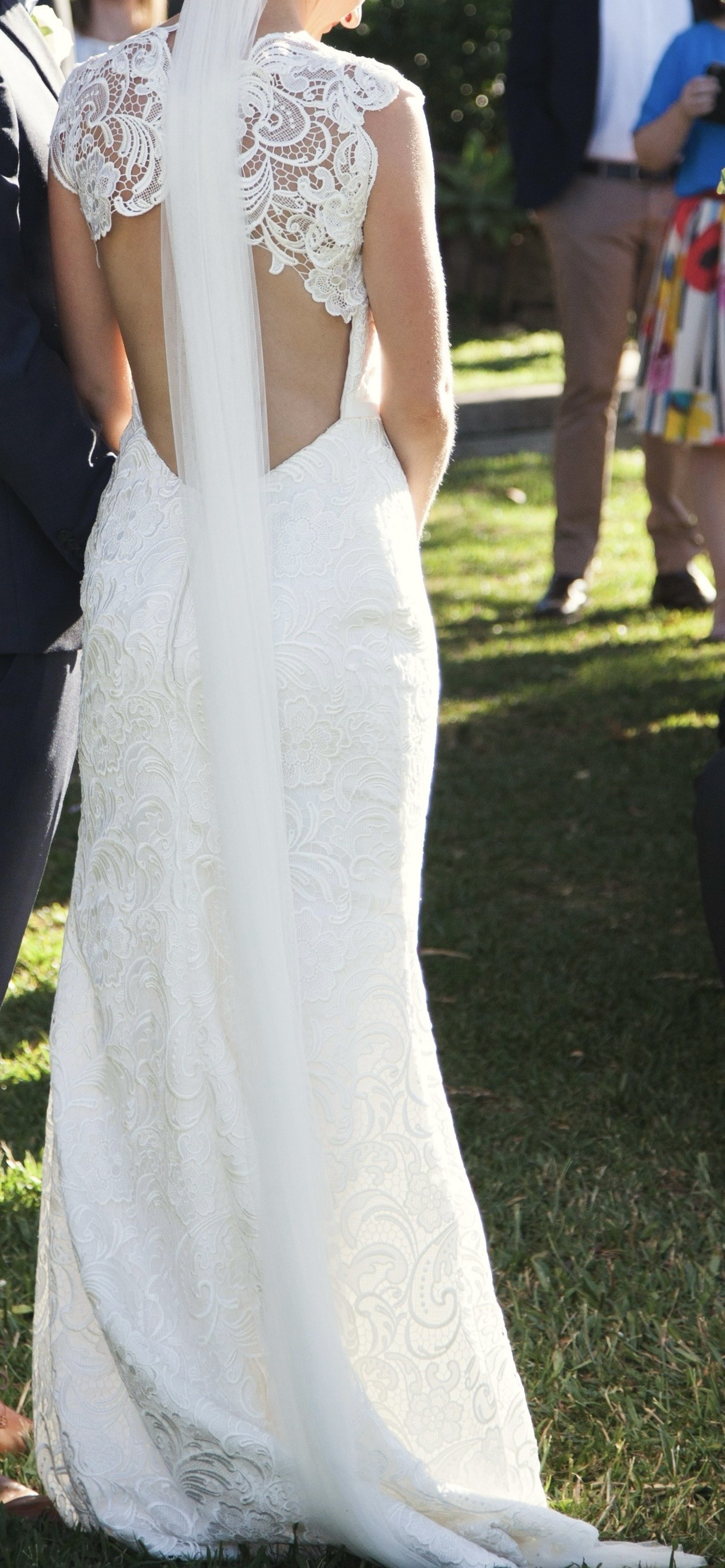 Beautiful and simple dress. Stunning detail throughout the dress/back of dress. Not much stretch to the material. Would love someone to have the most beautiful wedding day, as I did, in this dress!