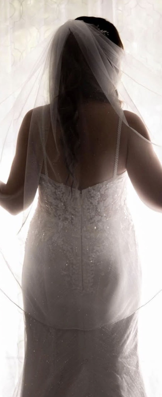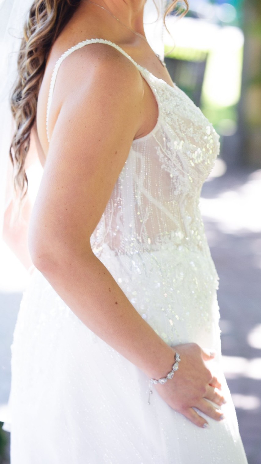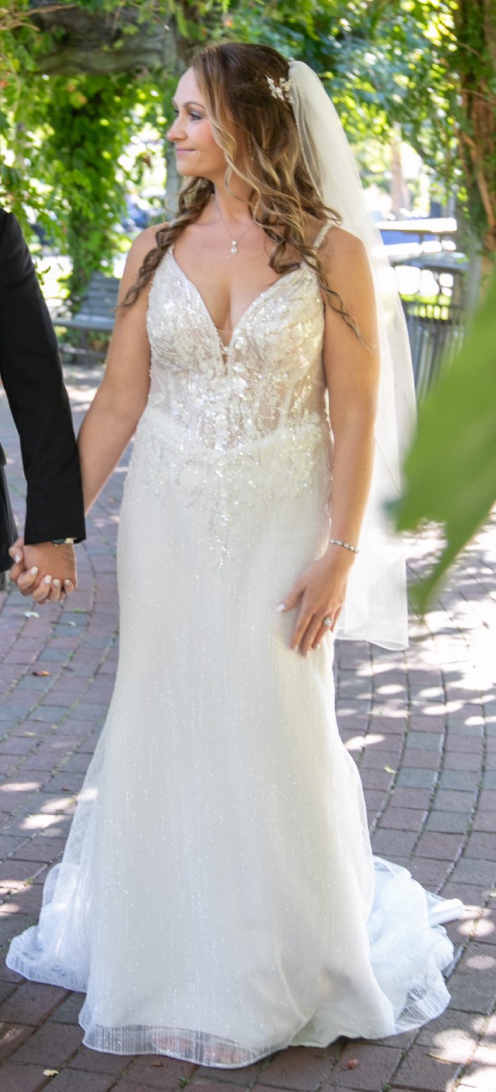 Floor-length design and has a train that is long enough to make your day special but not so long it makes your dress too heavy. The intricate beading, sequins, and glitter on the tulle layover catch the light with every movement. This is about a size 8, but was custom designed. Has a 3 button bustle but one button fell off. Closes via zipper and has a top clasp.