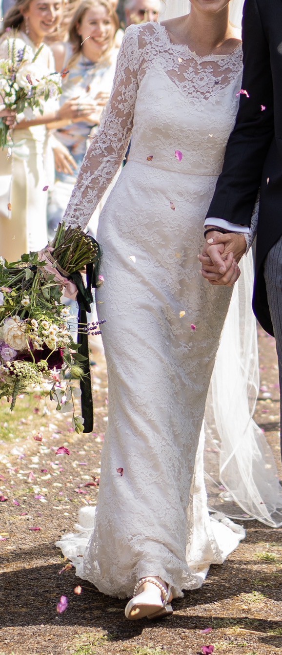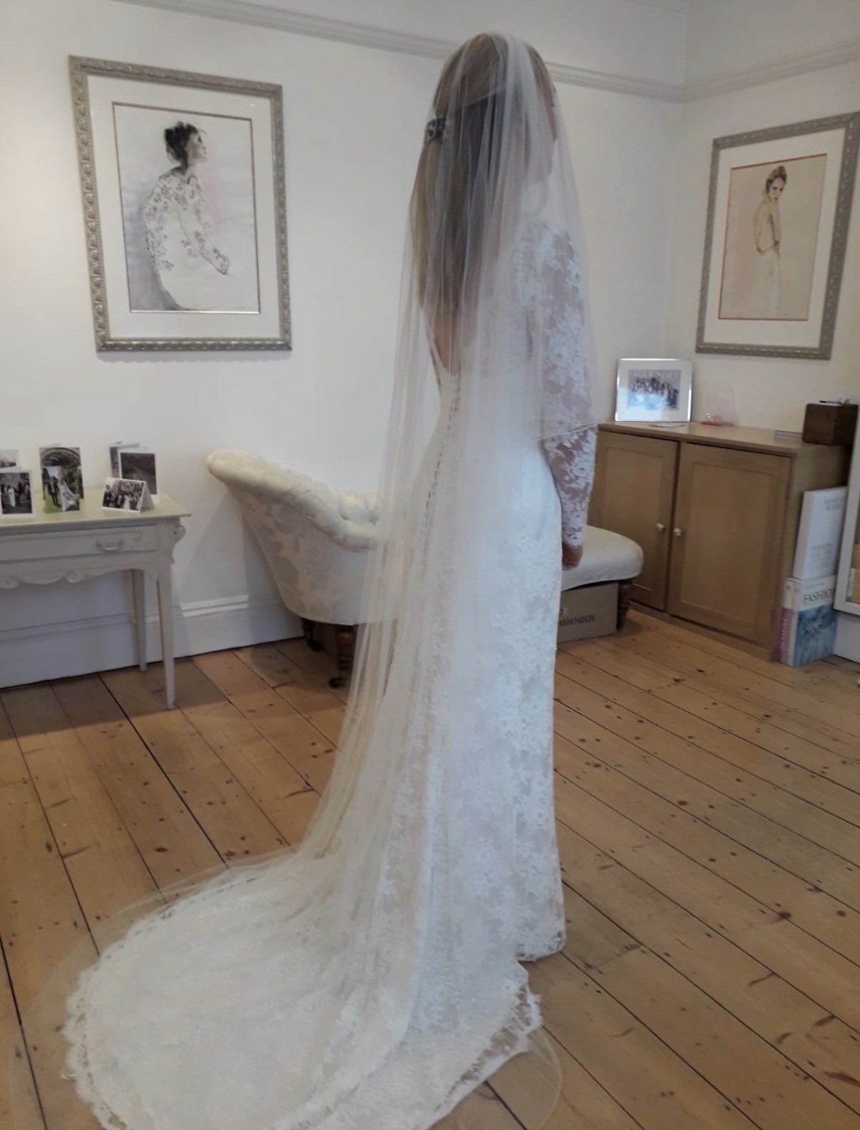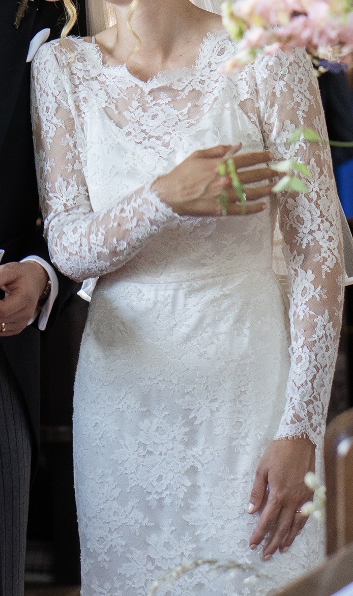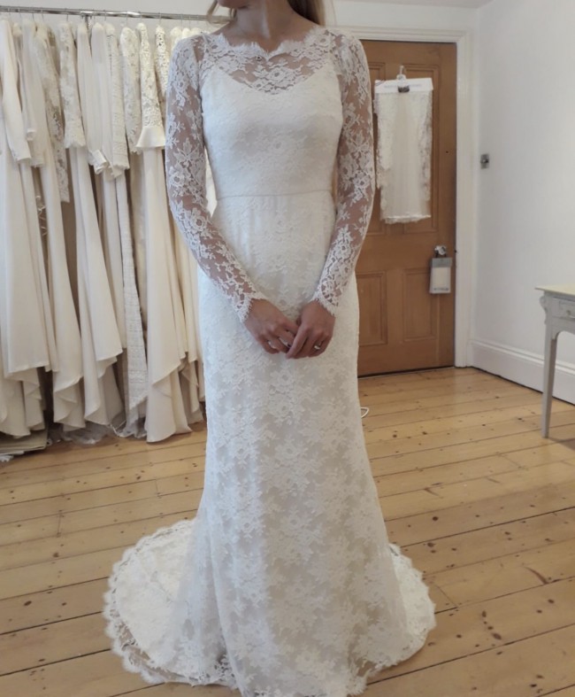 I am selling my stunning Honeysuckle wedding dress so another bride can enjoy it. The gown is light, elegant, and timeless, crafted entirely from delicate Chantilly lace. It features long lace sleeves, a sheer lace back, and a beautiful sweeping train that flows effortlessly behind.