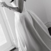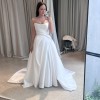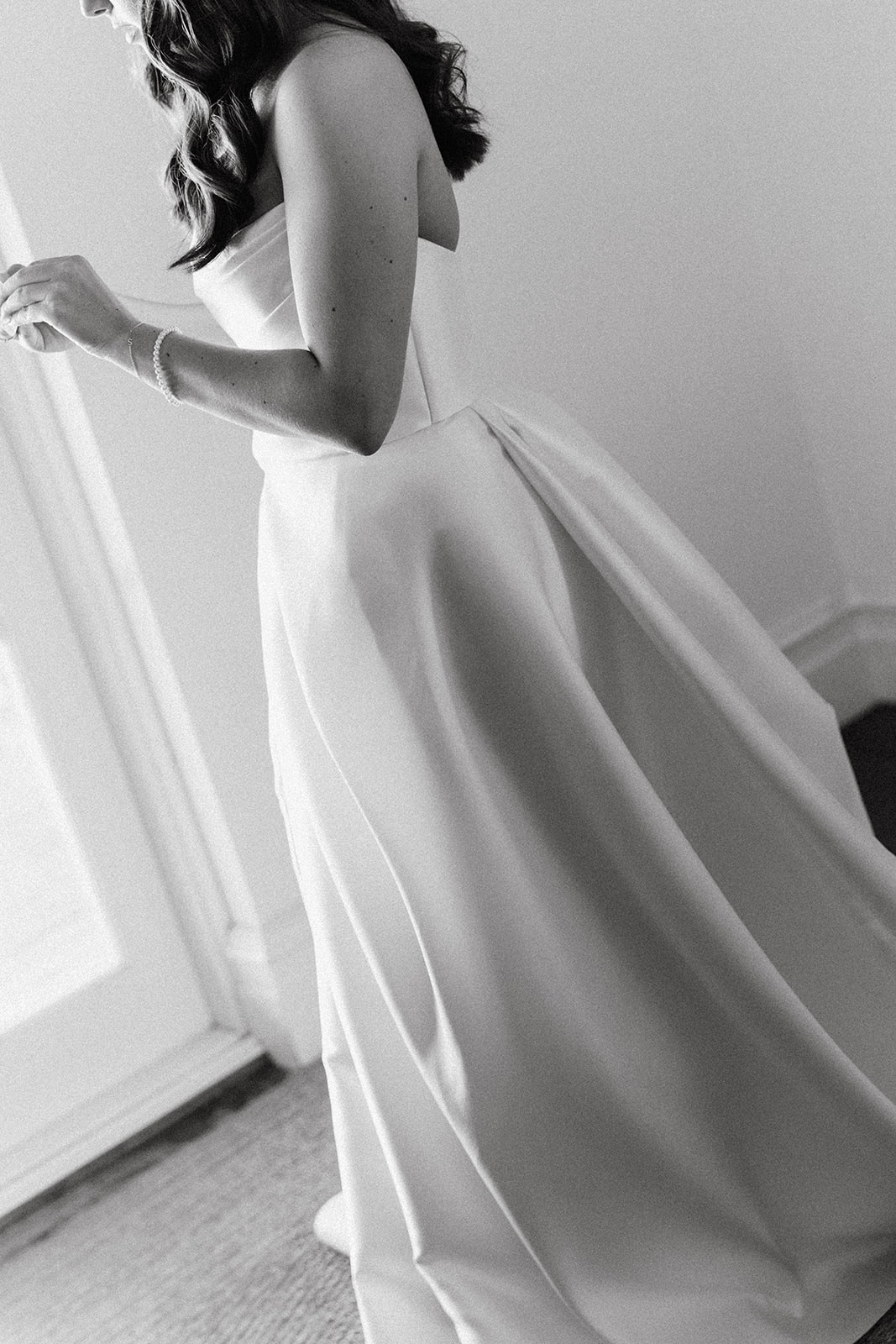 Strapless wedding dress with finely draped bodice, scooped neckline, and layered petal skirt with split.