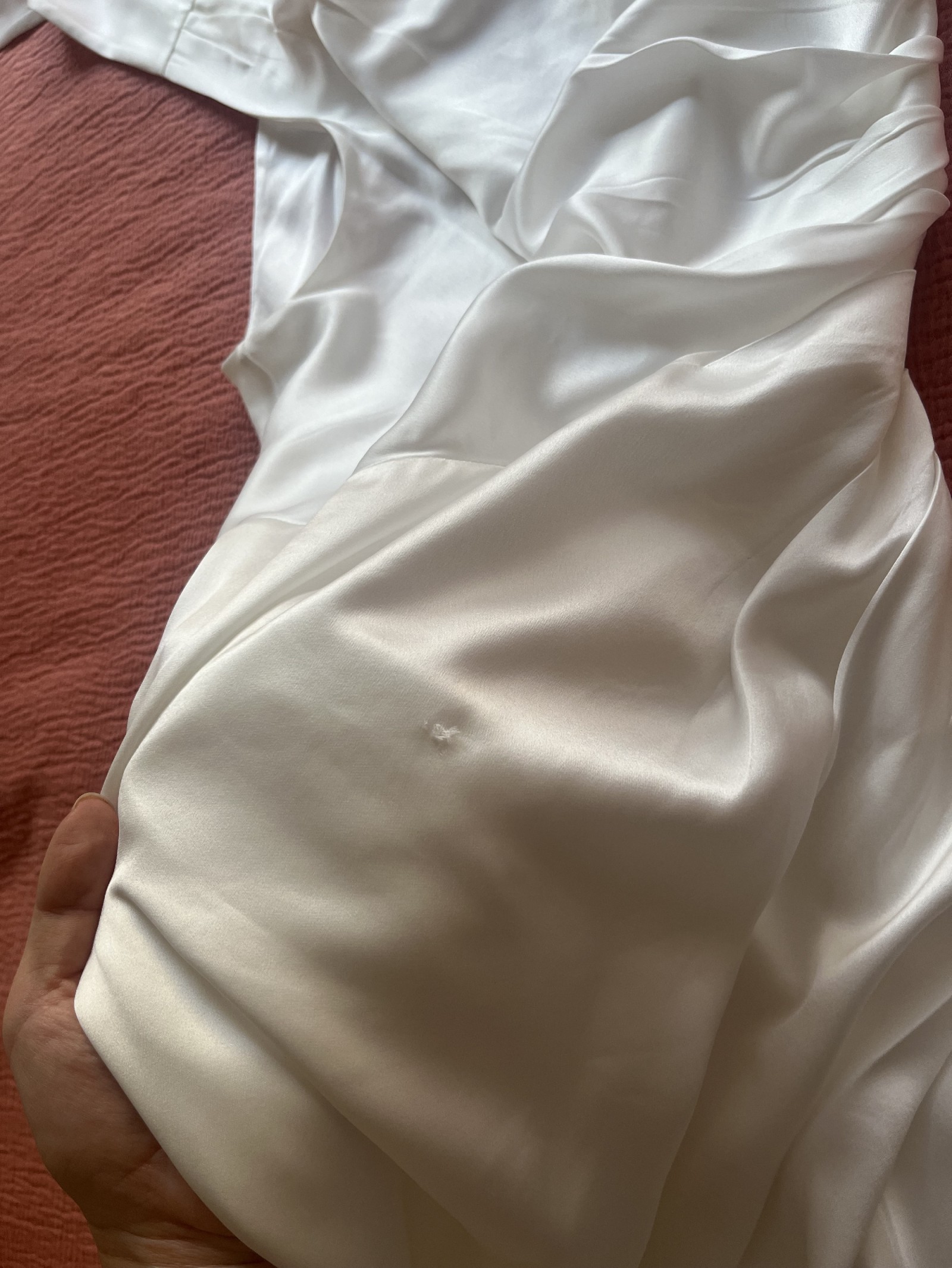 - There is a pulled thread on the torso, as pictured. I don't recall this happening unfortunately, I think someone's purse may have tugged on the material when they hugged me. It is subtle and I've included two photos so you can see clearly. This could also be repaired with care.