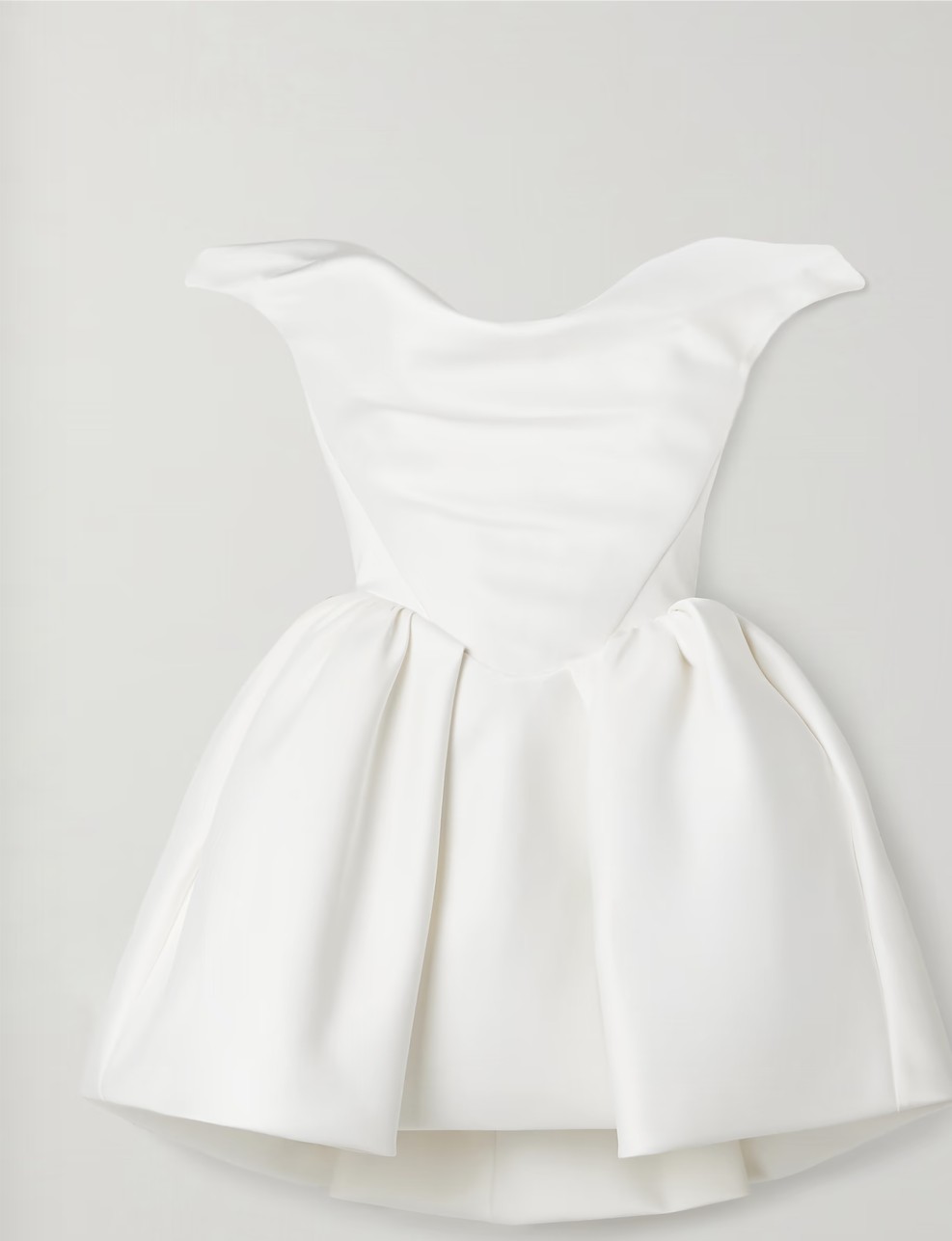 Vivienne Westwood often looks to the archives for inspiration - for instance, this mini version of the 'Bagatelle' dress is inspired by one from the Spring '97 collection. A romantic choice for your reception or bridal shower, it's been handmade in England from duchesse silk-satin and has a structured, corset-style bodice with a draped off-the-shoulder neckline and voluminous pleated skirt.