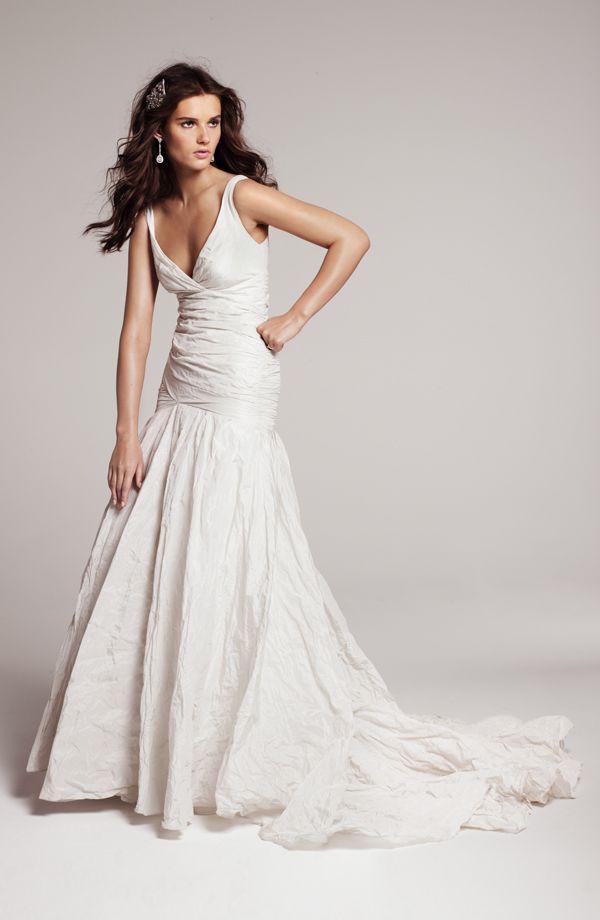 Delicately textured and ruched taffeta shapes the chic, drop-waist bodice and lush trumpet skirt of a metallic, V-neck gown featuring a dramatic train for a decadent finish.