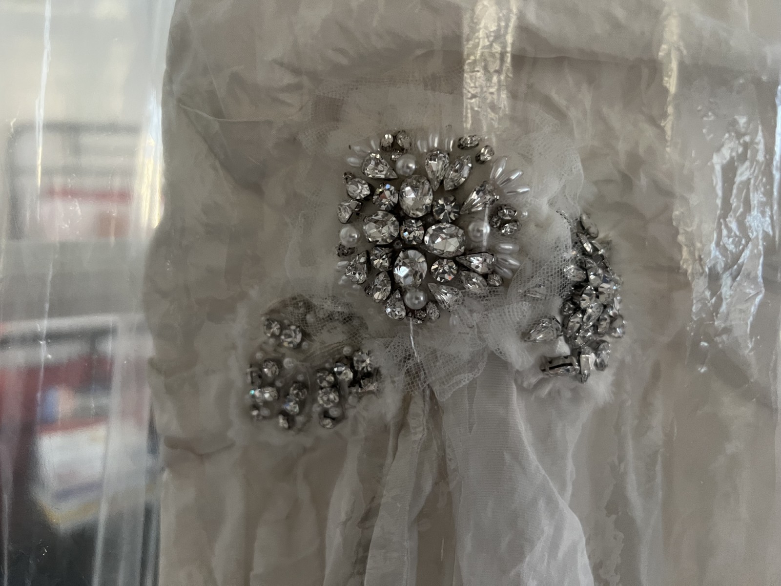 I am 5’2” and was 114 pounds when I wore this dress. I paid $1600 new, and am offering it for $800. I spent $250 to have it professionally cleaned. The rhinestone appliqués were added by me and can be removed if desired. If you would like to try it on before buying, you are welcome to!