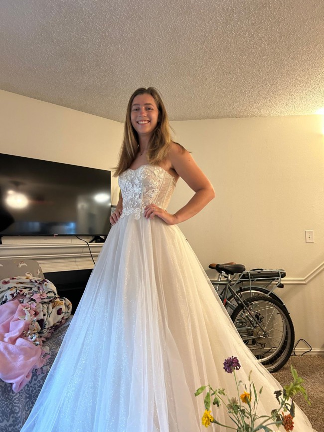 Brand new Dress is in size 8 and never was altered. Has all the labels attached.