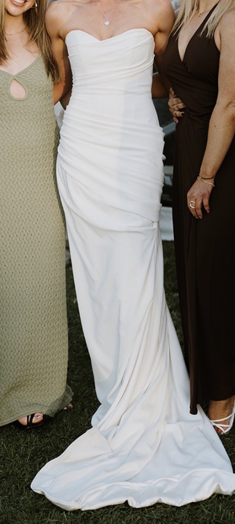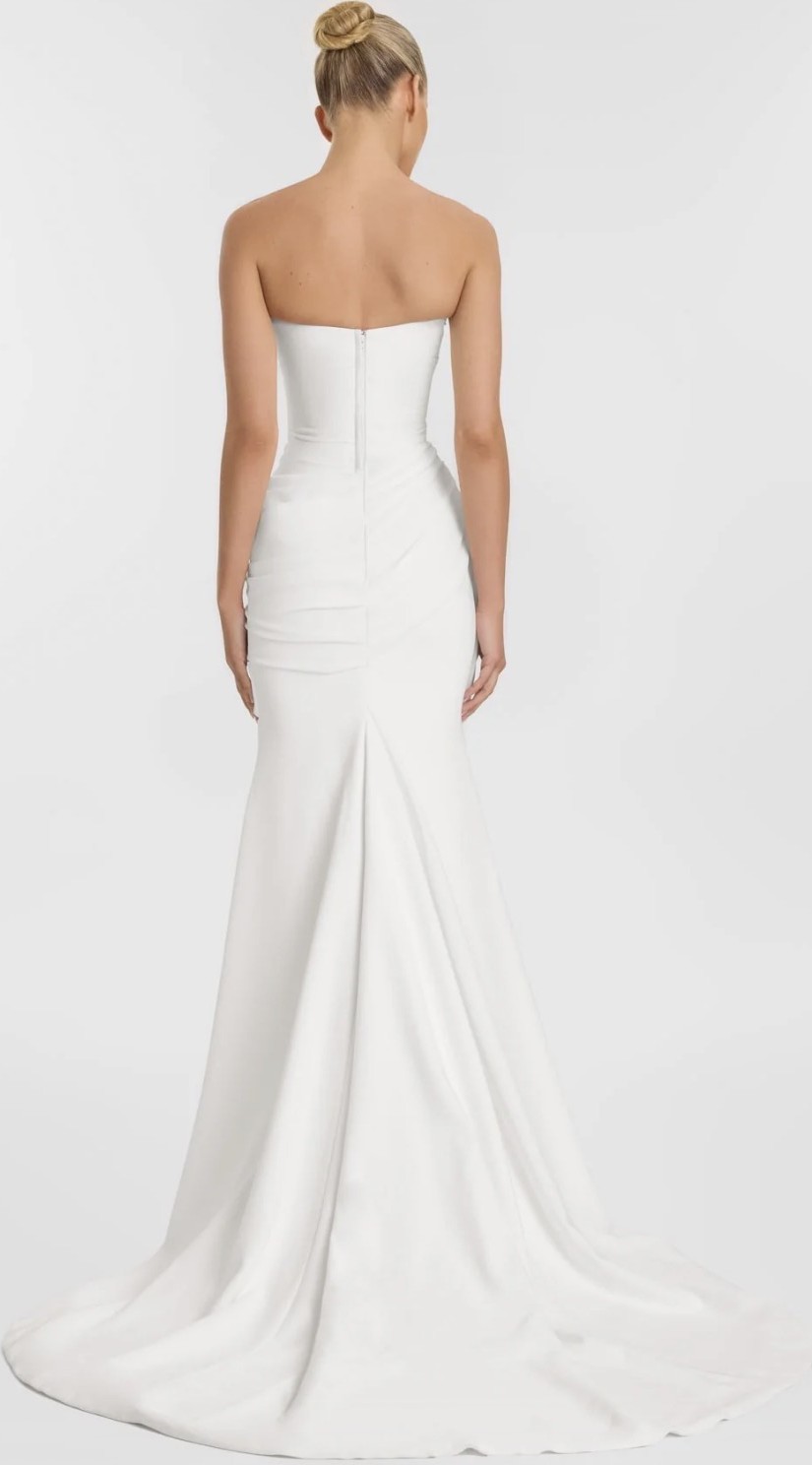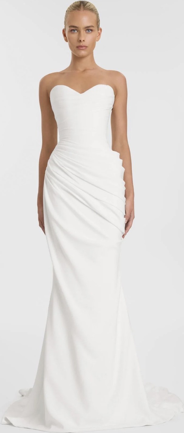Sunday best becomes your lifetime best, with Sunday, a study in the art of draping. A true celebration of the female form, Sunday's structured bodice and fresh sweetheart neckline cuts an hourglass figure. A luxe, heavy crepe is directionally and effortlessly draped across the body to create a statuesque, shapely silhouette for instant screen siren energy. I am 176cm and was wearing 2cm heels. Professionally dry cleaned
