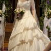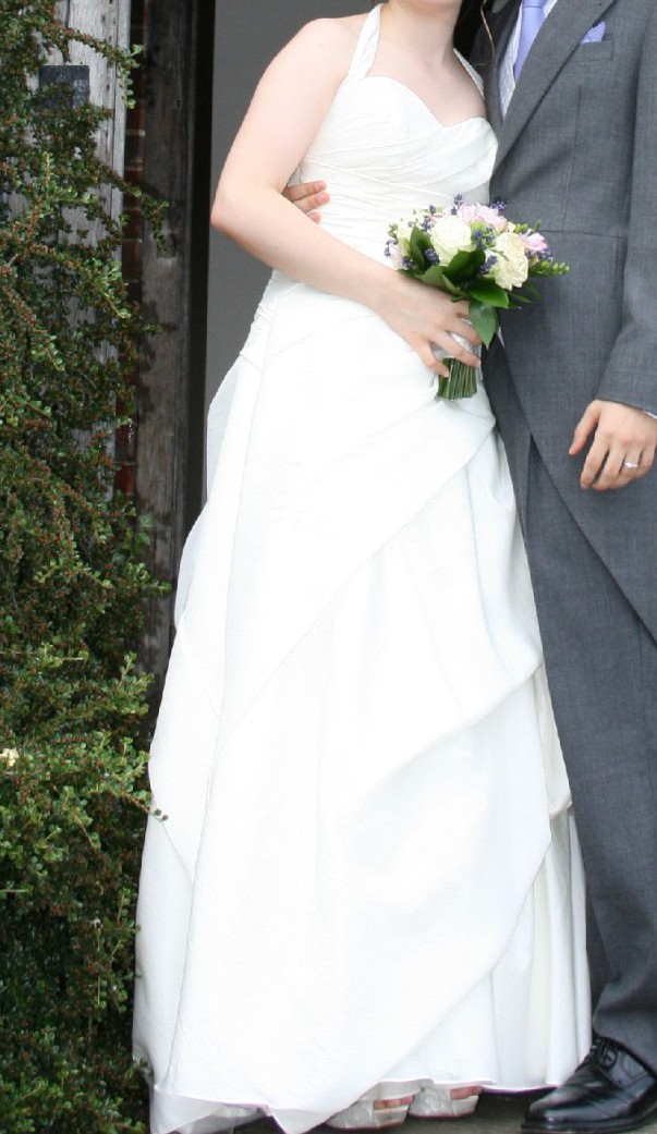 It has an elegant sweetheart neckline with halterneck straps and a wrap pattern on the bodice. It is floor length and has a little train, with layers of ruffles down one side.