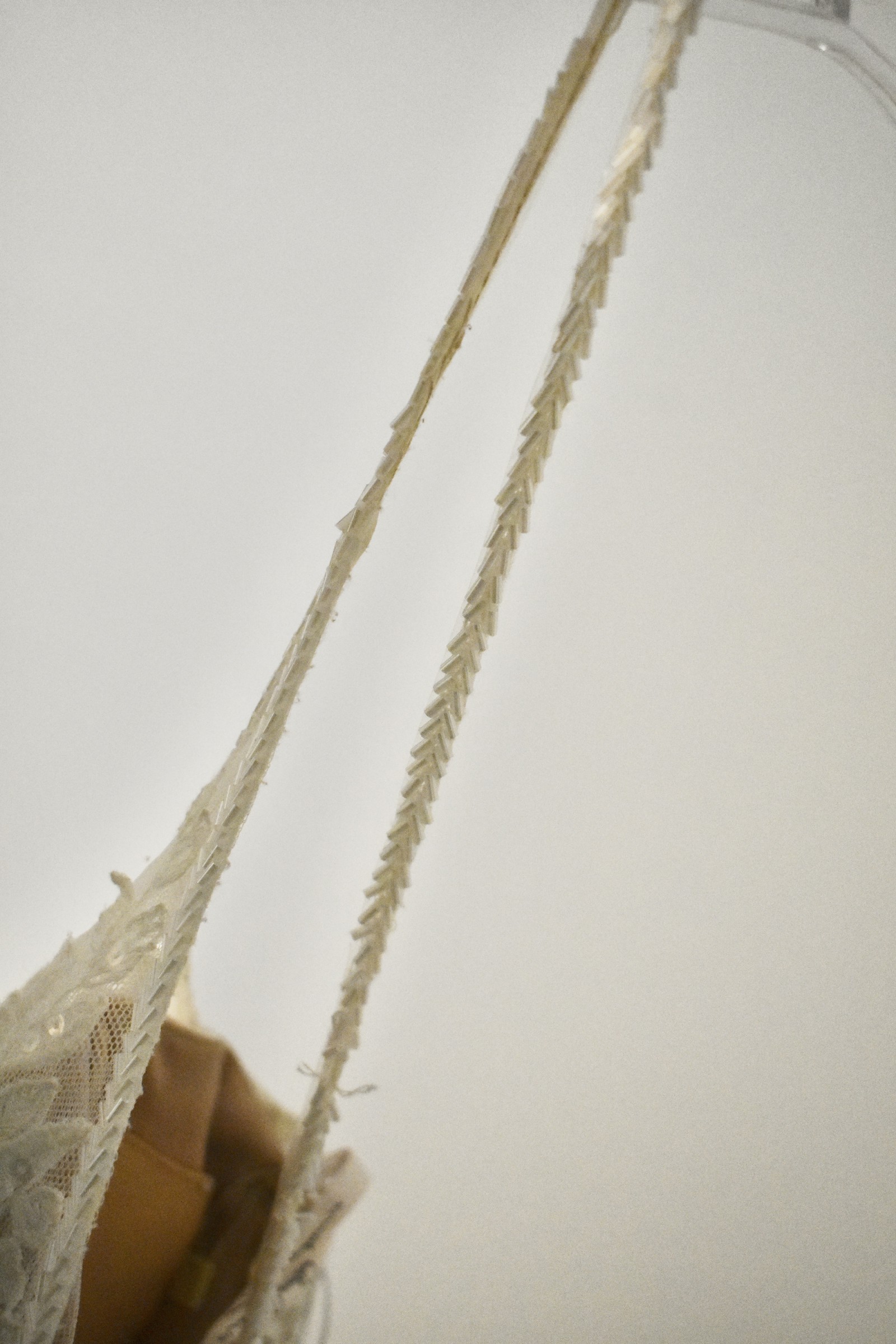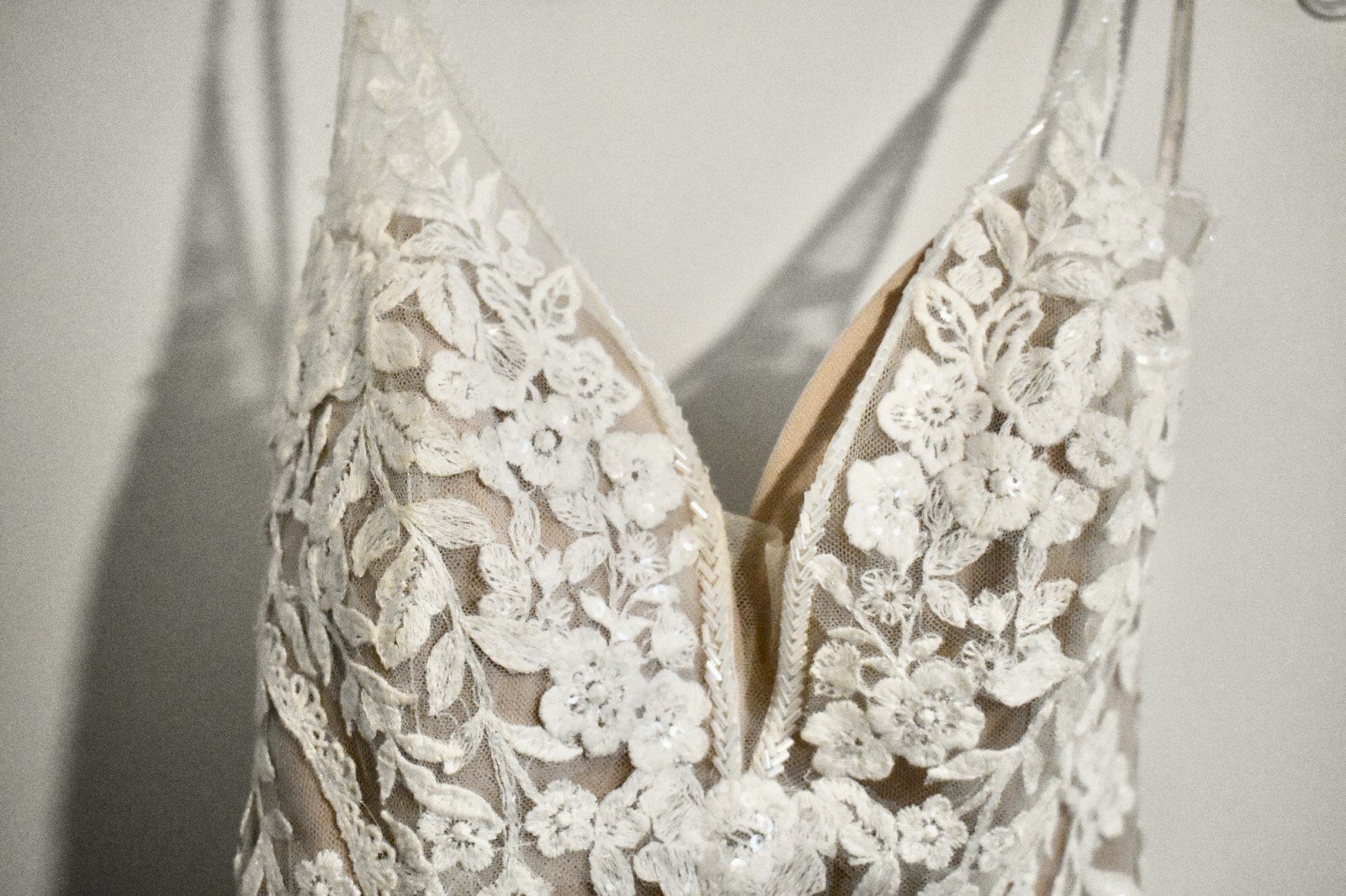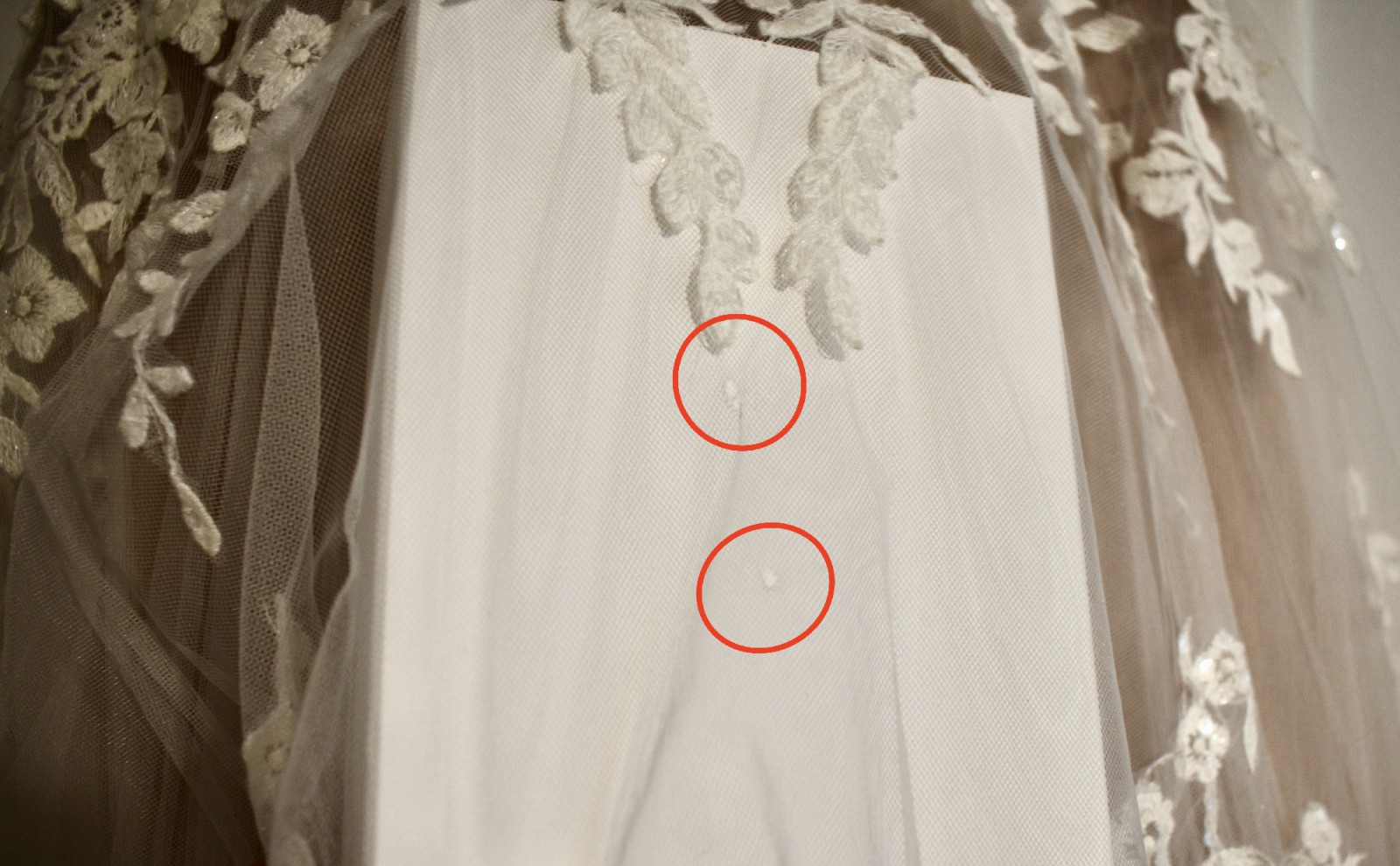 -The Tulle: There are two small holes in the outer tulle layer. Due to the generous amount of fabric and the intricate lace pattern, these are very inconspicuous when the dress is worn. Last picture shows the two holes from the front section of the dress.