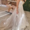 Dainty floral appliques decorate the bodice and water fall into the flouncy tulle skirt. Rebecca Ingram Lettie features a deep illusion v-neckline and beaded spaghetti straps. Beading outlines the neckline, goes under the arm and outlines the scoop illusion back. This dress features a tiered tulle skirt with horsehair trimming helping create the romantic layers .