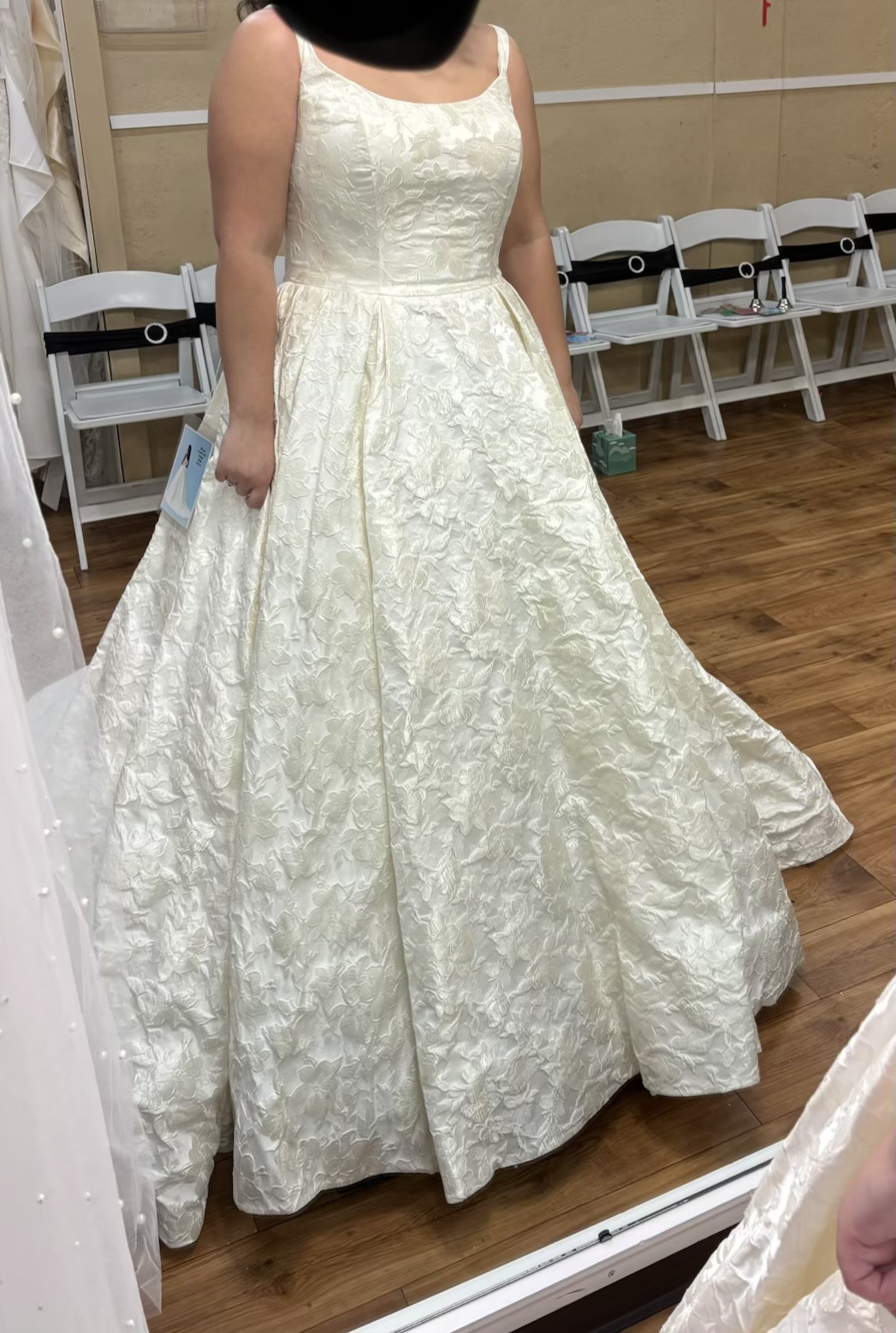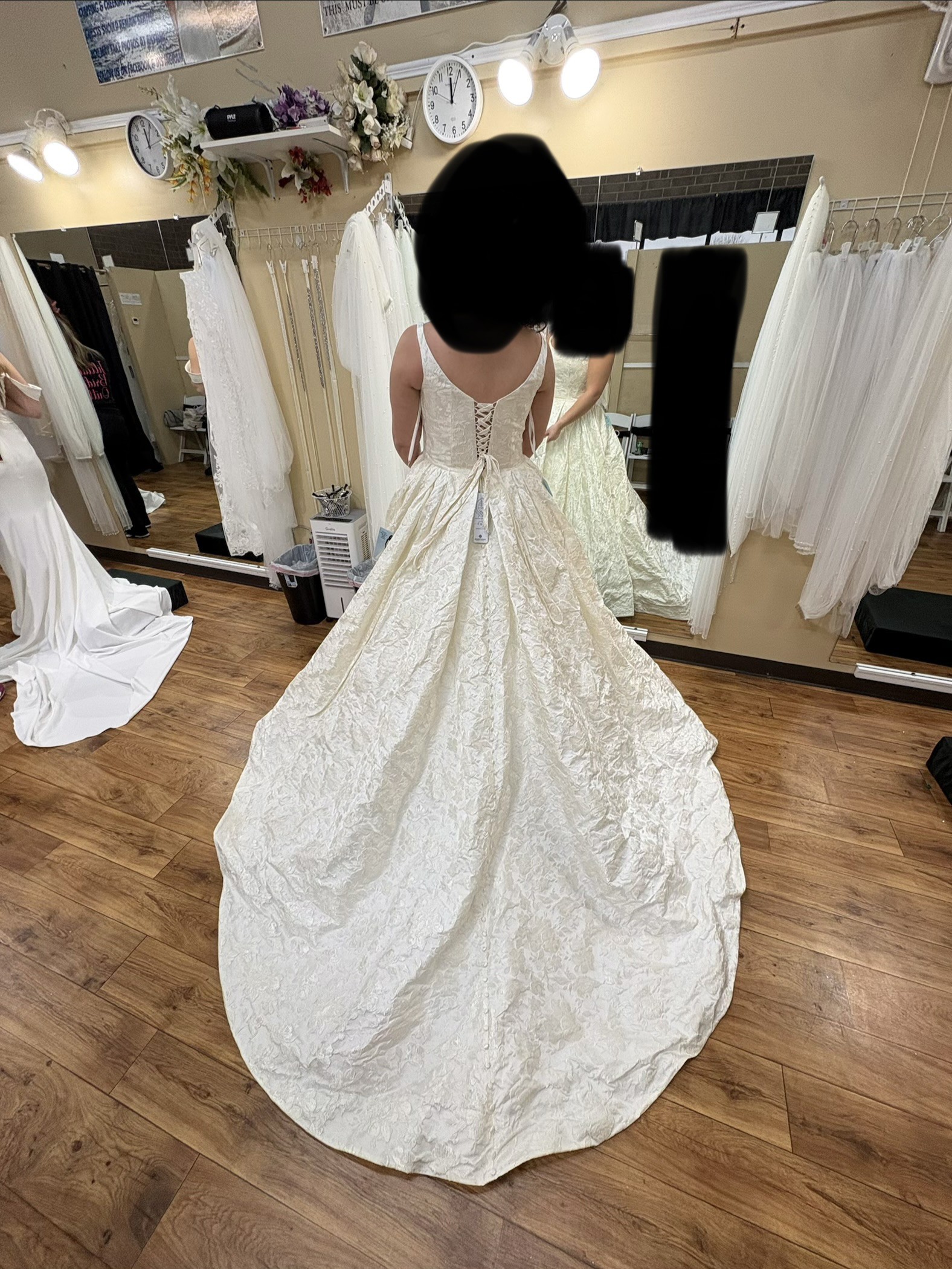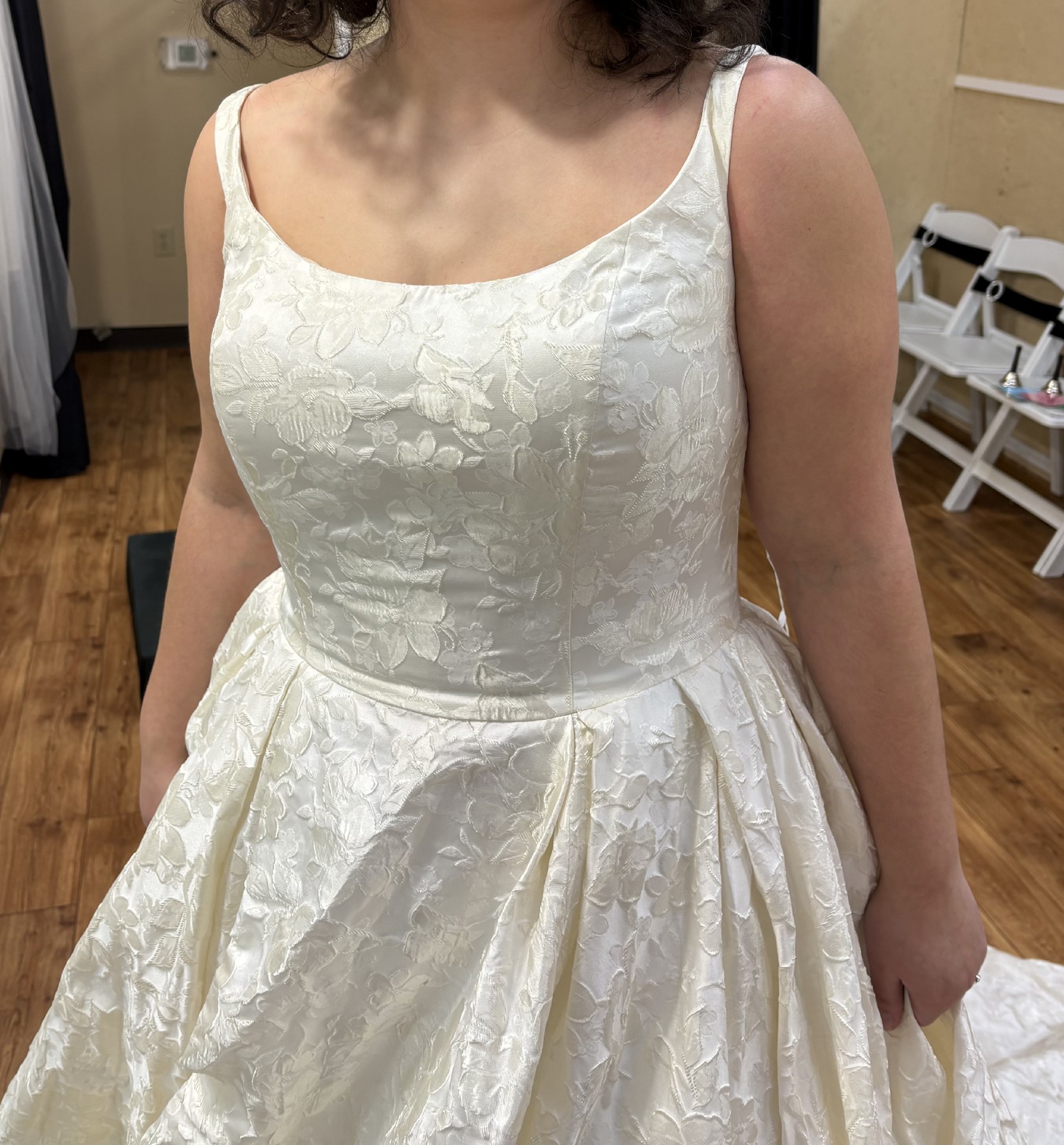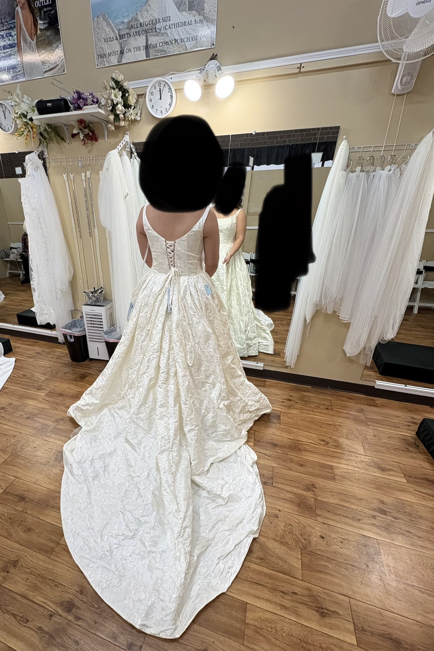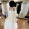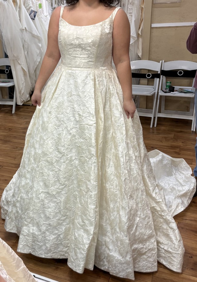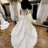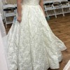 Allure Bridals’ Disney Fairy Tale Belle Gown, features a beautiful corset back with a floral brocade. This dress also has an incredible train with buttons all the way down.