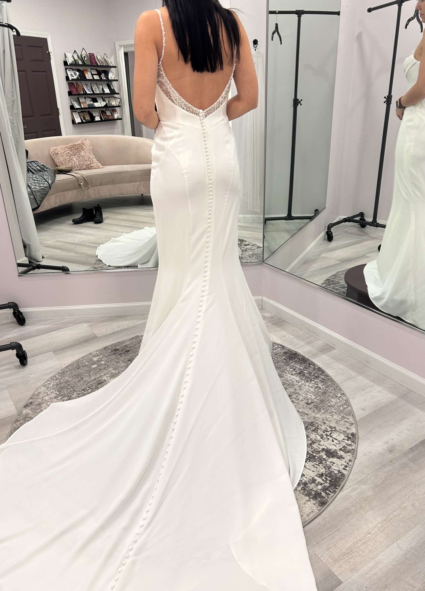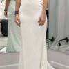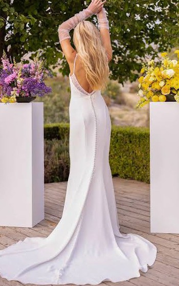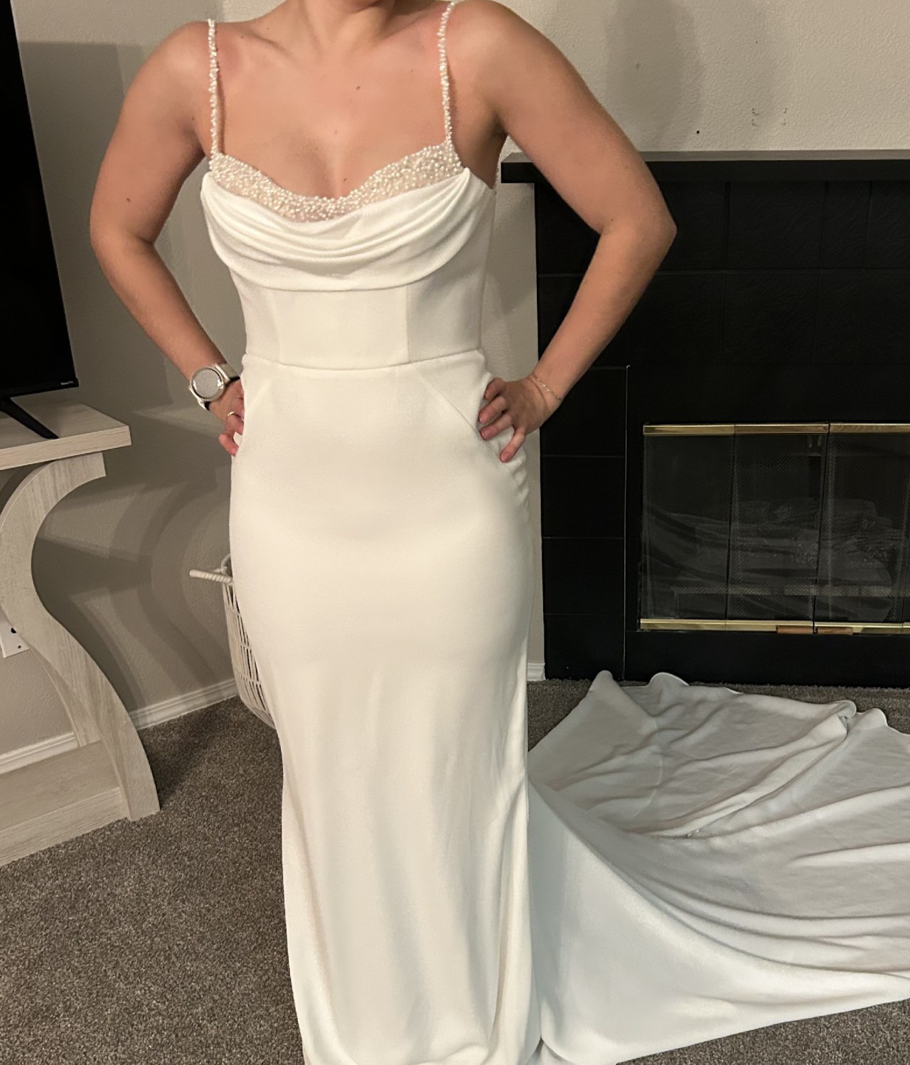 Beautiful column sheath dress with pearl beading on the neckline and spaghetti straps. Buttons on train, polyester fabric, very comfortable and easy to walk in. Lightweight, perfect for a summer wedding! I usually wear a size 6-8 in pants and this only would have needed altered in the bust area.