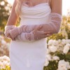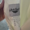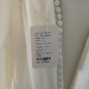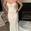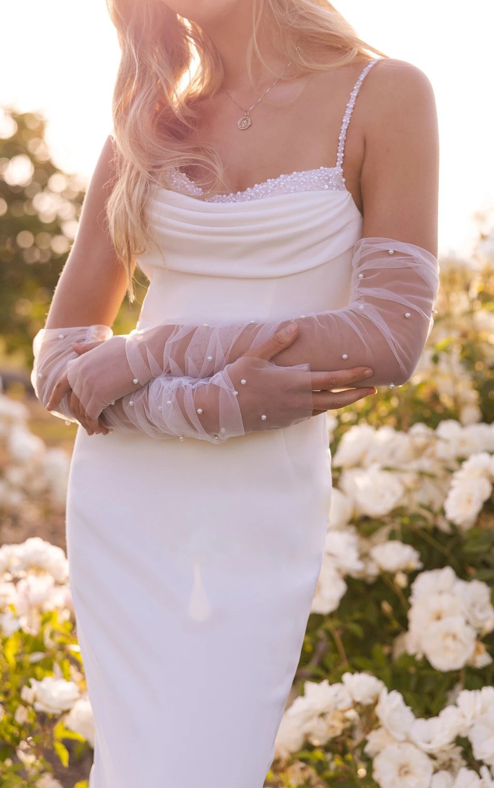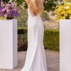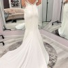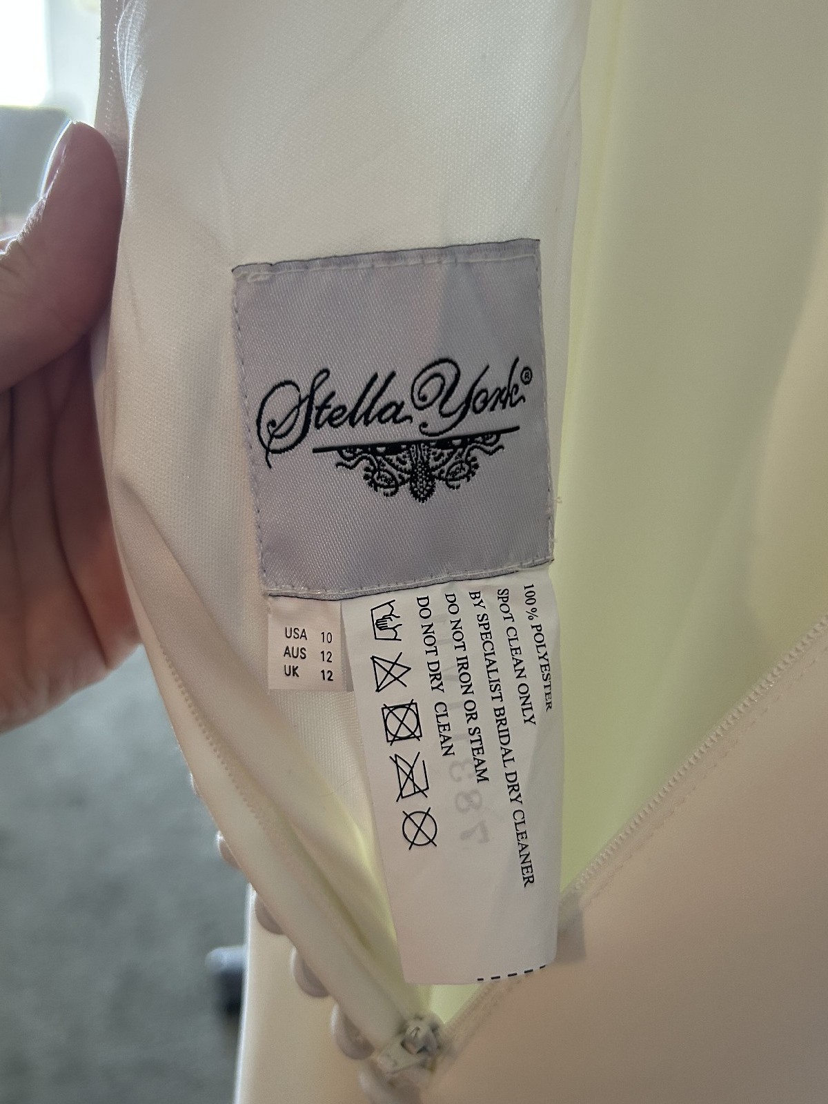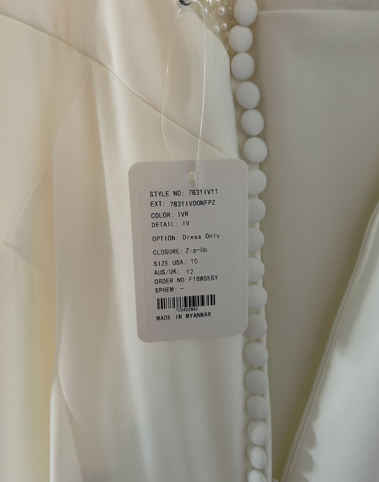 Beautiful column sheath dress with pearl beading on the neckline and spaghetti straps. Buttons on train, polyester fabric, very comfortable and easy to walk in. Lightweight, perfect for a summer wedding! I usually wear a size 6-8 in pants and this only would have needed altered in the bust area.