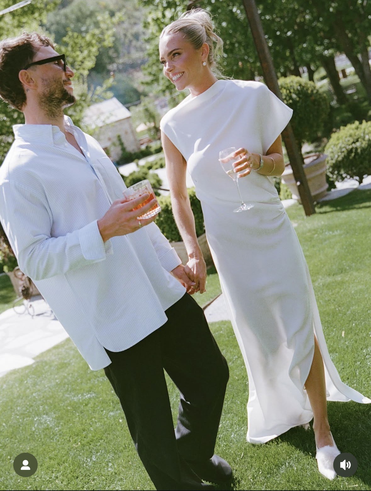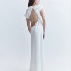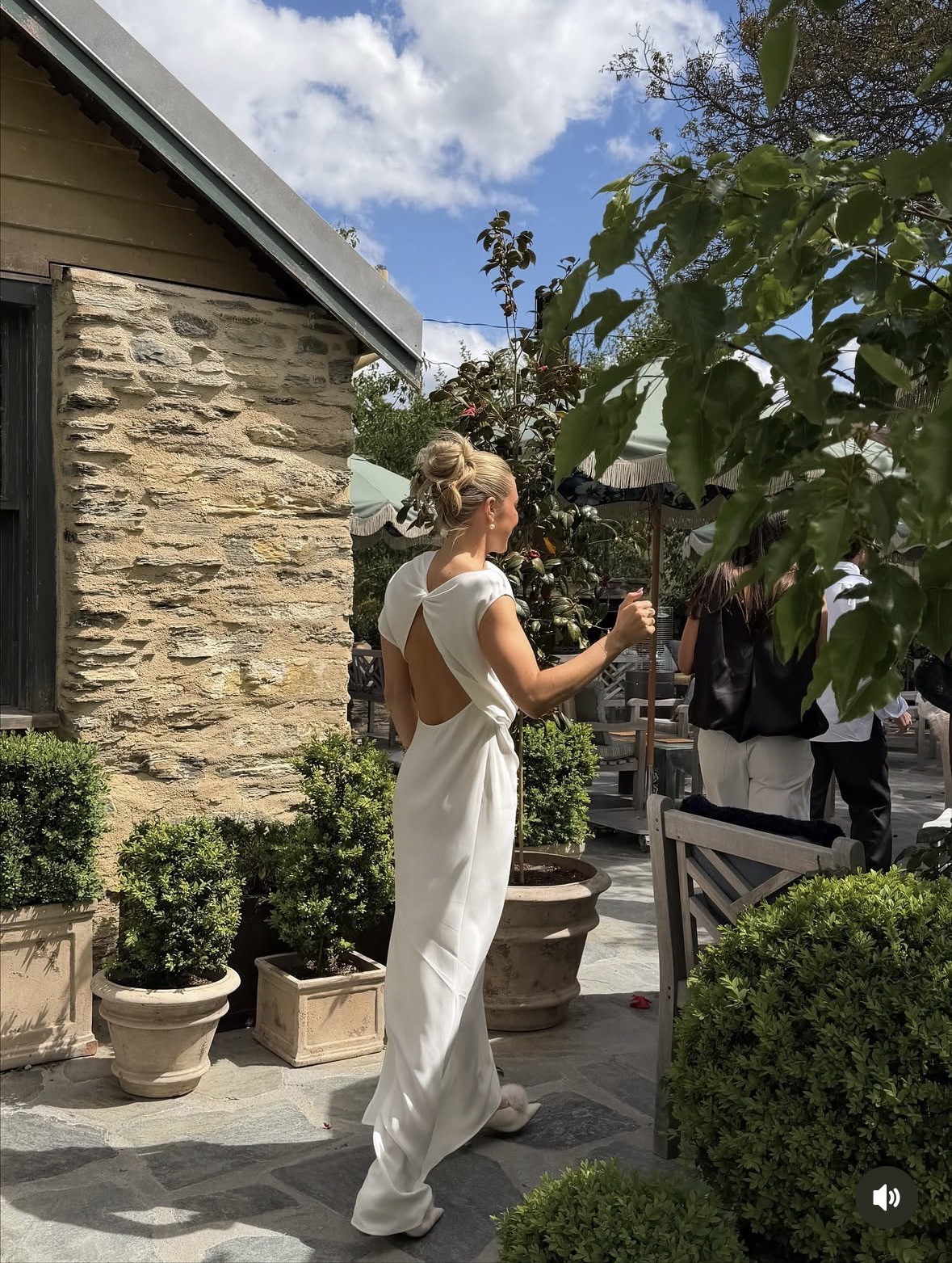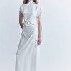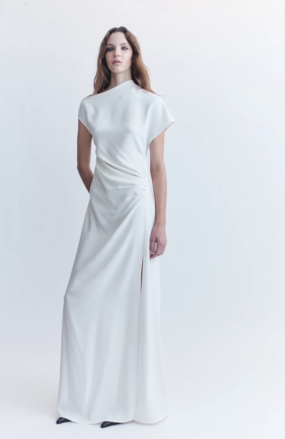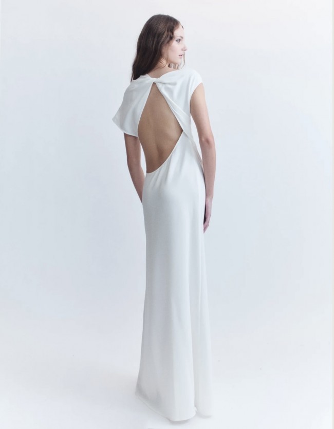 The Elias Gown features an asymmetrical neckline, draped bodice, and open back with a unique twist detail that adds architectural interest.