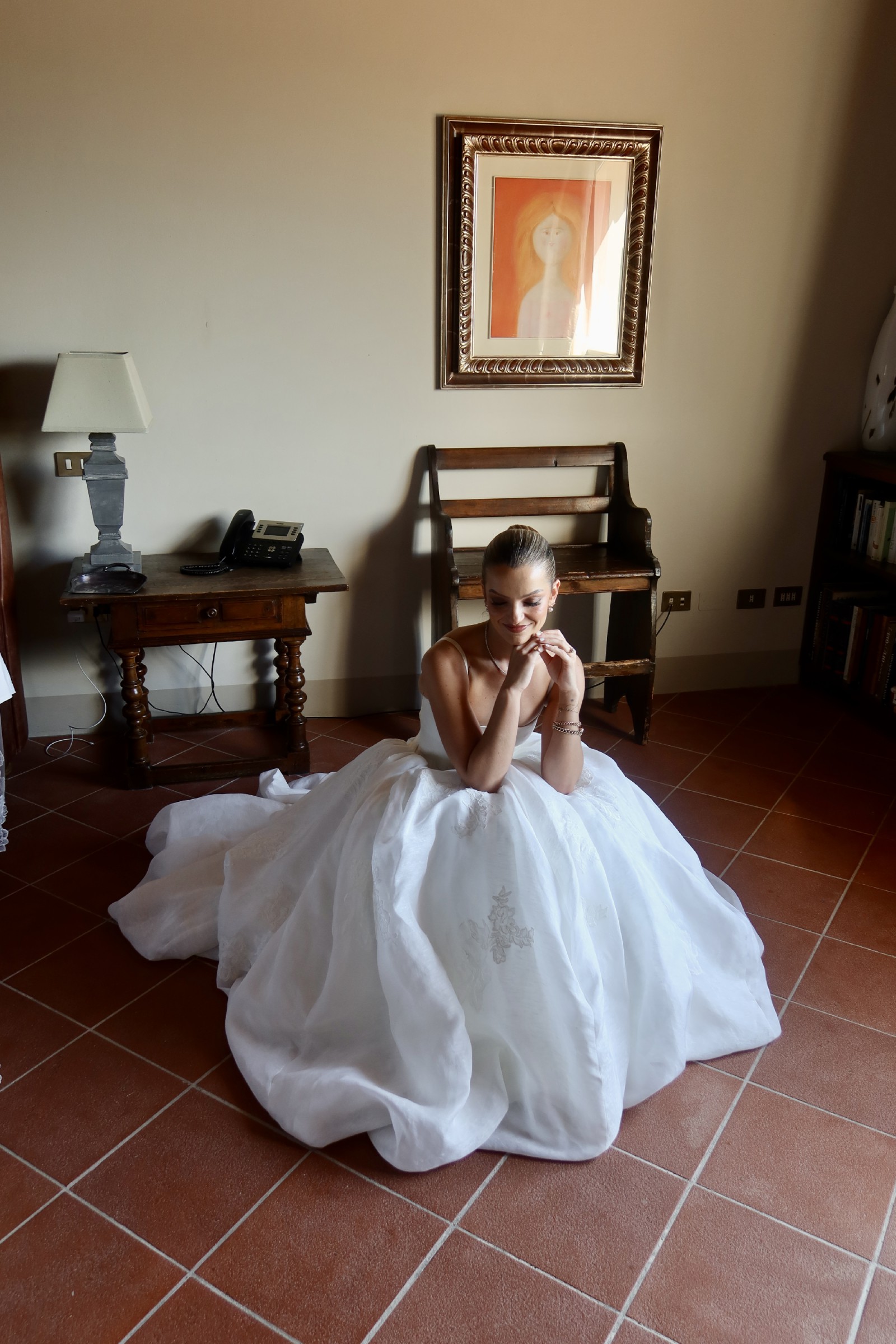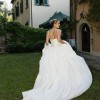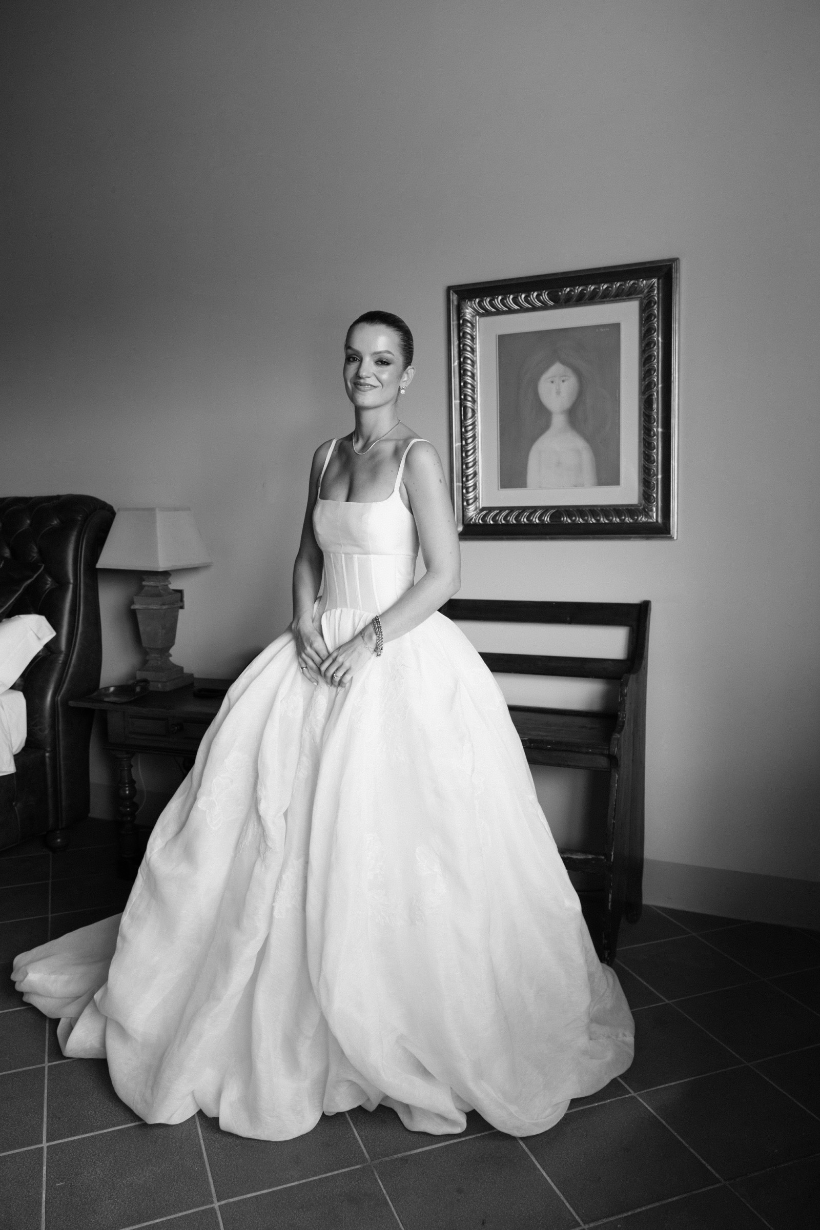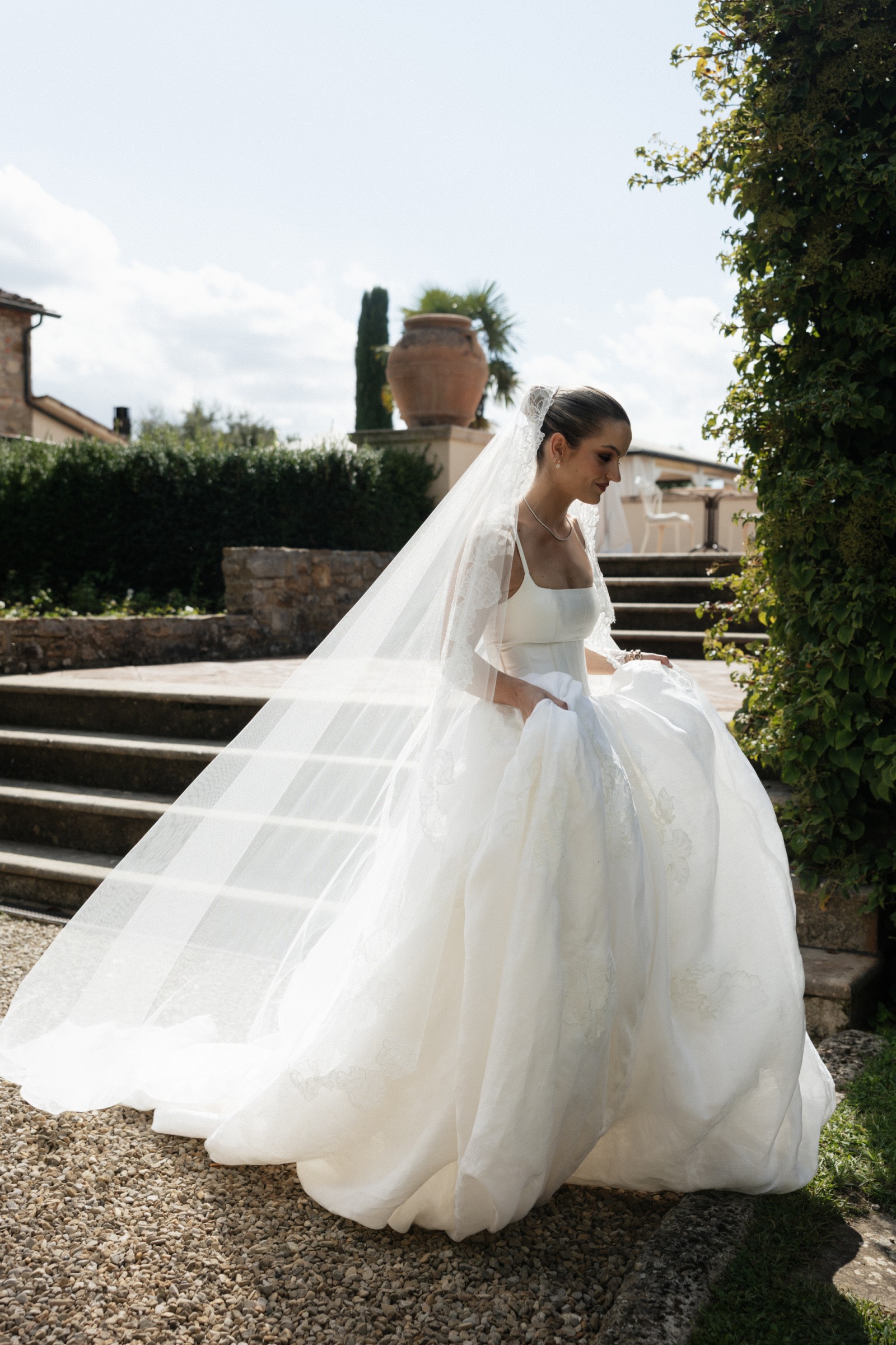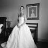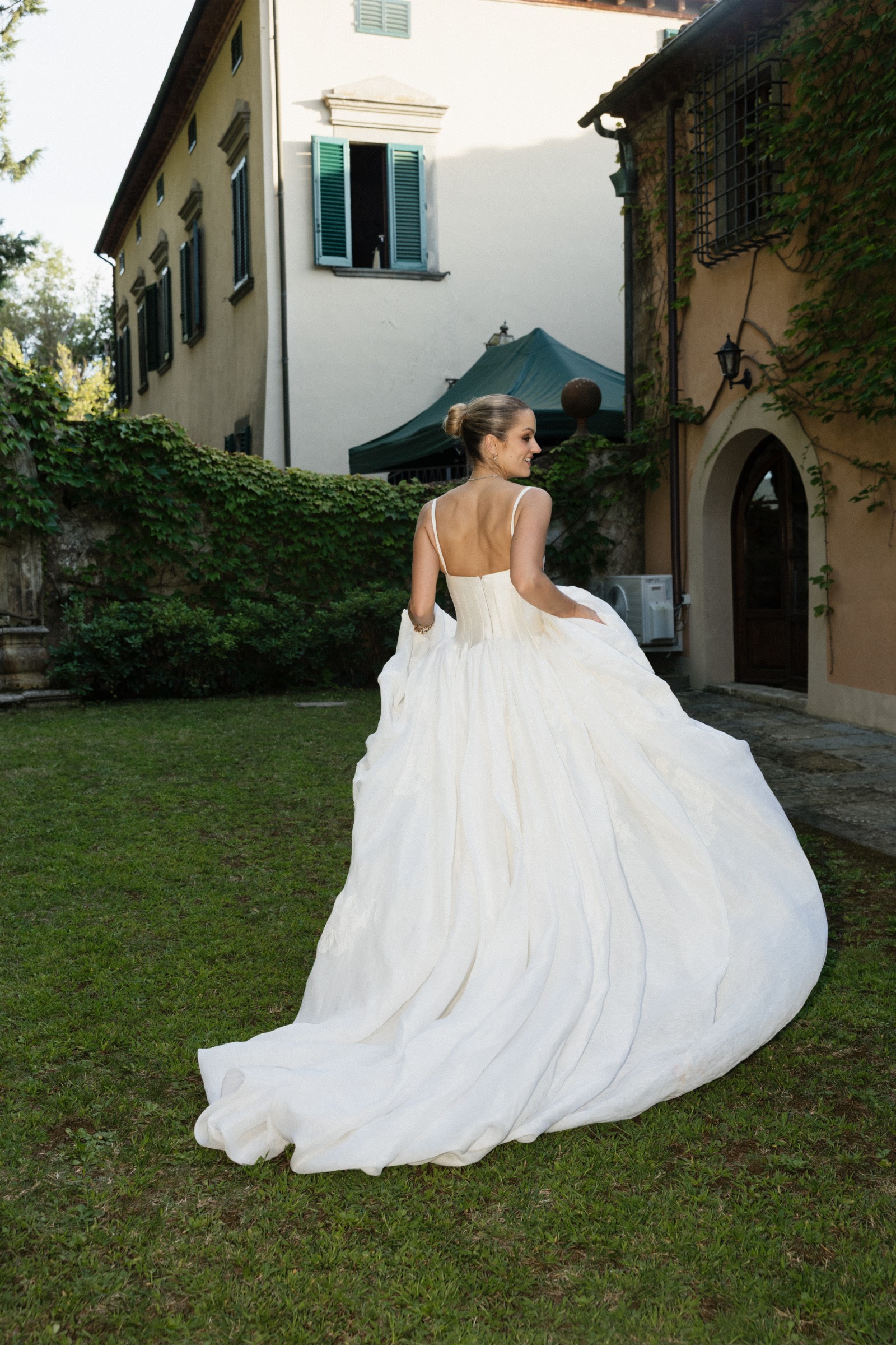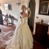 Danielle Frankel Leighton Gown - semi-custom. Silk wool twill square neckline gown with external boning at the bodice. Silk linen organza bubbled skirt with hand cut Lyon, Chantilly, and corded lace applique. Invisible zip closure at centre back. Additional crinoline added to the skirt for the effect of "can can" hips and extra crinoline added to the body of the skirt for a more ball gown effect. Dress has been altered significantly (made around 2 sizes smaller) from its original size.