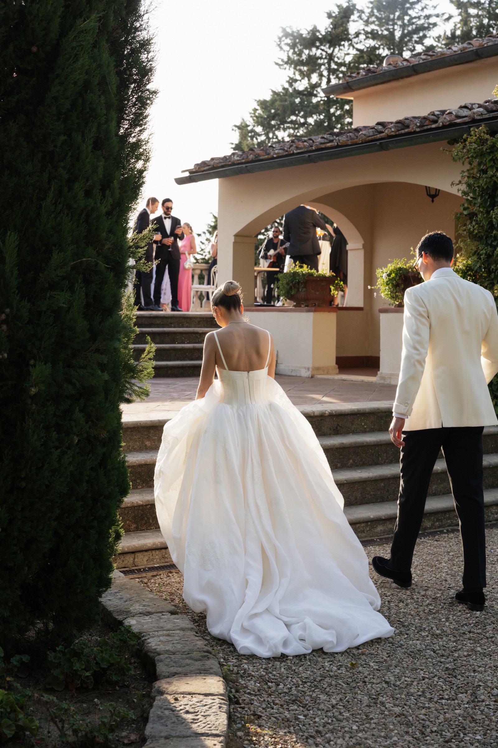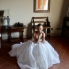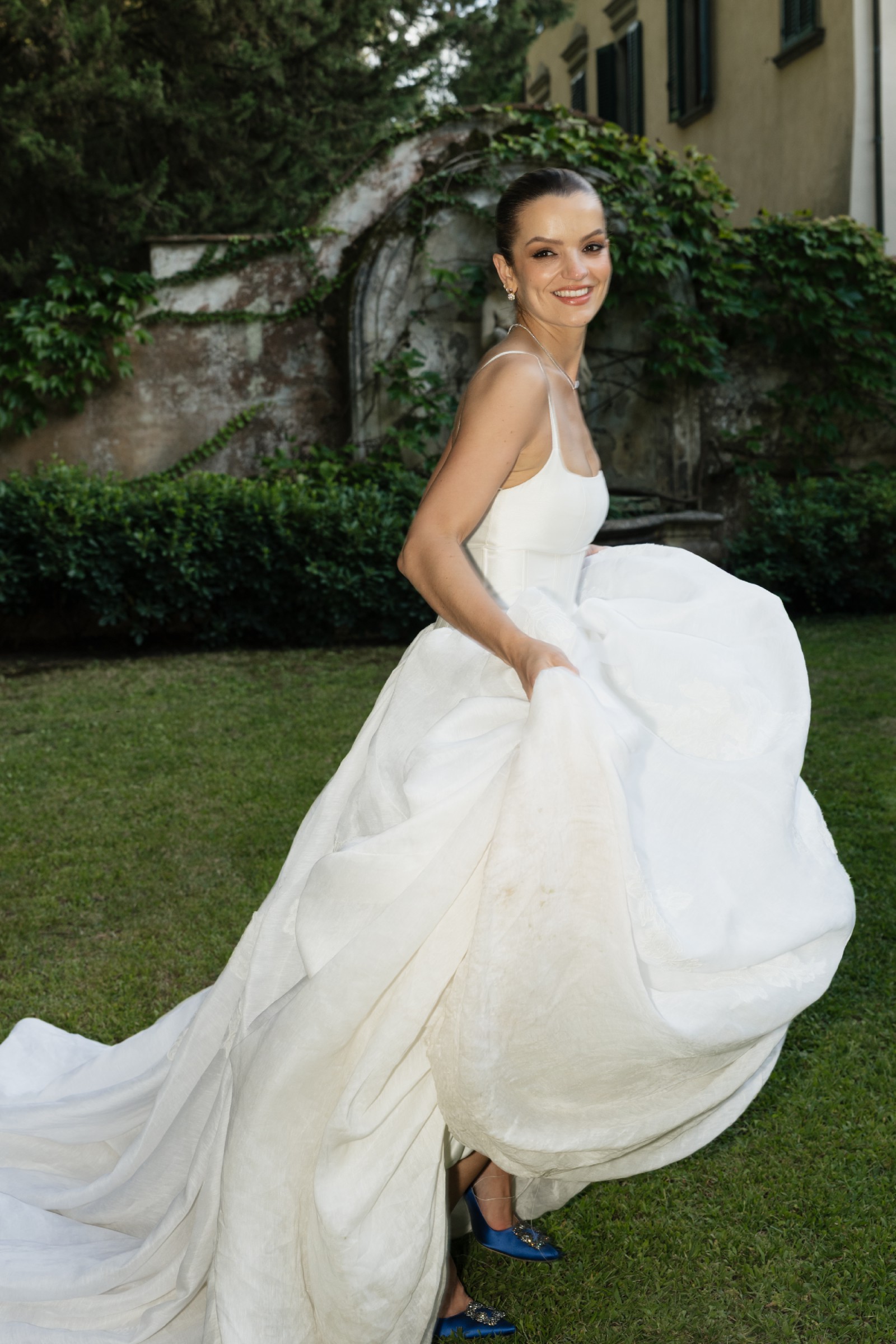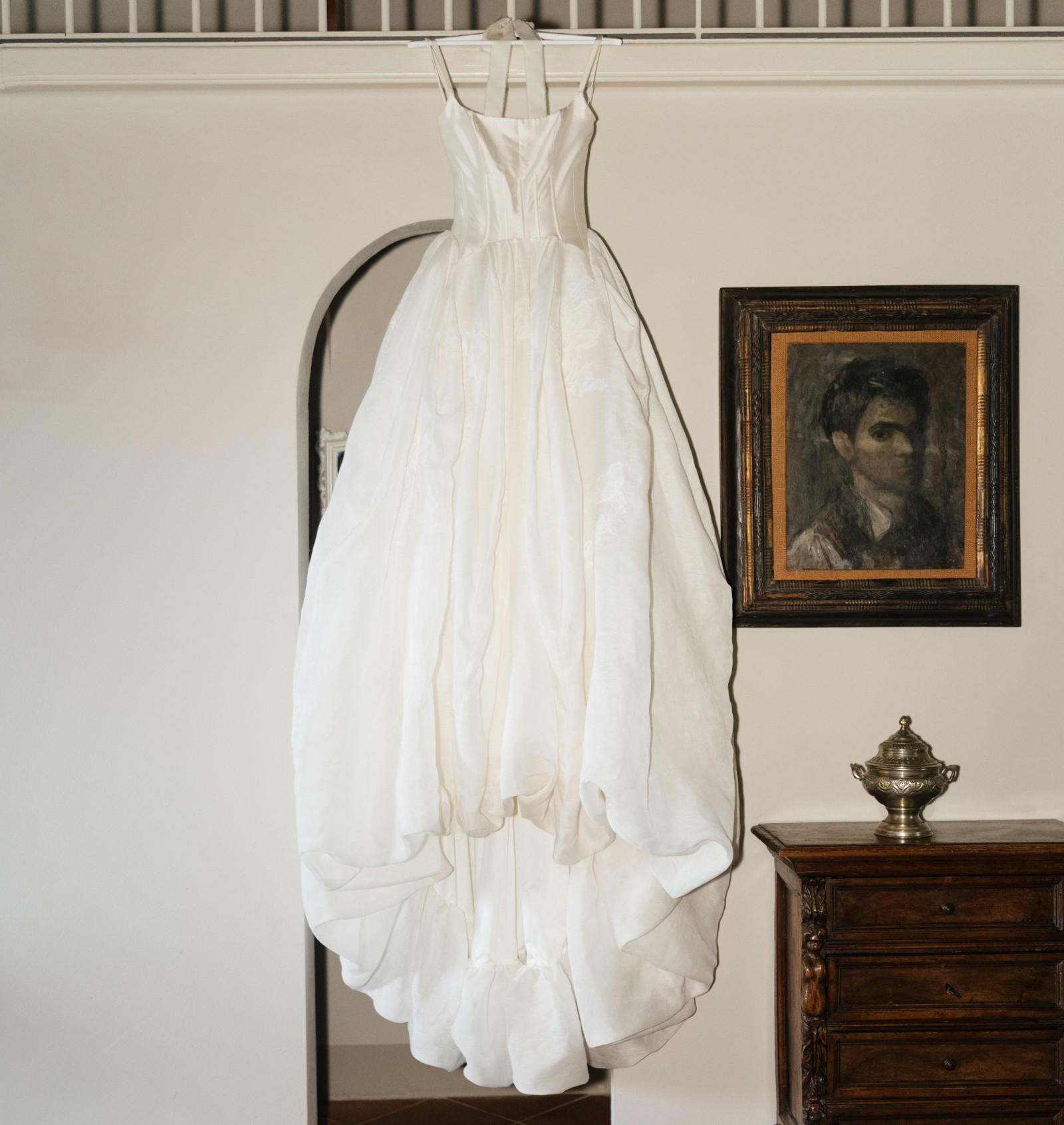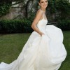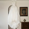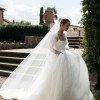 Danielle Frankel Leighton Gown - semi-custom. Silk wool twill square neckline gown with external boning at the bodice. Silk linen organza bubbled skirt with hand cut Lyon, Chantilly, and corded lace applique. Invisible zip closure at centre back. Additional crinoline added to the skirt for the effect of "can can" hips and extra crinoline added to the body of the skirt for a more ball gown effect. Dress has been altered significantly (made around 2 sizes smaller) from its original size.